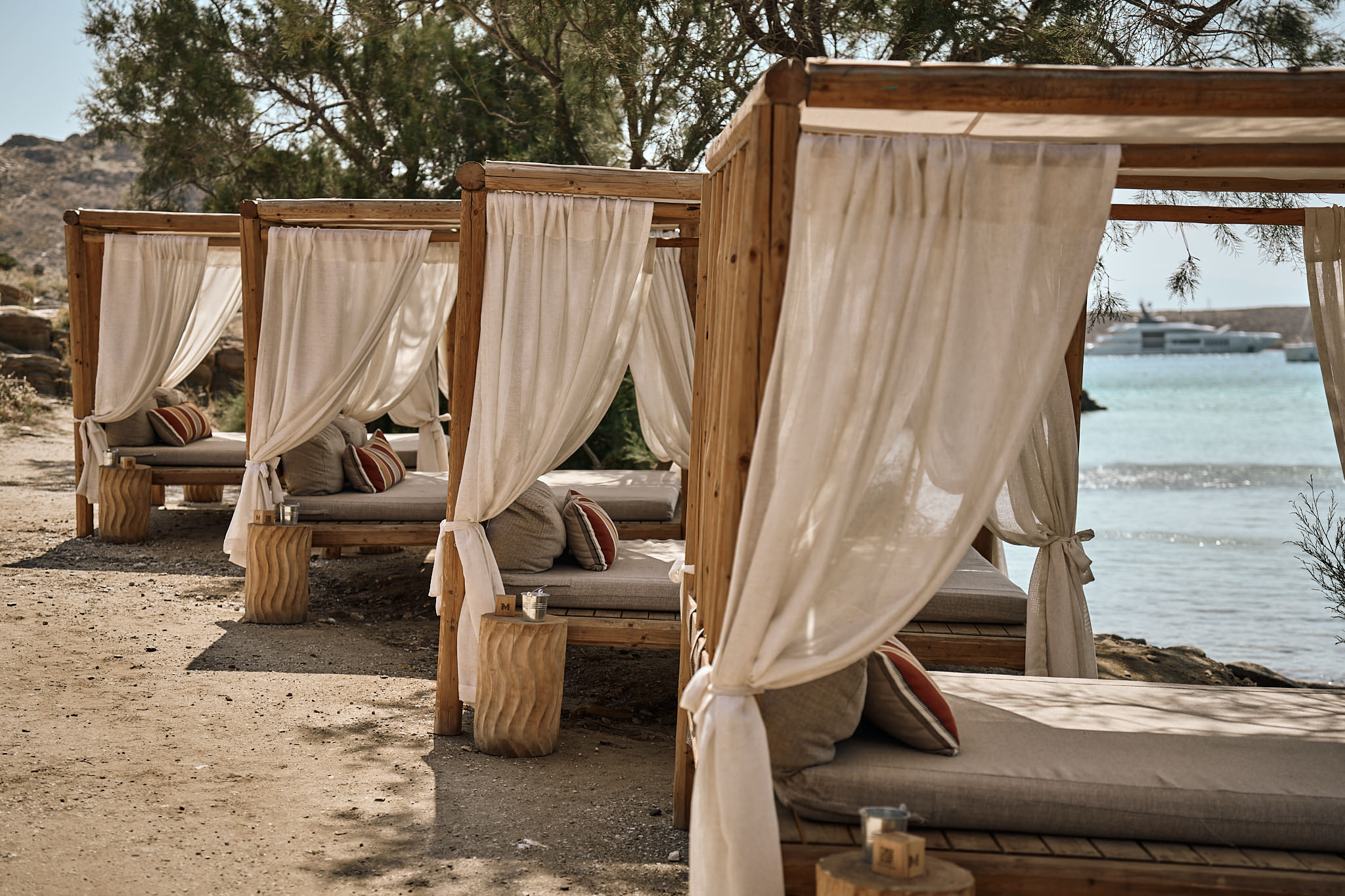 On sun-drenched Cycladic mornings and balmy afternoons, opt between modern and relaxing loungers with soft mattresses and cushions, and cabana beds, for even greater seclusion and tranquillity. Or, for a decidedly bohemian experience, relax in a stylish lounge area with oversized cushions on a wooden deck, with shaded tables and comfortable sofas, savouring a coffee or frosted beer while idly watching the world taking refreshing dips in the turquoise sea.