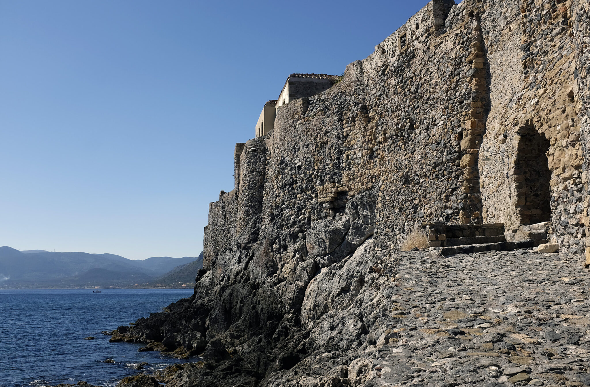 Facing the square with the Cannon, a steep and somewhat challenging winding path ascends toward the Upper Town, which appears to struggle under its weight. Midway along the route, a narrow path veers from the main road and leads to the small, cave-like chapel of the Holy Apostles. This serene, shady spot is shielded from the sun, offering a view of the castle town away from any crowds. In the Upper Town, remnants of homes that once housed residents before being abandoned are scattered throughout the area, with storage spaces and cisterns that were essential for the water supply in this arid region. The plateau atop the rock is sloping and easily accessible. Amid the wild flora of Laconia, paths lead to the rock’s western edge, high above the bridge, providing a revealing view of the mainland and Monemvasia’s new settlement.