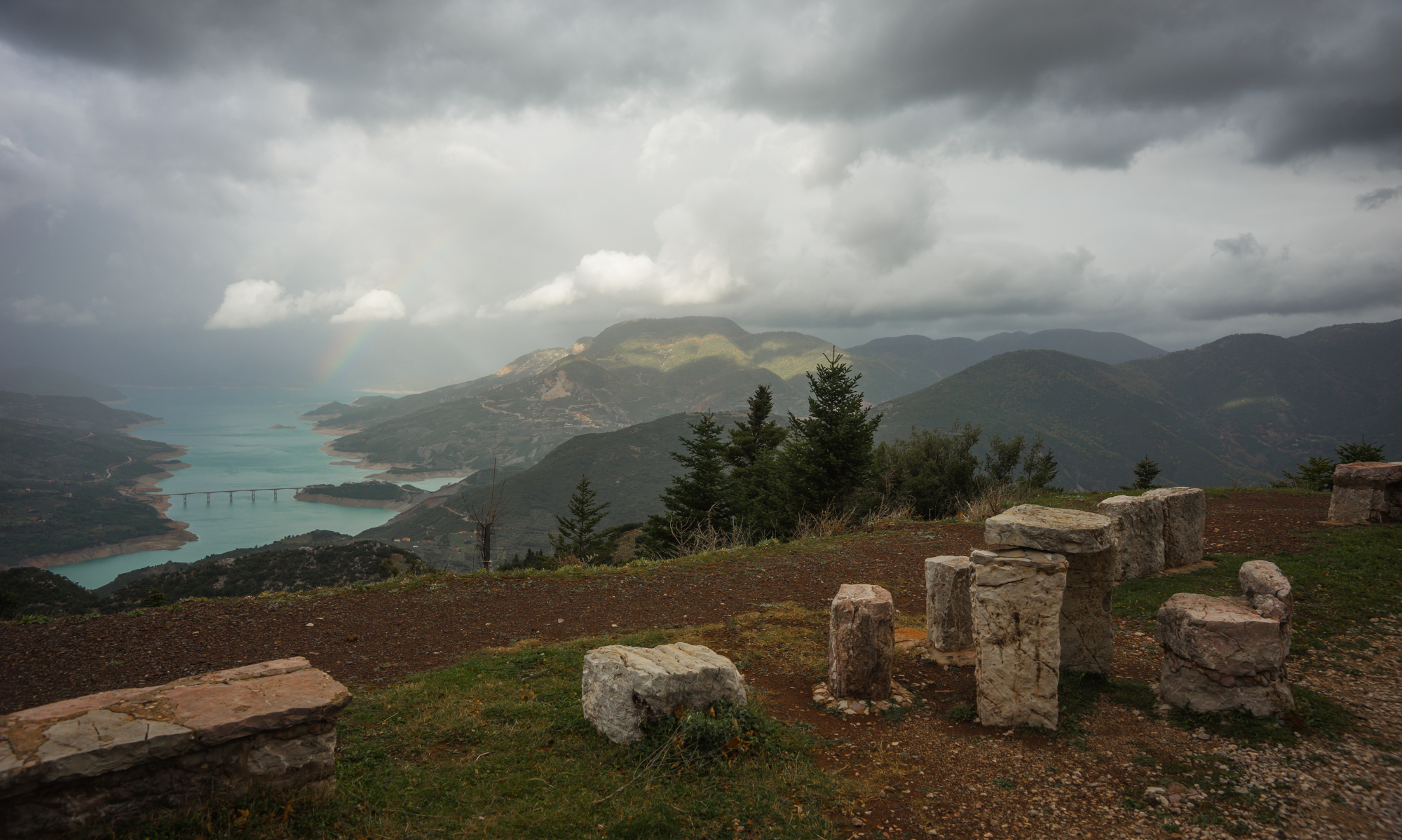 When we arrived at Neochori, it was pretty cloudy, even so the lake was stunning, reminding us of a Norwegian fjord. Dotted with green islands and mountains that rise up behind the calm water to the side of the lake. We took another (longish) stop for more photos of these awesome views.