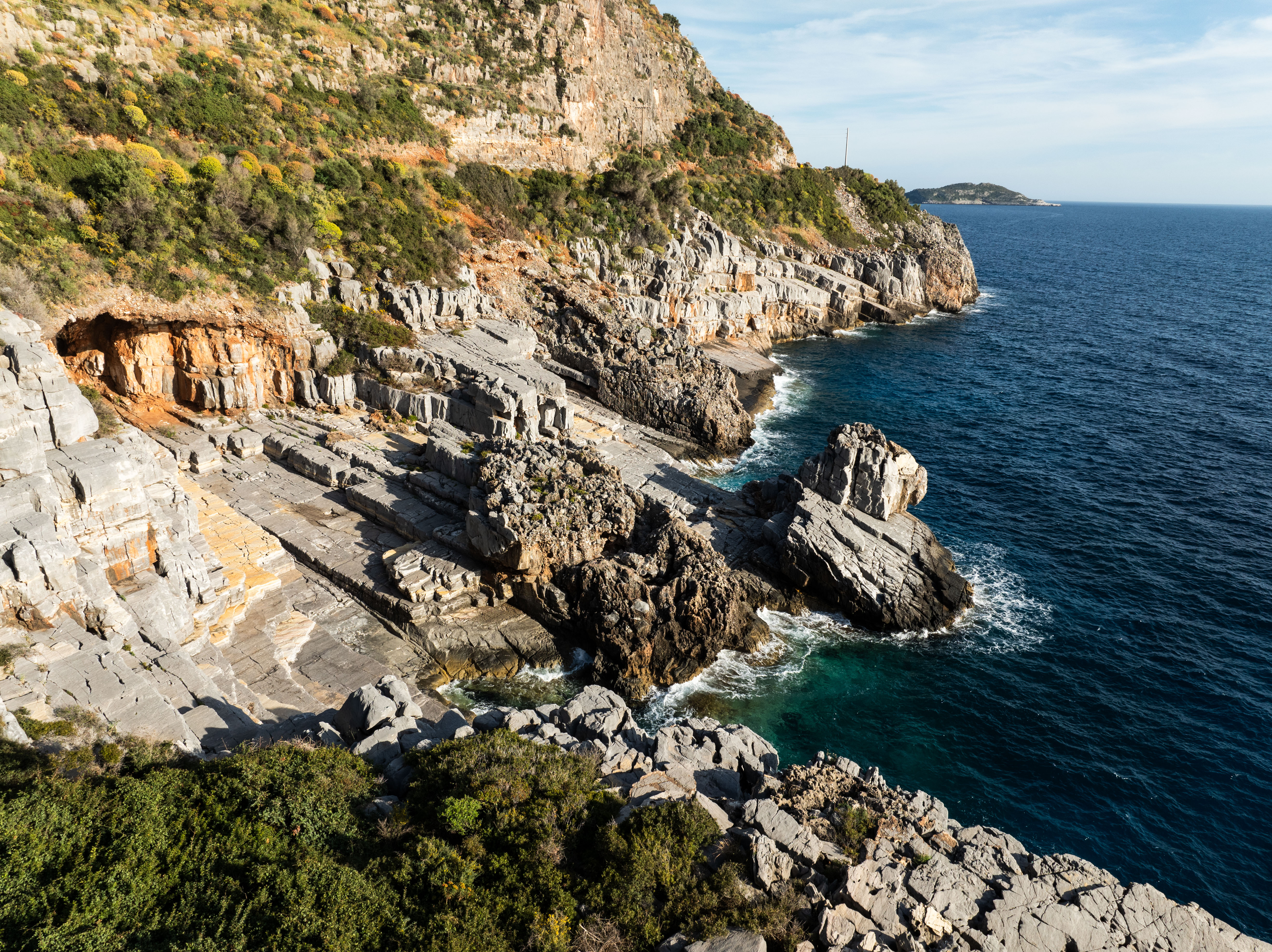 In our afternoon journey, we passed through dense olive groves from Stoupa to Agios Nikolaos and then to Agios Dimitrios, with our final stop at the picturesque Trachila, known for its well-preserved two-story stone-built houses. On the reverse route, the brilliant sunlight shone our way, highlighting the rugged rocky formations with vivid red and yellow flowers of the season, ending in the golden waters of the sea. Our attention was captured by a secluded beach with massive stone slabs arranged amphitheatrically, at the Cave of Katafigi. It was the outlet of an underground river traversing the Cave, one of the largest in Greece, but not fully explored.