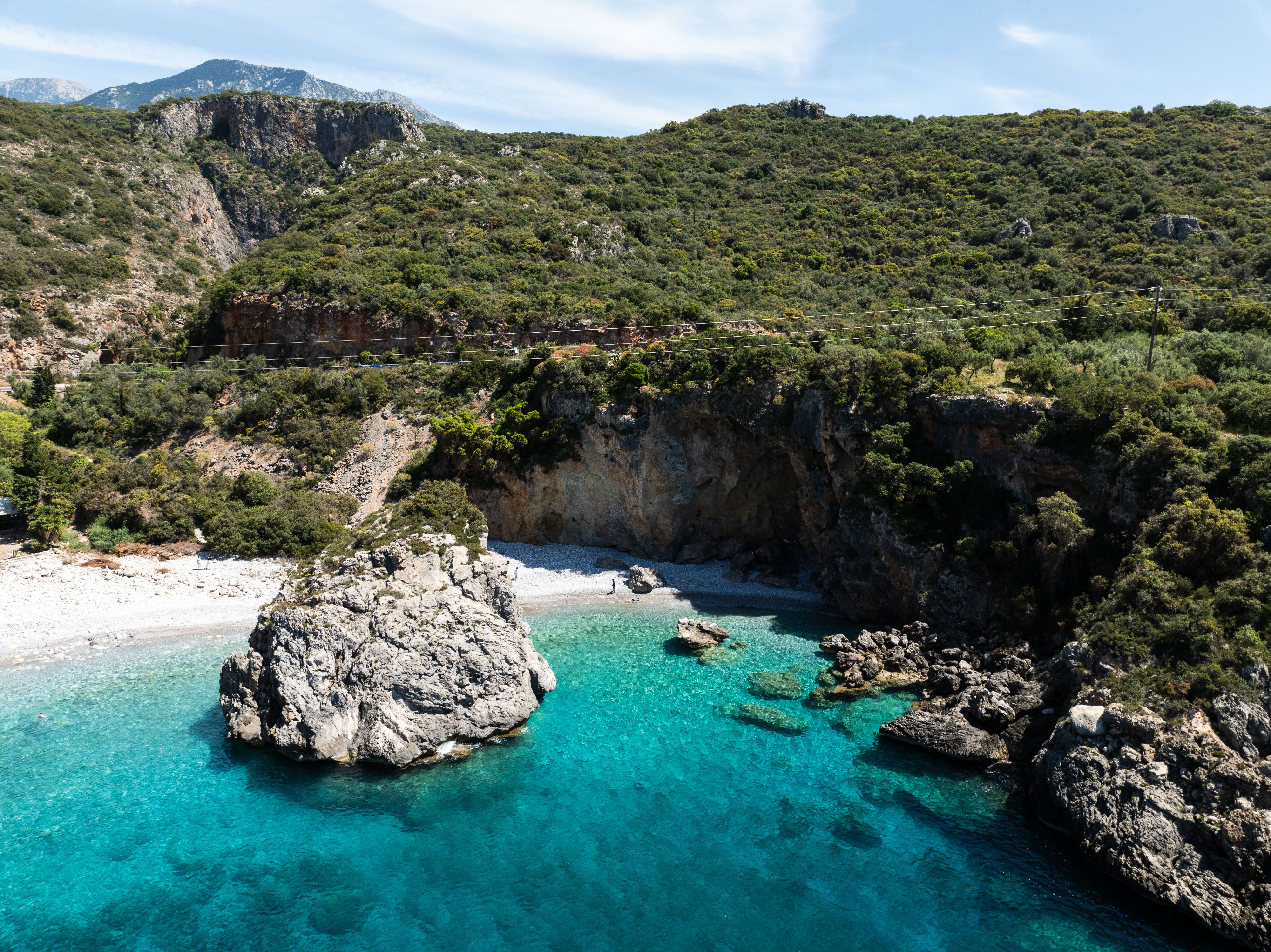 Our return included a dip at Foneas Beach, a place whose name intrigued us, but the location captivated us. A short path led us to a quiet cove with white pebbles and a disproportionately large rock at its center. Now refreshed, with strong experiences and impressions from our three-day exploration, we mitigated the feeling of melancholy from our return with a brief reflection on the trip. The contrasting yet thrilling images between the seaside and mountain elements, the historical and architectural heritage, and the authenticity of the place and its people evoke a unique and irresistible charm.