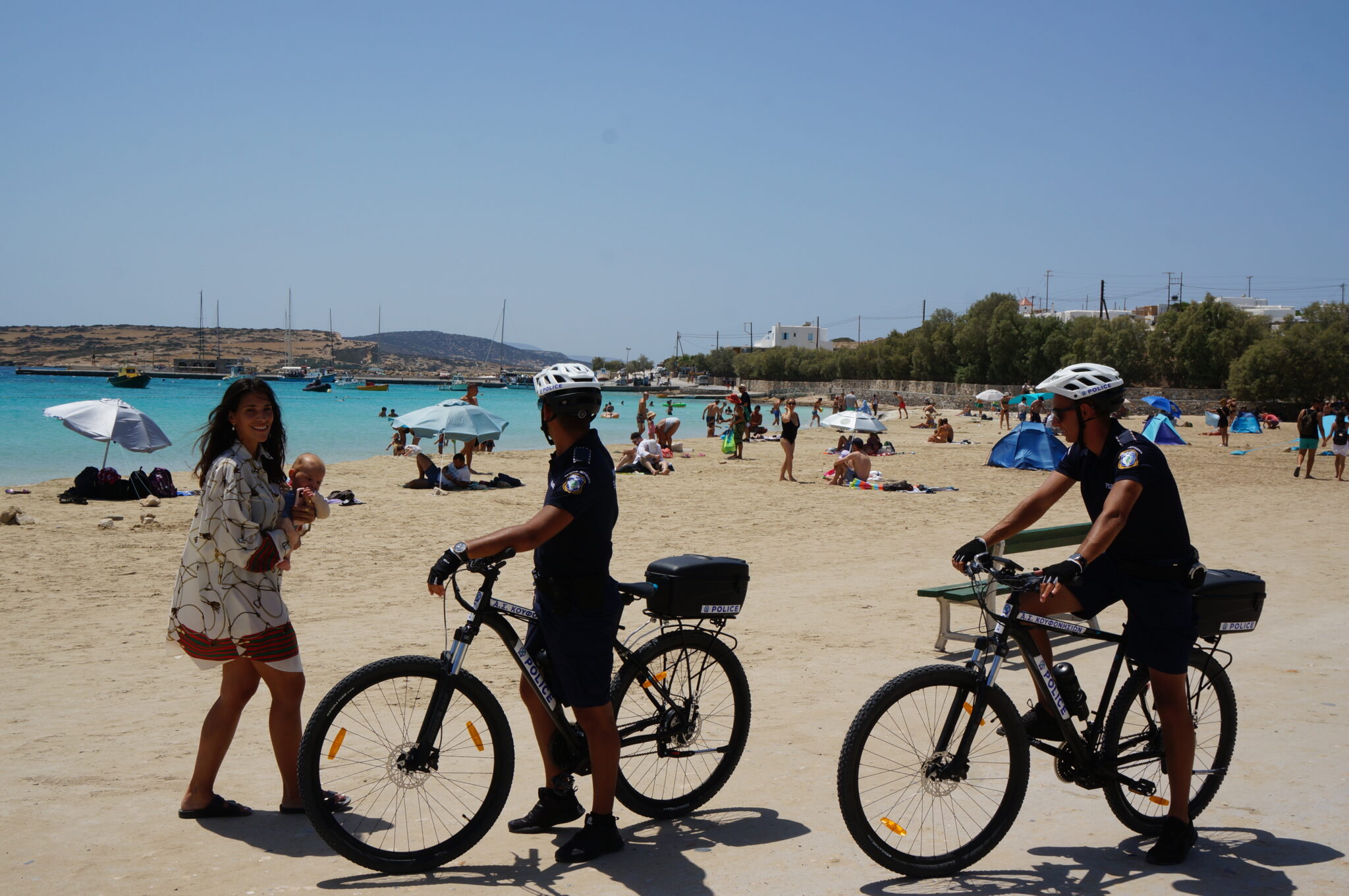 The electric bicycle police officers have also taken on another role, that of unofficial tourist guides on the island. Visitors often ask these officers for their advice on where it is best to swim on a particular day, depending on the winds, or which taverna to prefer for specific food preferences.