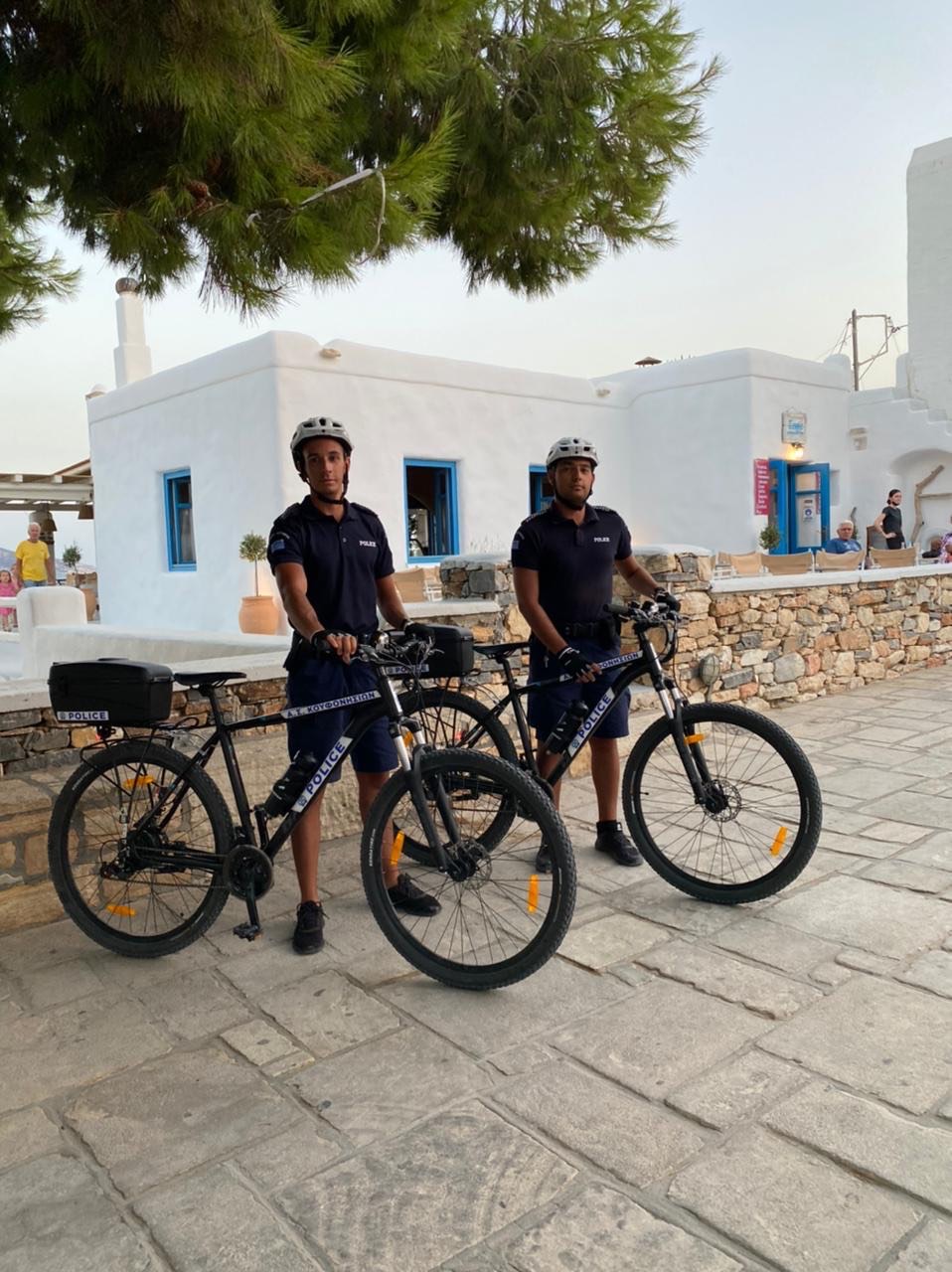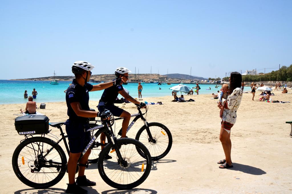 The electric bicycle police officers have also taken on another role, that of unofficial tourist guides on the island. Visitors often ask these officers for their advice on where it is best to swim on a particular day, depending on the winds, or which taverna to prefer for specific food preferences.
