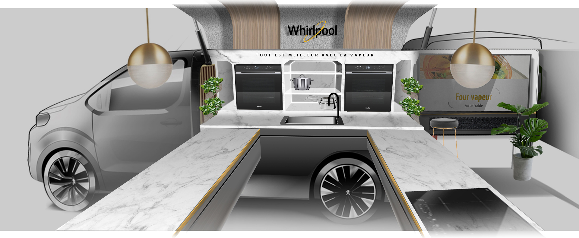 The objective of the collaboration between Peugeot and Whirlpool was to create a unique and exceptional experience, inspired by the world of gastronomy and French bistros. The Peugeot Design Lab designers then took on the task of developing this concept, aligning it with modern needs as well as the determination of Peugeot and Whirlpool for technological effectiveness combined with environmental and social responsibility.