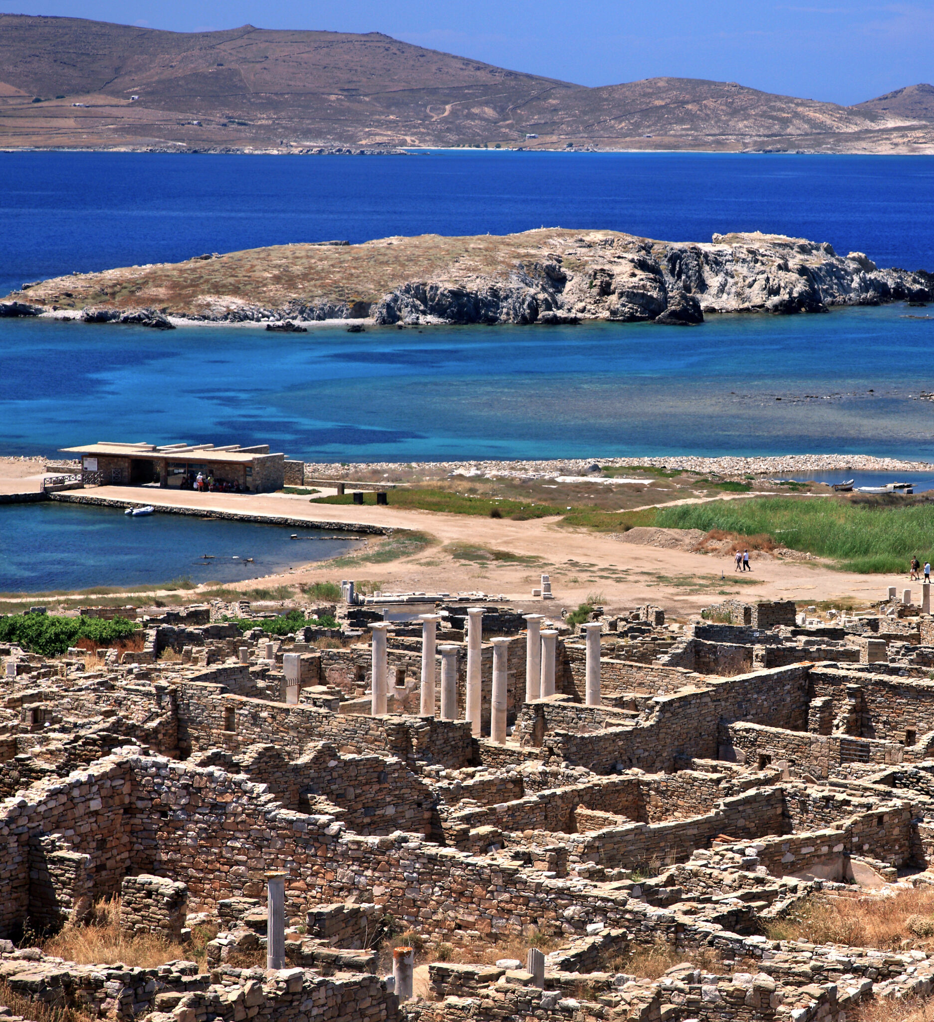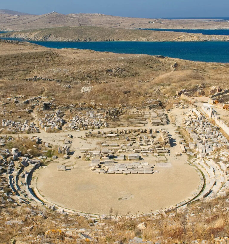 Delos, a utopia that existed – the title given to Delos by the archaeologists of the Ministry of Culture is perfectly fitting. This worldwide renowned island is located right at the centre of the Cyclades in the heart of the Aegean Sea. According to mythology two of the most important gods , the twins Apollo and Artemis, were born here. Apollo, the most beautiful of the deities, bathed the island in his light and it became a sacred place.