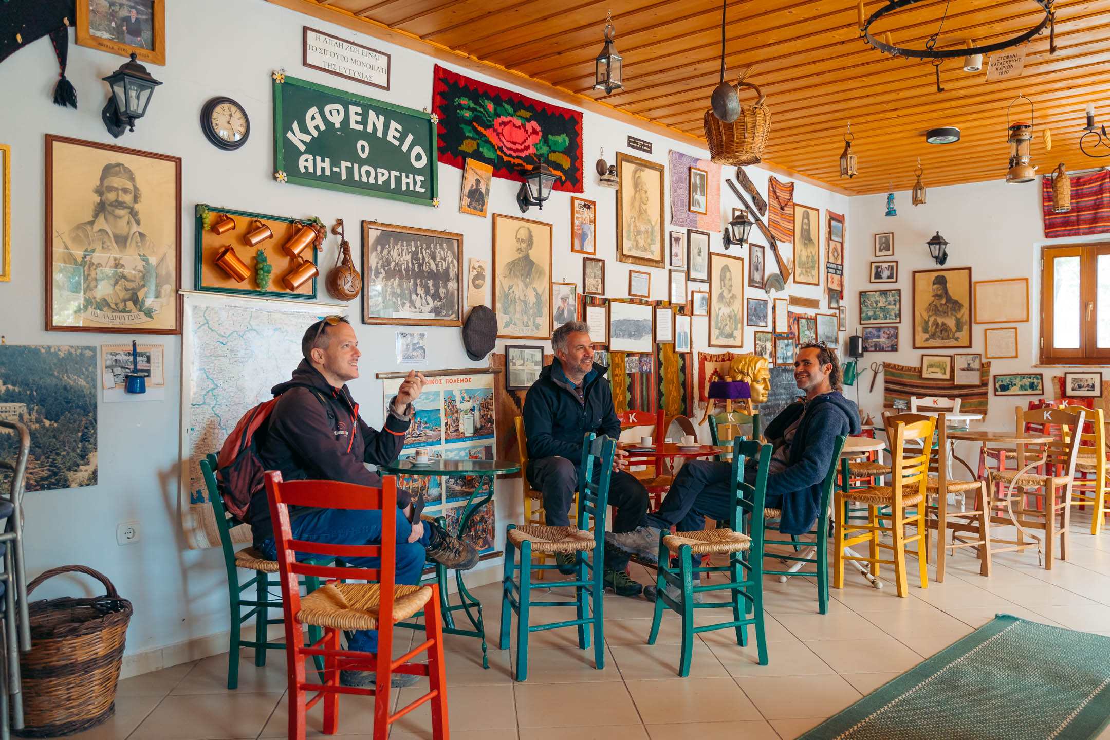 We have been in the village for some time and we have not seen a human being, only a dog that keeps us company. As we prepare for the hike, Lambros leads us to the café right next to the church. It is a different café though, as it is a self-managed. There is no barista, and anyone who wants a coffee takes on that role. “Anyone can come here and make their own coffee, using the supplies and utensils on site. Their only obligation is to leave it as they found it, clean and tidy”.