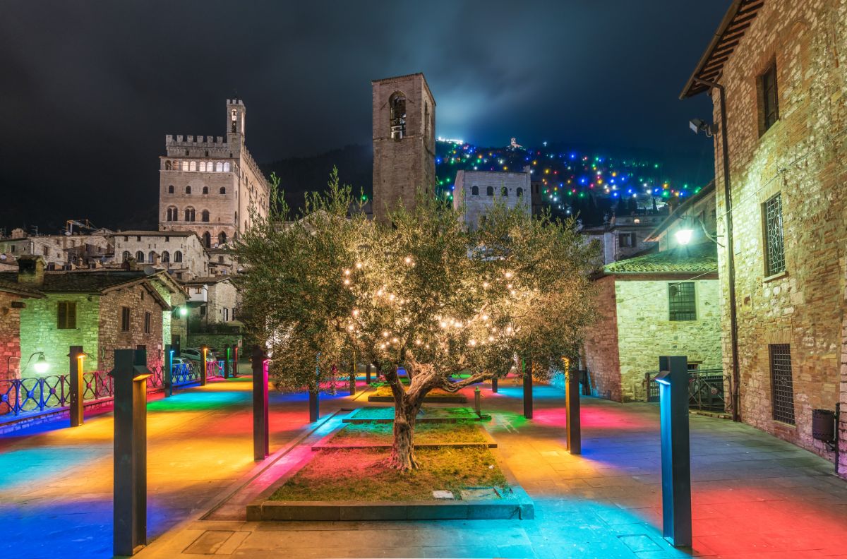 Το μεσαιωνικό, πετρόχτιστο Gubbio, στη βορειοδυτική πλευρά της Ούμπρια, της «πράσινης καρδιάς της Ιταλίας» στέκει περήφανα κάτω από τις πλαγιές του βουνού Ingino και μάλιστα τις αξιοποιεί με τον πιο ευφάνταστο τρόπο, απλώνοντας πάνω τους το μεγαλύτερο χριστουγεννιάτικο δέντρο στον κόσμο. Δεν πρόκειται για κλασσικό δέντρο καθώς σχηματίζεται από πολύχρωμα φωτάκια, ξεκινώντας από τα τείχη της πόλης και φτάνοντας σε υψόμετρο 650 μέτρα στην βουνοπλαγιά. Το υπέροχα φωτισμένο τη νύχτα θέαμα που δημιουργούν τα 800 φώτα του, μπορεί κανείς να απολαύσει κάθε βράδυ από τις 7 Δεκεμβρίου ως το τέλος των γιορτών, παράλληλα με την υπαίθρια, γεμάτη χειροτεχνήματα και εδέσματα, χριστουγεννιάτικη αγορά της πόλης.