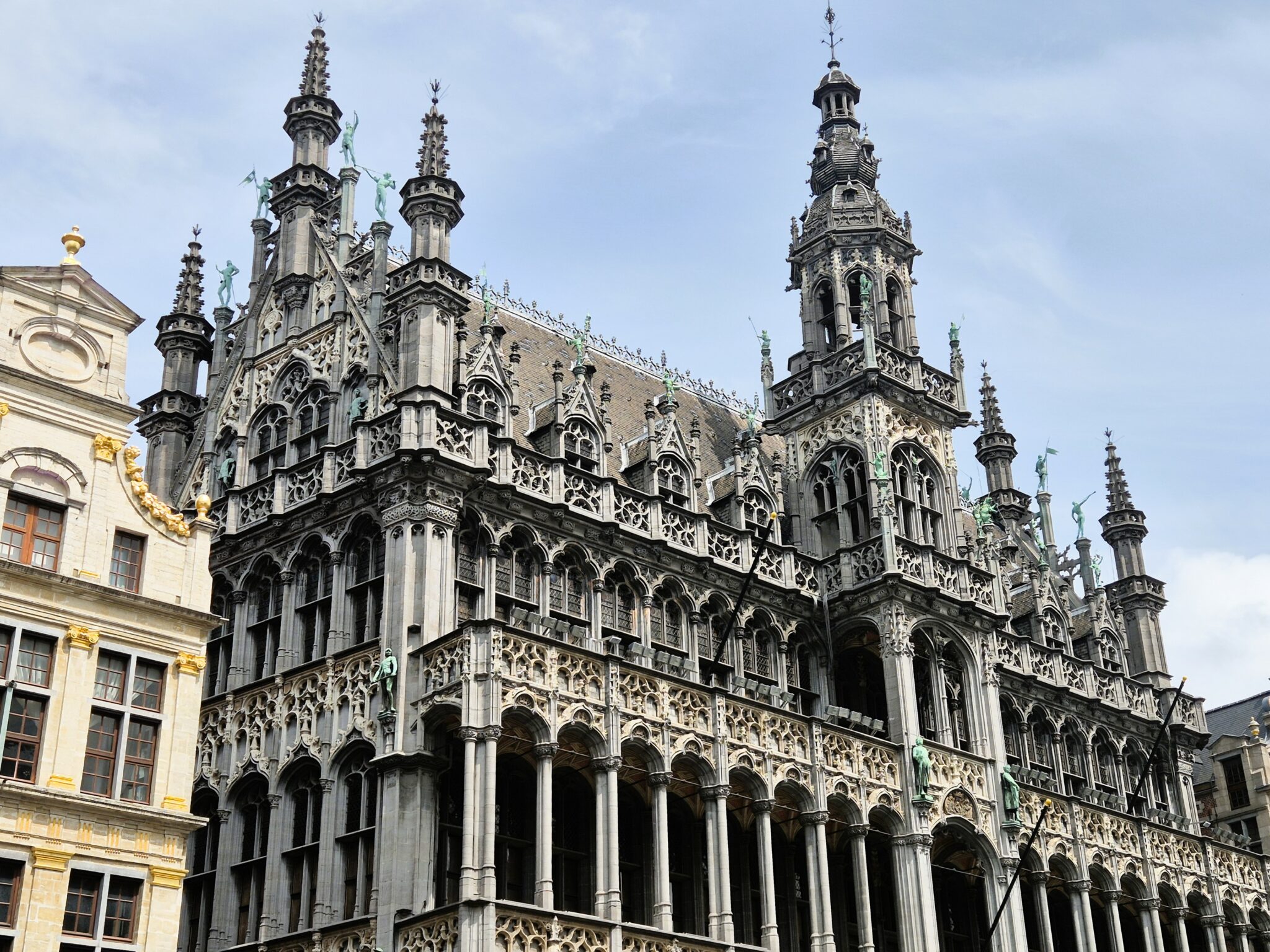 Αναμφίβολα το πετράδι στο χρυσό στέμμα της Grand Place, το Δημαρχείο των Βρυξελλών αποτελεί την απόλυτη έκφραση του γοτθικού ρυθμού. Το επιβλητικό κτήριο που δεσπόζει στην πλατεία, ολοκληρώθηκε σε διαφορετικά στάδια, ξεκινώντας από το 1402, με το σχέδιο του Jacob van Thienen να ολοκληρώνεται το 1405, αποτελώντας σήμερα την αριστερή πτέρυγα του κτηρίου. Το 1444 προστέθηκε η δεξιά πτέρυγα για να ανταγωνιστεί την πόλη του Leuven για τον τίτλο της πρωτεύουσας του Δουκάτου της Βραβάντης. Ο διάσημος πύργος του Hôtel de Ville, το πιο αναγνωρίσιμο σύμβολο της πόλης, ανεγέρθηκε πέντε χρόνια μετά και στεφανώνεται από το ύψους 5 μέτρων επιχρυσωμένο άγαλμα του Αρχάγγελου Μιχαήλ, που προστατεύει την πόλη του από ύψος 96 μέτρων.