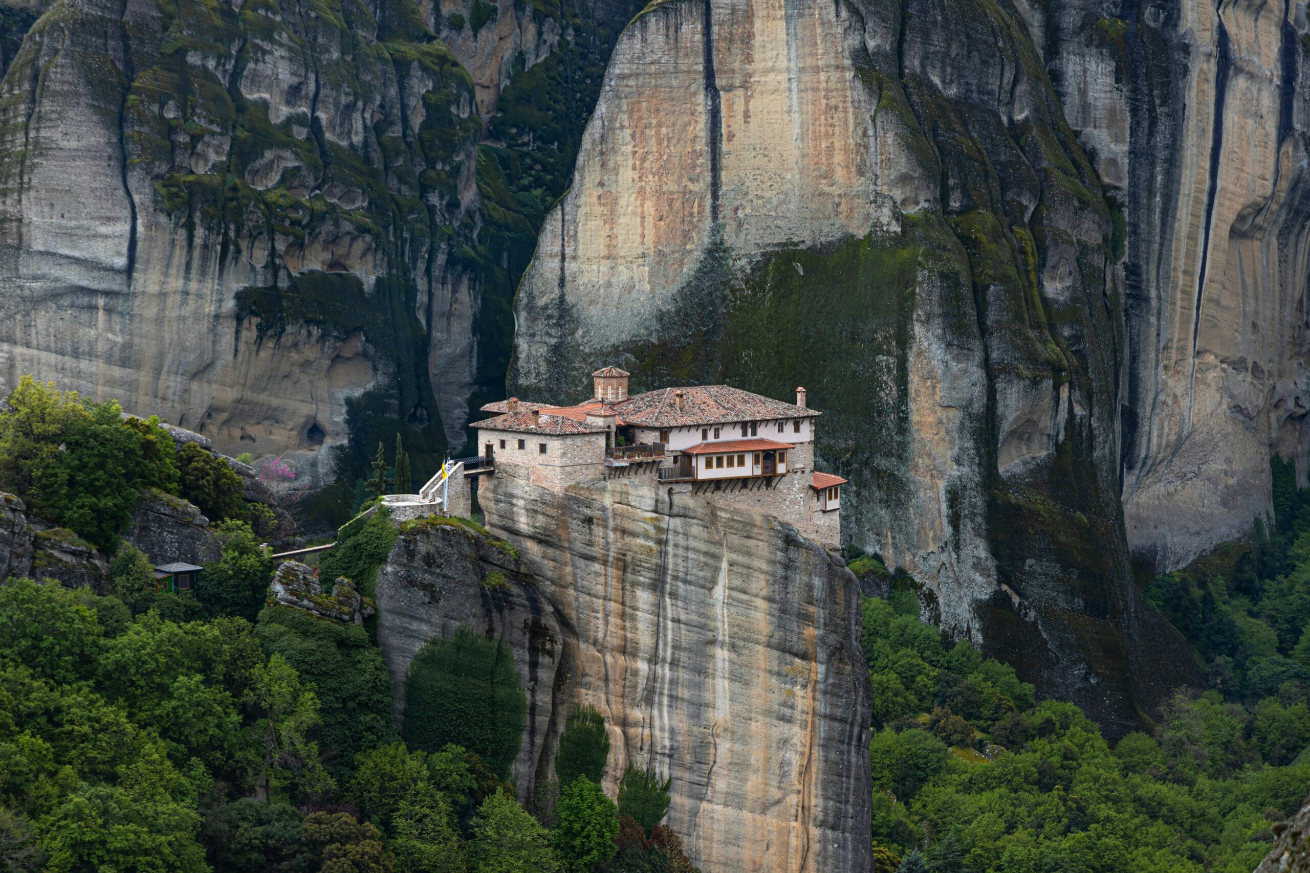 Πέρα από το φυσικό τοπίο, εντυπωσιακά είναι και τα μοναστήρια που δεσπόζουν στις κορυφές των βράχων. Εκεί βρήκαν καταφύγιο οι πρώτοι ερημίτες μοναχοί, κυρίως στα βυζαντινά χρόνια, χτίζοντας σταδιακά μια σειρά από μοναστήρια που φιλοξενούν πολύτιμα κειμήλια και τοιχογραφίες. Σύμφωνα με ιστορικές πηγές, οι μονές αριθμούσαν κάποτε περίπου τριάντα: σήμερα σώζονται οκτώ, εκ των οποίων οι έξι παραμένουν ενεργές: τέσσερις ανδρικές και δύο γυναικείες.
