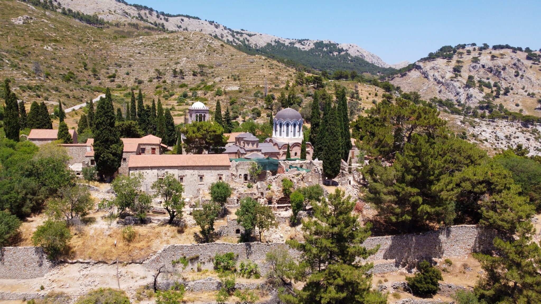 Από το αρχικό συγκρότημα με την αμυντική αρχιτεκτονική διατηρούνται σήμερα το καθολικό, η κινστέρνα (δεξαμενή), ο πύργος, τμήμα της Τράπεζας και ο ναός του Αγίου Λουκά στο κοιμητήριο της μονής, εκτός του τείχους. Το καθολικό, αφιερωμένο στην Κοίμηση της Θεοτόκου αποτελεί σπουδαίο παράδειγμα του μεσοβυζαντινού αρχιτεκτονικού τύπου οκταγωνικού ναού, του λεγόμενου νησιωτικού. Ξεχωρίζει για τον λαμπρό ψηφιδωτό διάκοσμο που έχει χρονολογηθεί στα χρόνια 1049-1055 και απηχεί την ακμάζουσα τέχνη της Κωνσταντινούπολης στα χρόνια της Μακεδονικής δυναστείας. Υπάρχουν επίσης σπαράγματα πολυτελούς, πολύχρωμης ορθομαρμάρωσης.