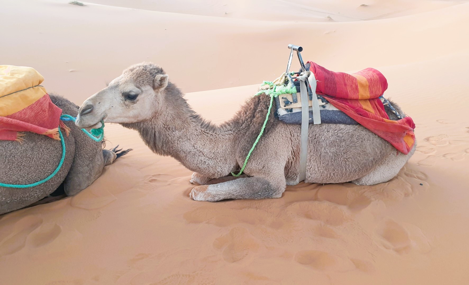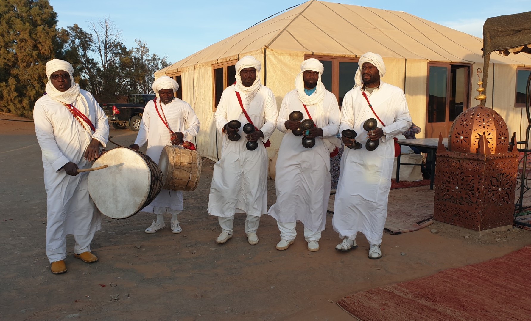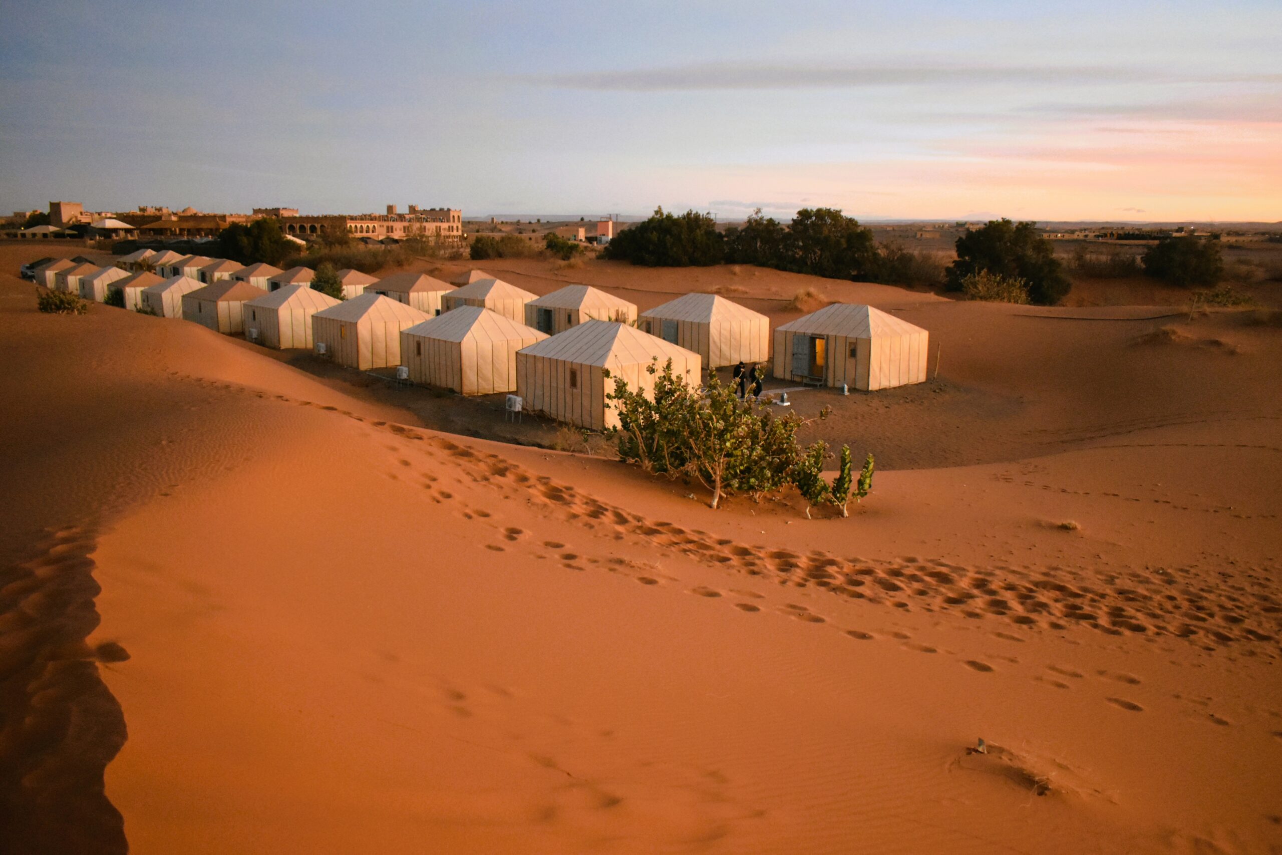 Μη διστάσετε να ανεβείτε σε καμήλα, να γίνετε μέλος ενός καραβανιού που πορεύεται προς το μοναδικό ηλιοβασίλεμα, να νοιώσετε ξυπόλητοι την απογευματινή δροσιά της φίνας άμμου, να καθίσετε στους αμμόλοφους απολαμβάνοντας την ευεργετική σιωπή. Πριν διαπιστώσετε πώς είναι η διανυκτέρευση σε πλήρως εξοπλισμένες, ευρύχωρες σκηνές διαμέσου της ερήμου, αξίζει να αφεθείτε με όλες σας τις αισθήσεις σε ένα αυθεντικό βερβέρικο γλέντι, που ξεκινά με πλούσιο δείπνο τοπικών σπεσιαλιτέ, όπως τα ζουμερά ταζίν με κρέας, κους κους, λαχανικά κι αποξηραμένα φρούτα στα χαρακτηριστικά κωνικά πήλινα σκεύη και οι πεντανόστιμες παστίγιες, πίτες με ιστορία αιώνων σε πολλές παραλλαγές. Και βέβαια αφήστε το ρυθμό από τα τύμπανα και τις σιδερένιες καστανιέτες να σας ξεσηκώσει από το πολύχρωμο, στρωμένο στην άμμο χαλί όπου θα κάθεστε και να σας παρασύρει σε ένα ξέφρενο χορό γύρω από τη φωτιά. Το μόνο που απομένει πριν αφήσετε πίσω σας τη Μερζούγκα, είναι η ανατολή στην έρημo, παρακολουθώντας τον ήλιο να ξεπροβάλλει πίσω από τους αμμόλοφους και να χρωματίζει τον ορίζοντα με αποχρώσεις του ροζ και το τοπίο με χρυσαφένια λάμψη.