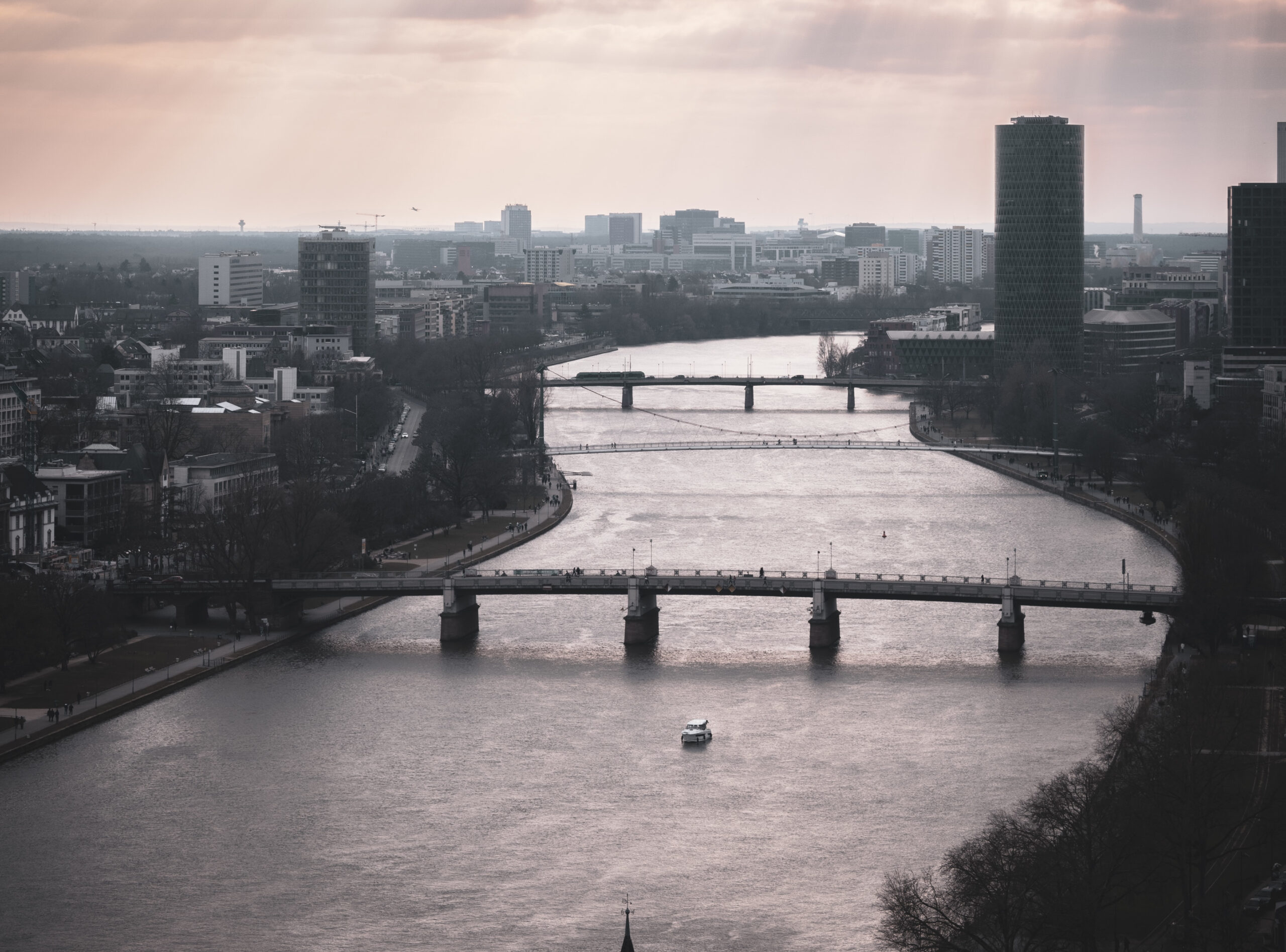 Ξεκινάμε την ημέρα με έναν απολαυστικό καφέ στο «Café Hauptwache» (Hauptwache 15). Στο κέντρο της πόλης, βολευόμαστε στο ζεστό εσωτερικό του κτιρίου του 18ου αιώνα, ενώ αν ο καιρός είναι καλός, καθόμαστε έξω και βλέπουμε τον κόσμο να περνάει. Στη συνέχεια παίρνουμε το καραβάκι για να πάμε βόλτα στα νερά του ποταμού Main (Primus Line, Mainkai 36, 12,30 ευρώ η βόλτα για 50 λεπτά). Από εδώ θαυμάζουμε όλους τους ουρανοξύστες της πόλης, καθώς ρίχνουν τη σκιά τους πάνω στα υπόλοιπα κτίρια.
