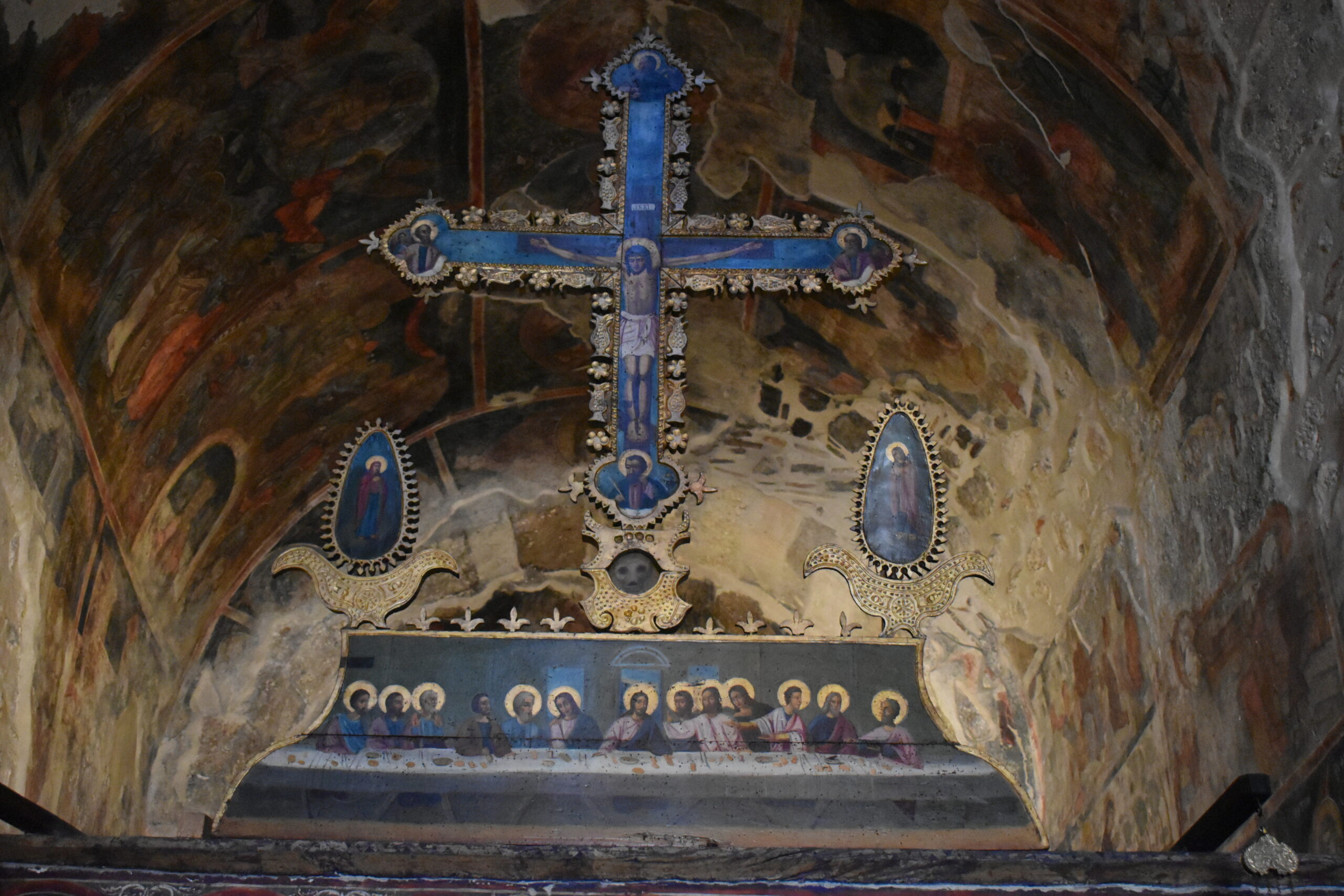 Ενσωματωμένα στο ιερό μαρμάρινα στοιχεία φθάνουν την ηλικία των 2.000 ετών, ενώ εμφανής είναι και η βυζαντινή τεχνοτροπία κατά την οποία το σκαλιστό μάρμαρο γεμίζονταν με κερί και μαστίχα. Η μονή υπέστη στην πορεία του χρόνου και πολλές λεηλασίες από Ενετούς, Φράγκους και Οθωμανούς, τα σημάδια μάλιστα των τελευταίων φαίνονται ξεκάθαρα στους βανδαλισμούς των τοιχογραφιών, όπου έχουν αφαιρεθεί τα μάτια των αγίων. Αυτό όμως που εντυπωσιάζει περισσότερο, βρίσκεται καλυμμένο κάτω από τον τάπητα για λόγους προστασίας και είναι το σπάνιο για τα ελληνικά δεδομένα, πολύχρωμο ψηφιδωτό μωσαϊκό στο δάπεδο. Φτιαγμένο με την εξαιρετικά διαδεδομένη από τους Κωνσταντινουπολίτες μαρμαροτεχνίτες τεχνική Cosmati από την ελληνική λέξη «κοσμώ», παρουσιάζει γεωμετρικά μοτίβα σε κόκκινες, πράσινες και λευκές ψηφίδες, μεγάλης καλλιτεχνικής αξίας. Τους μοναδικούς αυτούς θησαυρούς και άλλα ενδιαφέροντα στοιχεία, θα σας αποκαλύψει η ολιγομελής γυναικεία μοναστική κοινότητα η οποία κρατά ζωντανή σήμερα τη μονή, που είναι επισκέψιμη καθημερινά 10:30 -13:00 και 18:00-20:00.