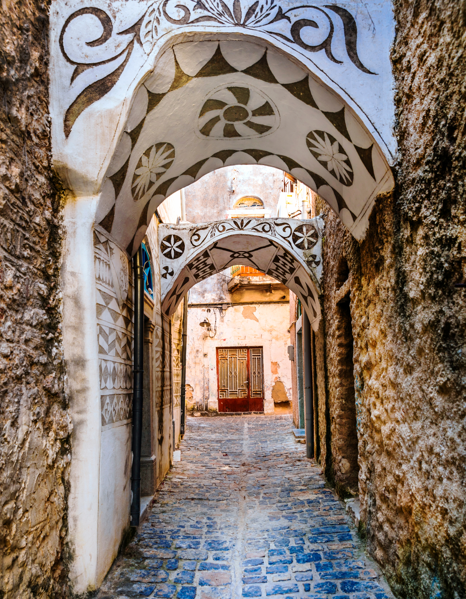 Η διακοσμητική αυτή τεχνική βασίζεται στη μαύρη άμμο του επιχρίσματος, η οποία, αφού ασπριστεί, ξύνεται ακολουθώντας τα μοτίβα, δημιουργώντας έτσι μαύρα σχέδια πάνω σε λευκό φόντο. Για την καταγωγή της τεχνικής υπάρχουν ακόμη διαφωνίες μεταξύ των ειδικών, σχετικά με το αν είναι ιταλική ή ανατολίτικη. Το βέβαιο είναι ότι περπατώντας στα σοκάκια του χωριού, νομίζαμε πως κινούμαστε ανάμεσα σε σπίτια που δεν έχουν χτιστεί, αλλά κεντηθεί προσεκτικά στο χέρι.