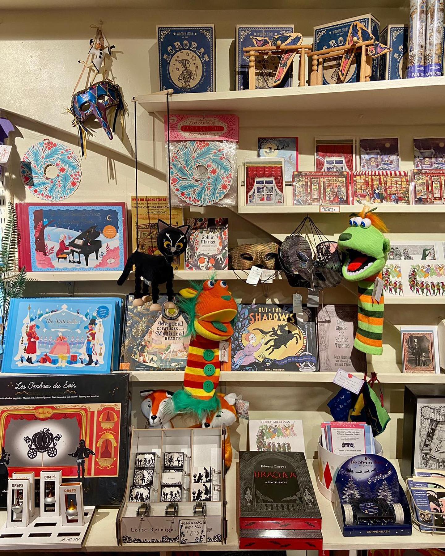 Το μαγαζί, βέβαια, έχει μία πραγματικά μοναδική ειδίκευση: το κουκλοθέατρο. Πράγμα που σημαίνει ότι στο Benjamin Pollock’s Toyshop θα βρείτε από μαριονέτες γάντια μέχρι τις παραδοσιακές ξύλινες μαριονέτες, για εκείνους που επιθυμούν μία ακόμα πιο αυθεντική εμπειρία. Ακόμα ξύλινα, χειροποίητα παιχνίδια γύρω από την ευρύτερη θεματική του θεάτρου και των παραστάσεων, κάποιες φανταστικές εκδόσεις του Πινόκιο, αλλά και χειροποίητα χάρτινα κουκλοθέατρα, τόσο εντυπωσιακά που δεν θα μπορείτε να πιστέψετε ότι είναι αληθινά. Και, φυσικά, πάνινες κούκλες κεντημένες στο χέρι, μία διαχρονική αξία που ξετρελαίνει το ίδιο τους μικρούς, αλλά και τους μεγάλους.