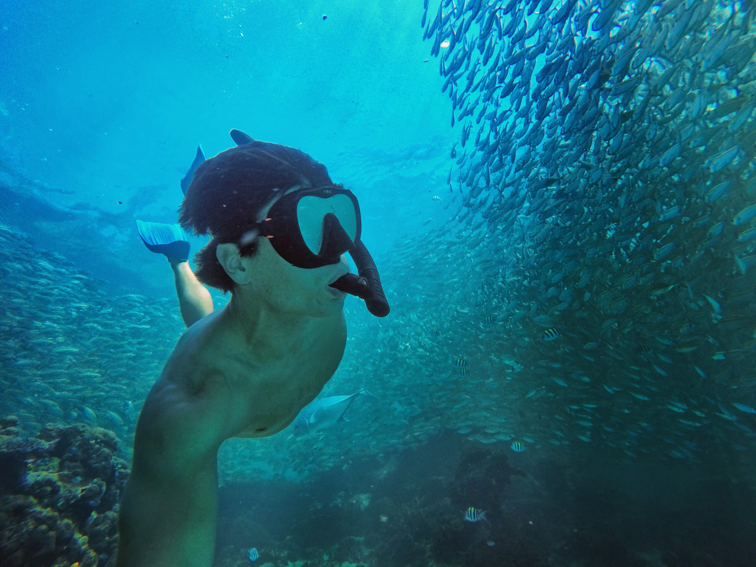 Πηγαίνοντας προς το ξενοδοχείο μας στο Badian, σταματήσαμε πριν στο Moalboal. Εκεί, όπως και στο Bohol, είναι ένα από λίγα μέρη στο κόσμο που μπορείς να ζήσεις το φαινόμενο “sardines run”. Εκατομμύρια σαρδέλες κολυμπούν μαζί και μπορείς να κολυμπήσεις μαζί τους μόλις 30 μέτρα από την ακτή. Επίσης υπάρχουν και 7 χελώνες που σε συντροφεύουν στο κολύμπι και αυτές. Πολλά παιδιά θα σας προσεγγίσουν να πάρετε όμορφα κολιέ από κοχύλια. Μιλήστε τους, όλα μιλάνε καλά αγγλικά, και είναι εξαιρετικοί μαθητές στο σχολείο.
