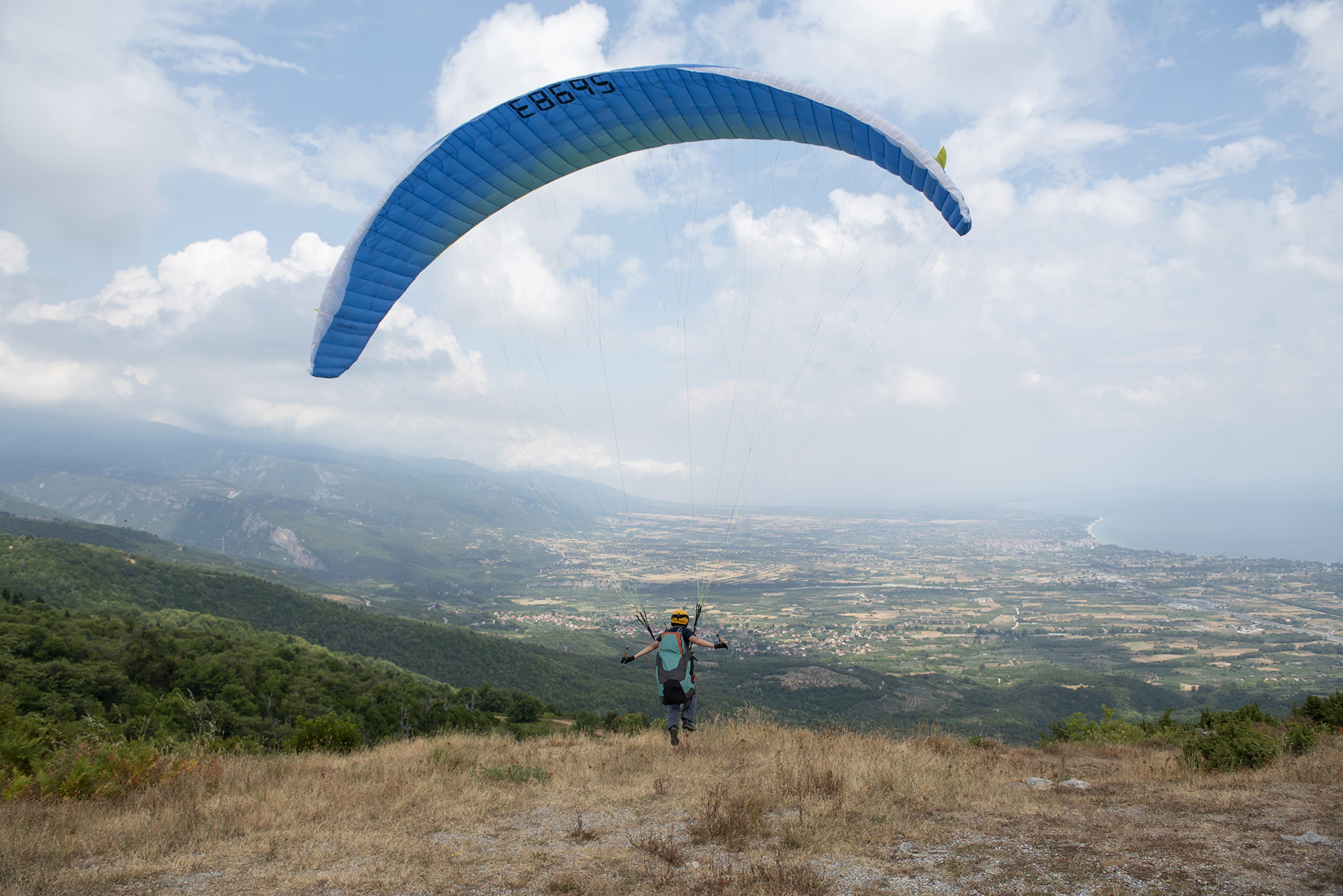 Η πτήση με αλεξίπτωτο πλαγιάς από τον Όλυμπο προσφέρει μια συγκλονιστική θέα και την αίσθηση απόλυτης ελευθερίας. Σκεφτείτε να πετάτε πάνω από τις πλαγιές του μυθικού αυτού βουνού και να αντικρίζετε από ψηλά τις απότομες κόψεις του, τις χιονισμένες βουνοκορφές του, τις δασωμένες πλαγιές του αλλά το απέραντο μπλε της θάλασσας και να προσγειώνεστε στην αμμουδιά του Θερμαϊκού κόλπου. Η βορινή πλευρά του βουνού έχει πιο ήπιες συνθήκες ιδανικές για τους αρχάριους ενώ η νότια είναι κατάλληλη για έμπειρους πιλότους. Μια πολύ κλασική και υπέροχη πτήση είναι αυτή που ξεκινά από τον λόφο του Προφήτη Ηλία στον Παλαιό Παντελεήμονα, περνά πάνω από το χωριό και το κάστρο του Πλαταμώνα και καταλήγει στις ακτές του Θερμαϊκού Κόλπου. Άλλη μια διαδρομή είναι αυτή από το Λιτόχωρο που περνά από το φαράγγι του Ενιπέα και χαρίζει μοναδική θέα σε βουνό και θάλασσα. Πάνω από το χωριό Καλύβια, στη νότια πλευρά, υπάρχει άλλο ένα σημείο απογείωσης που δίνει επιλογές σε cross-country πτήση.