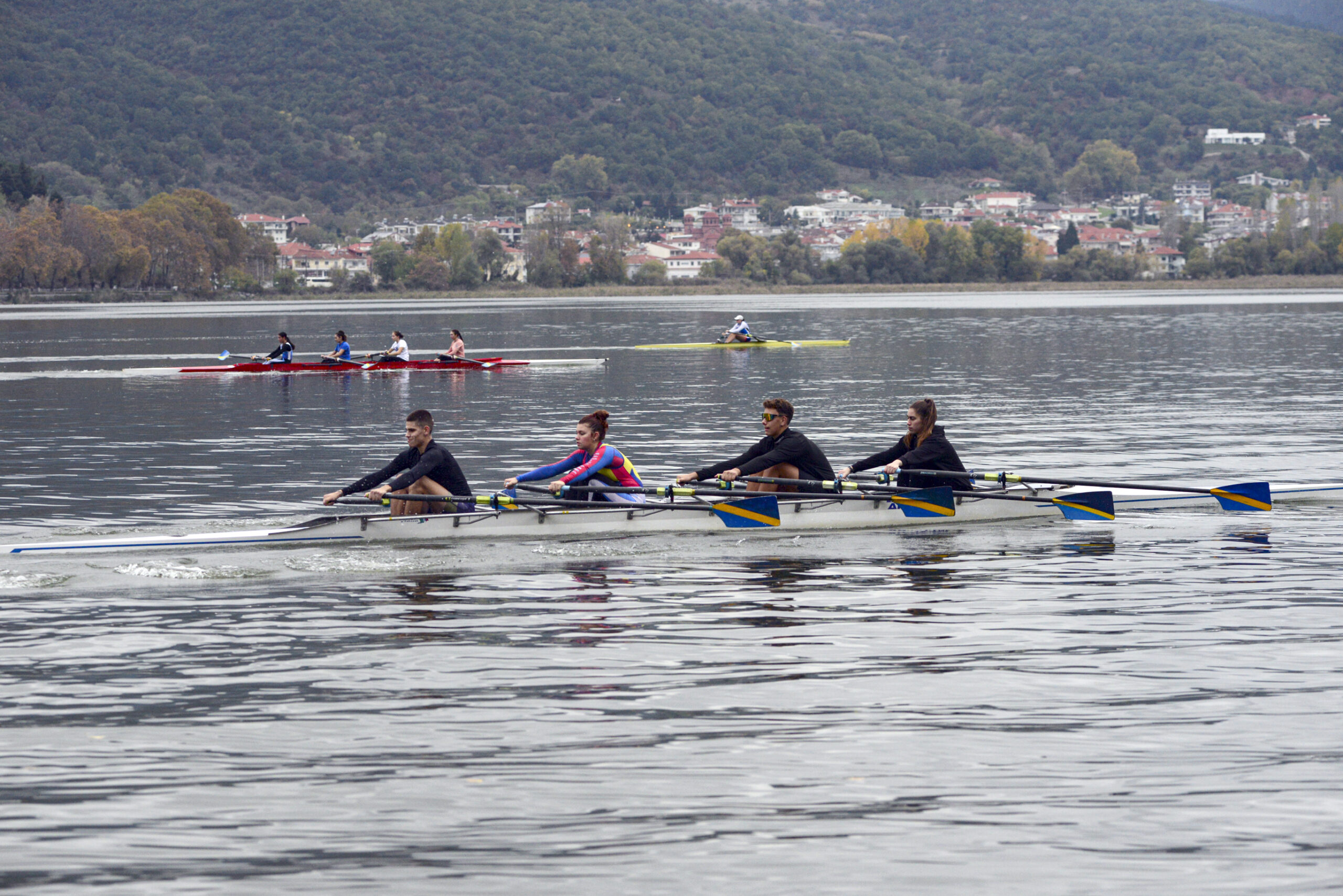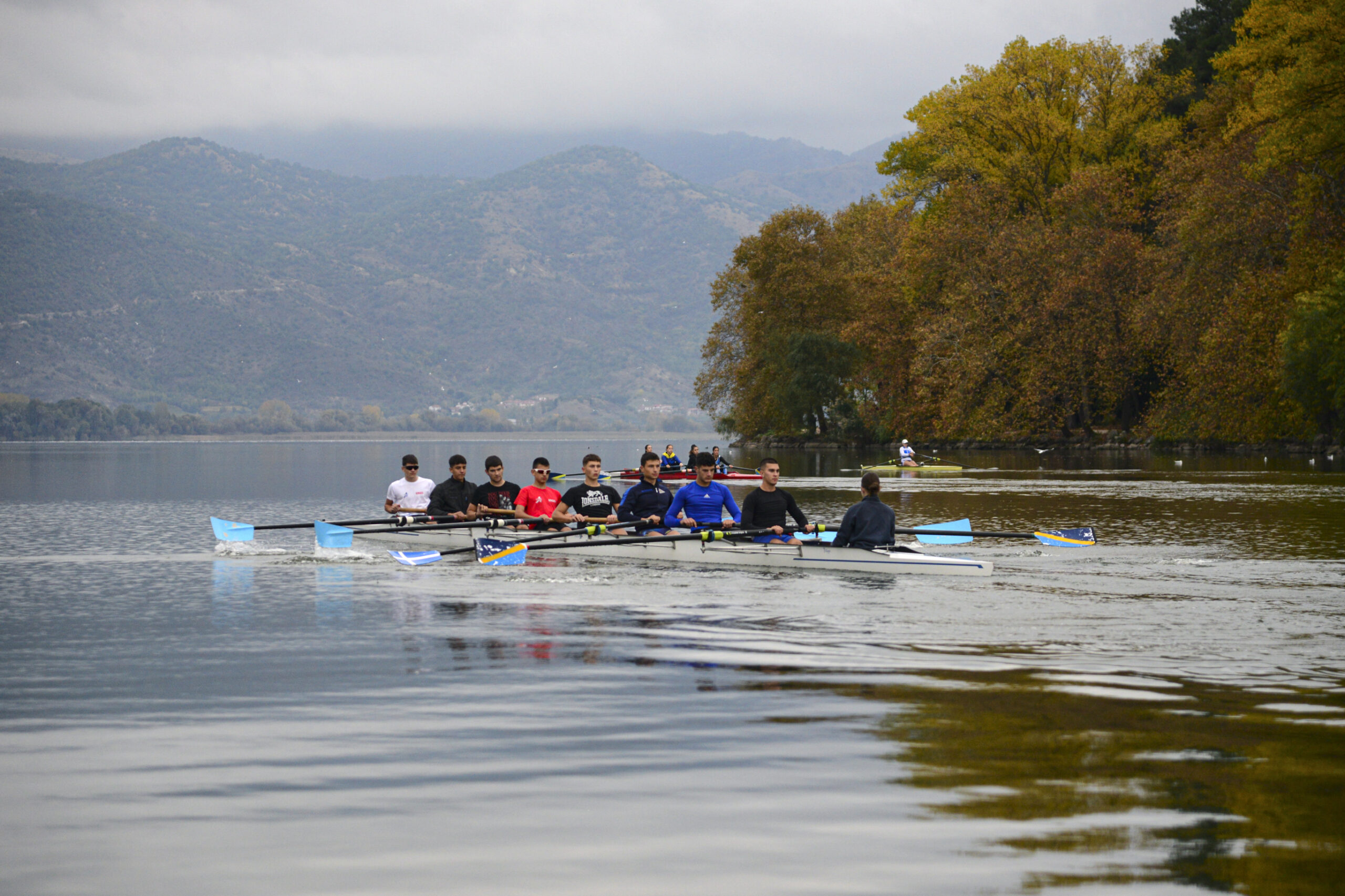 Η προβλήτα από την οποία βάζουν τα σκάφη στο νερό, σε λίγο έχει μόνο τα παπούτσια των αθλητών, οι οποίοι έχουν ξεχυθεί στη λίμνη. Ο προπονητής τους, ακολουθεί με ένα μικρό φουσκωτό, δίνοντας τις κατάλληλες οδηγίες. Μέσα σε αυτό και ο φωτογράφος μας ο οποίος θέλει να έχει λήψεις πάνω στη δράση των αθλητών. Ο χρόνος περνά και η αλήθεια είναι ότι η ταχύτητα που αναπτύσσουν με τα κωπηλατικά σκάφη είναι μεγάλη. Περιμένοντας την επιστροφή τους από το νερό, ο Παναγιώτης Μητρούδης, ο πρόεδρος του Ναυτικού Ομίλου Καστοριάς με ξεναγεί στον εσωτερικό χώρο του ομίλου.