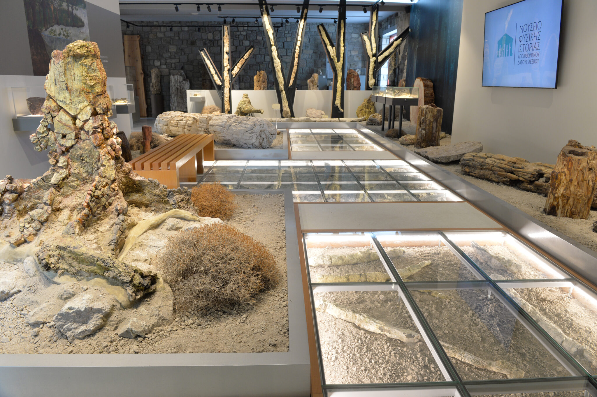 Η μόνιμη έκθεση «Απολιθωμένο Δάσος» περιλαμβάνει απολιθωμένους κορμούς, κλαδιά, καρπούς και φύλλα ποικιλίας από κωνοφόρα και αγγειόσπερμα δένδρα και απολιθωμένα οστά ζώων που ζούσαν την περίοδο του Κάτω Μειοκαίνου, δηλαδή πριν από 20 εκατομμύρια χρόνια. Διοργανώνει όμως και περιοδικές εκθέσεις όπως αυτή για τον αλιγάτορα της Λιώτας, ο οποίος ζούσε στη βορειοδυτική Λέσβο περίπου 19 εκατομμύρια χρόνια πριν σε ένα πυκνό υποτροπικό δάσος.