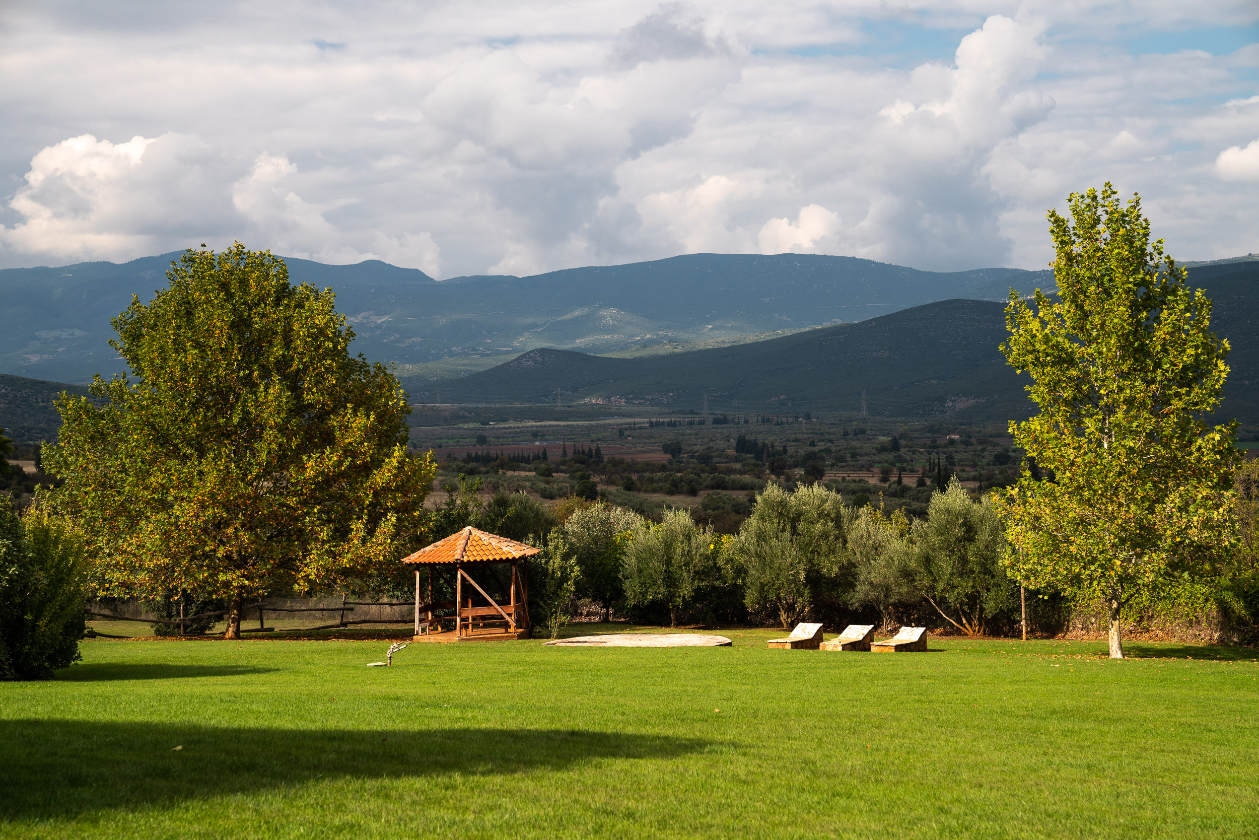 Το αγρόκτημα βρίσκεται μέσα σε 100 στρέμματα γης και στολίζεται με 700 ρίζες ελιές, καρυδιές, αμυγδαλιές, κερασιές. Στη σκιά τους απλώνεται ιδιαίτερα φροντισμένο γκαζόν ενώ όλη η έκταση είναι περιφραγμένη προφέροντας ασφάλεια, πράγμα που κάνει την εγκατάσταση κατάλληλη για οικογένειες με παιδιά.