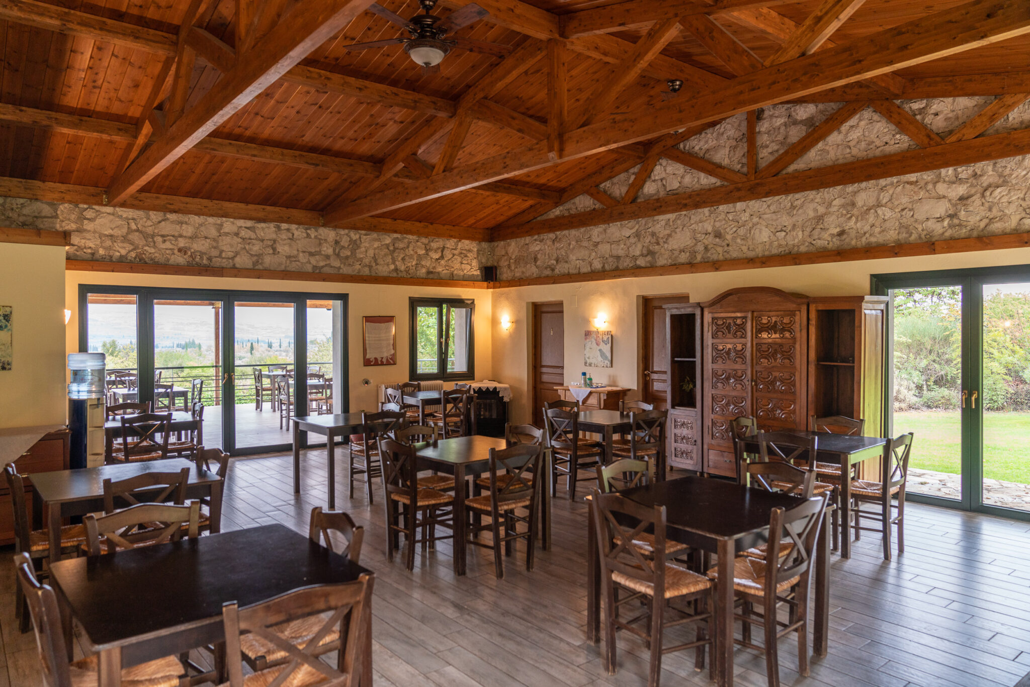 Στους κήπους του αγροκτήματος είναι διάσπαρτα στεγασμένα κιόσκια και κοινόχρηστοι χώροι, ανάμεσά τους και το μεγάλο εστιατόριο, που αποτελεί και ένα από τα σουξέ της εγκατάστασης: πρωινό-υπερπαραγωγή με χειροποίητες μαρμελάδες σε μεγάλο βαθμό από δικά τους φρούτα, λουκουμάδες, κέικ, ομελέτες, τοπικά τυριά και μέλι της περιοχής, στριφτόπιτες, εξαιρετικές σπανακόπιτες και χωριάτικο ψωμί ψημένο στα ξύλα. Για το μεσημέρι και το βράδυ, μαγείρισσες από την περιοχή, έρχονται και μαγειρεύουν τοπικά πιάτα. Έτσι, στο μενού έχει θέση η προβατίνα με χοντρό μακαρόνι, ο κοκκινιστός κόκορας με χυλοπίτες, το μοσχάρι στιφάδο.