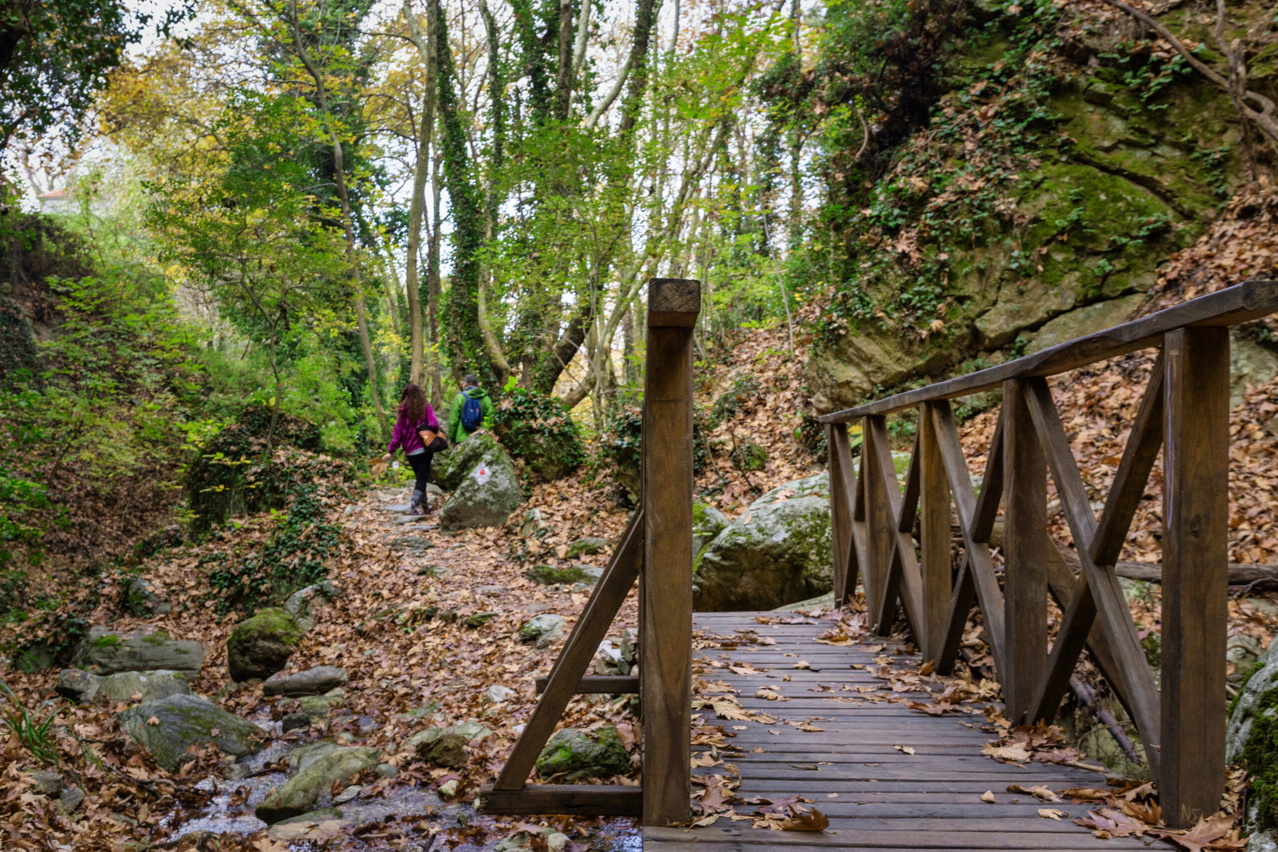 Αφού δείτε και τον πέτρινο νερόμυλο της περιοχής, έρχεται η ώρα της πεζοπορίας και μπαίνοντας στο δάσος το τοπίο αλλάζει κι η φύση εκπλήσσει για άλλη μια φορά. Και σε αυτό το τμήμα του βουνού θα βρεθείτε μπροστά σε τρεχούμενα νερά που σχηματίζουν καταρράκτες και μικρές βάθρες. Οι τολμηροί μπορούν άνετα να βουτήξουν στα κρυστάλλινα νερά, ενώ όσοι επιθυμούν να αυξήσουν το βαθμό δυσκολίας αυτής της διαδρομής, μπορούν κατόπιν προηγούμενης συνεννόησης με τον οδηγό τους να προσθέσουν και το δύσβατο μονοπάτι που οδηγεί ως τις Μηλιές. Όλοι όμως θα απολαύσουν το πικ νικ στο δάσος, που εδώ γίνεται κοντά στη βάθρα της Κορώπης.
