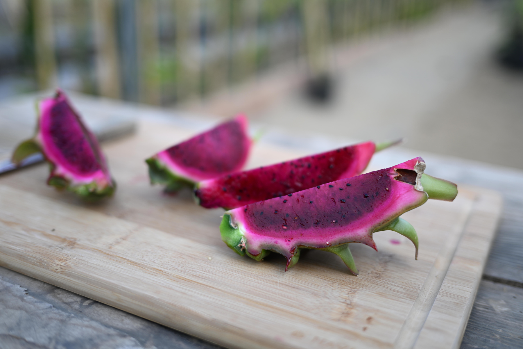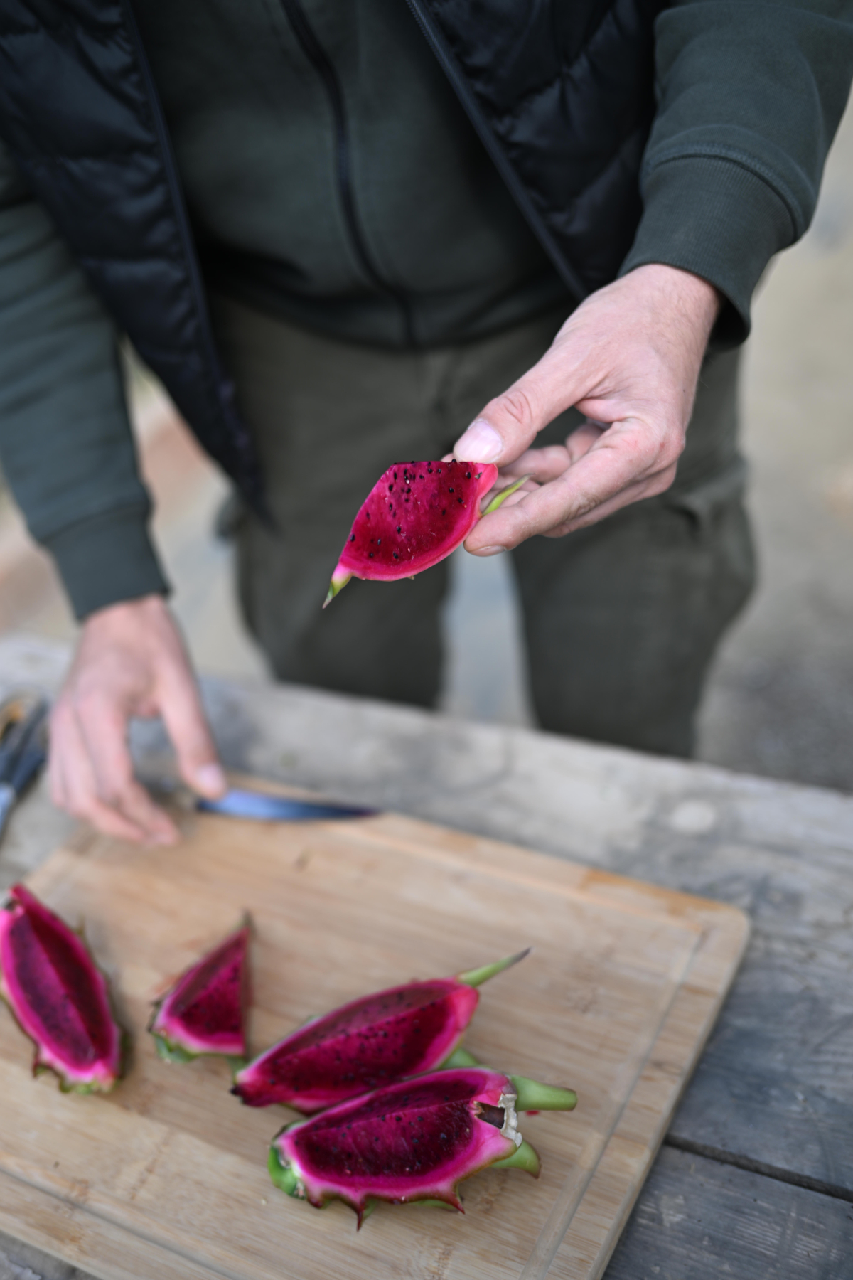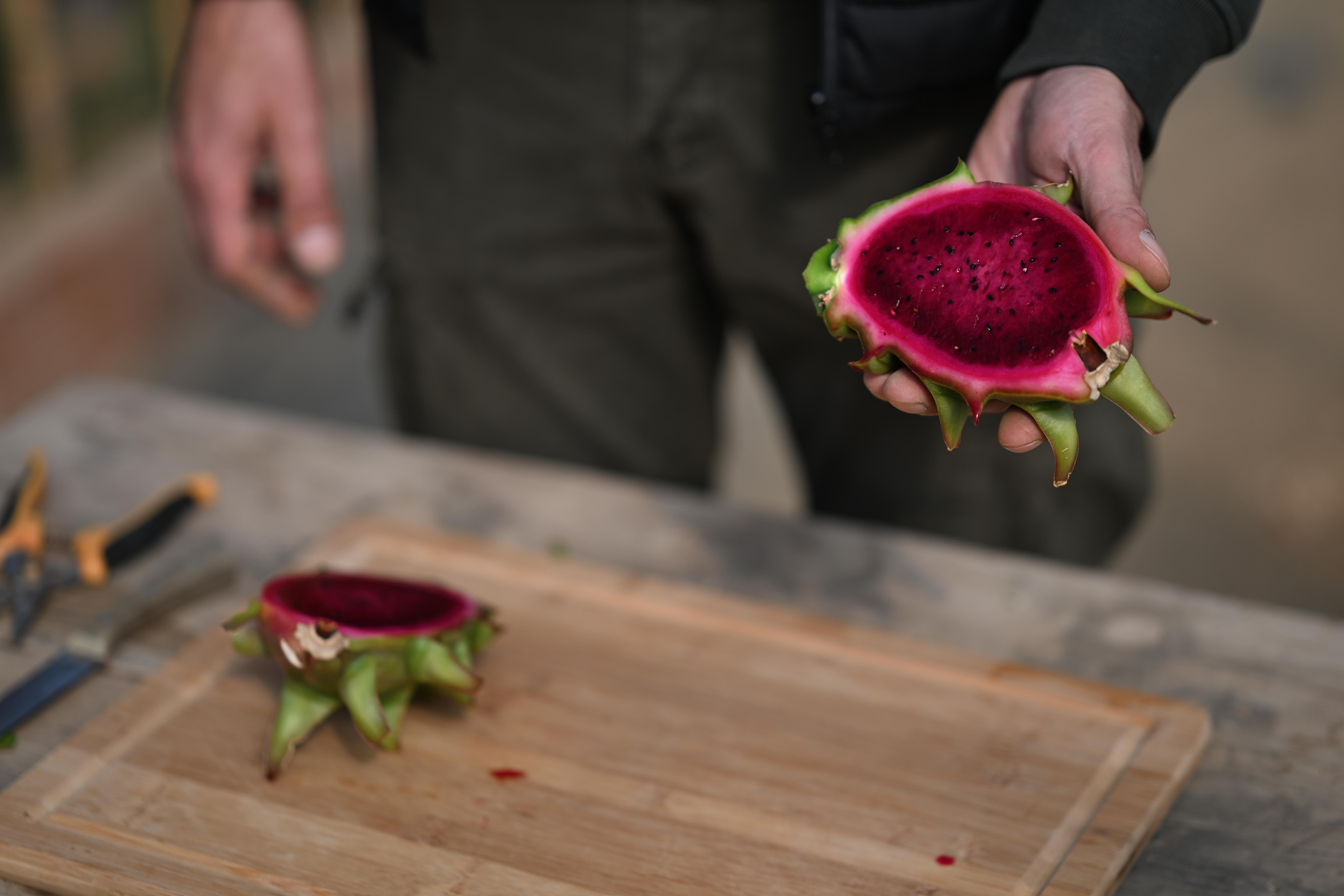 Δοκιμάζουμε ένα dragon fruit -μια εμπειρία που μας μεταφέρει νοερά σε τροπικούς προορισμούς. Το φρούτο, με τη γλυκιά γεύση, τη κόκκινη σάρκα και την ιδιαίτερη υφή του, αποτελεί το επιτυχημένο αποτέλεσμα των πειραματισμών του.
