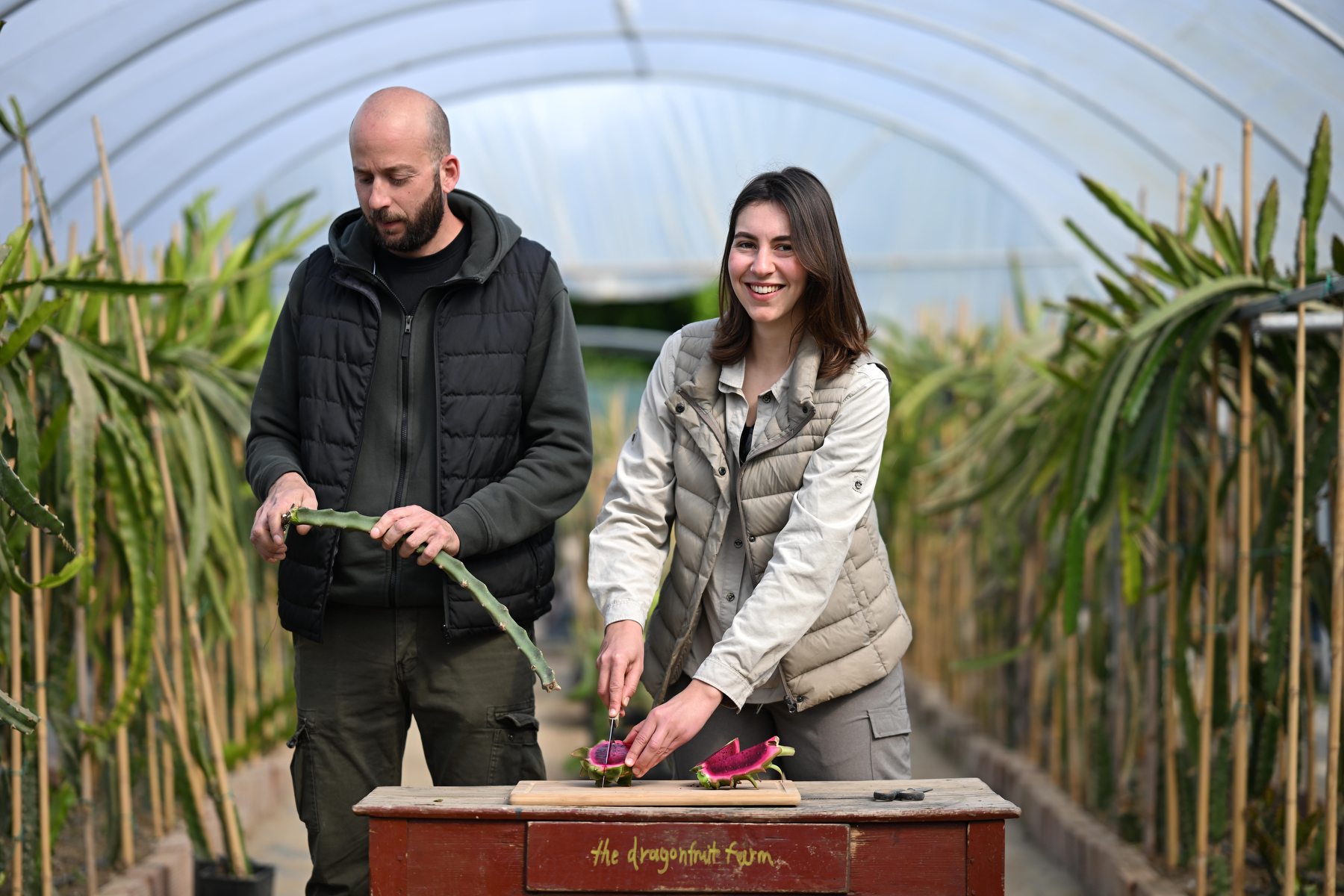 Δίπλα του, η Ιωάννα Κούλη, μια Καλαματιανή αρχιτέκτονας με σπουδές στην Κοπεγχάγη και το Μπράιτον, συμπληρώνει ιδανικά το ρόλο της βοηθού στο πρότζεκτ. «Όταν ταξιδεύουμε, αφιερώνουμε πολύ χρόνο στη δοκιμή νέων φρούτων και στην παρατήρηση των καλλιεργειών που φιλοξενεί ο κάθε τόπος», εξηγεί. «Είναι σαν να μαθαίνεις την ιστορία ενός τόπου μέσα από τις γεύσεις και τα αρώματα της ντόπιας φύσης». Η επιστροφή της στην Καλαμάτα κατά τη διάρκεια της πανδημίας έγινε η προσωπική της αφορμή για μια πιο αρμονική ζωή κοντά στη φύση, προσθέτοντας το δημιουργικό της βλέμμα στην εξέλιξη του The Dragonfruit Farm.