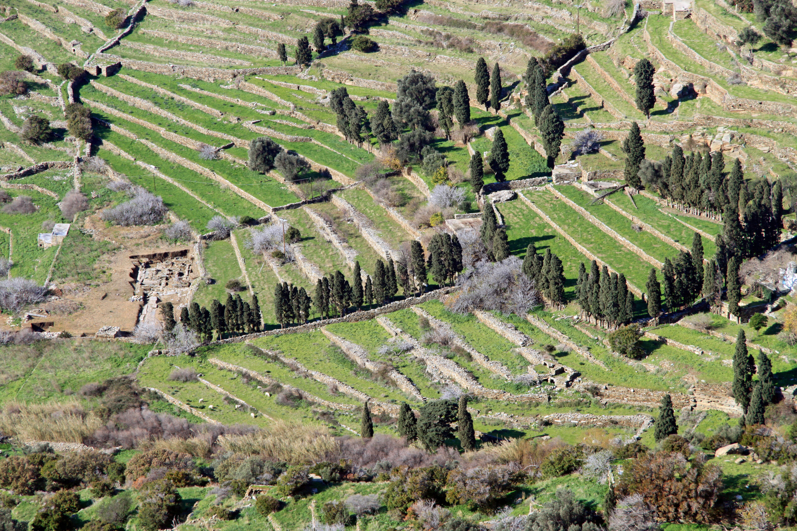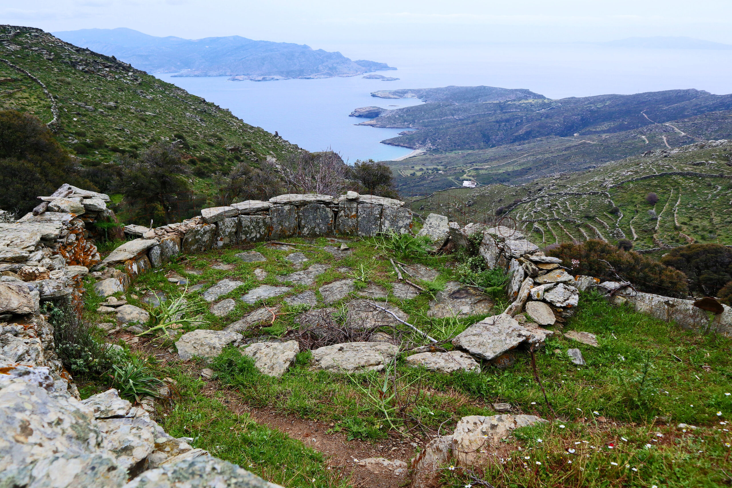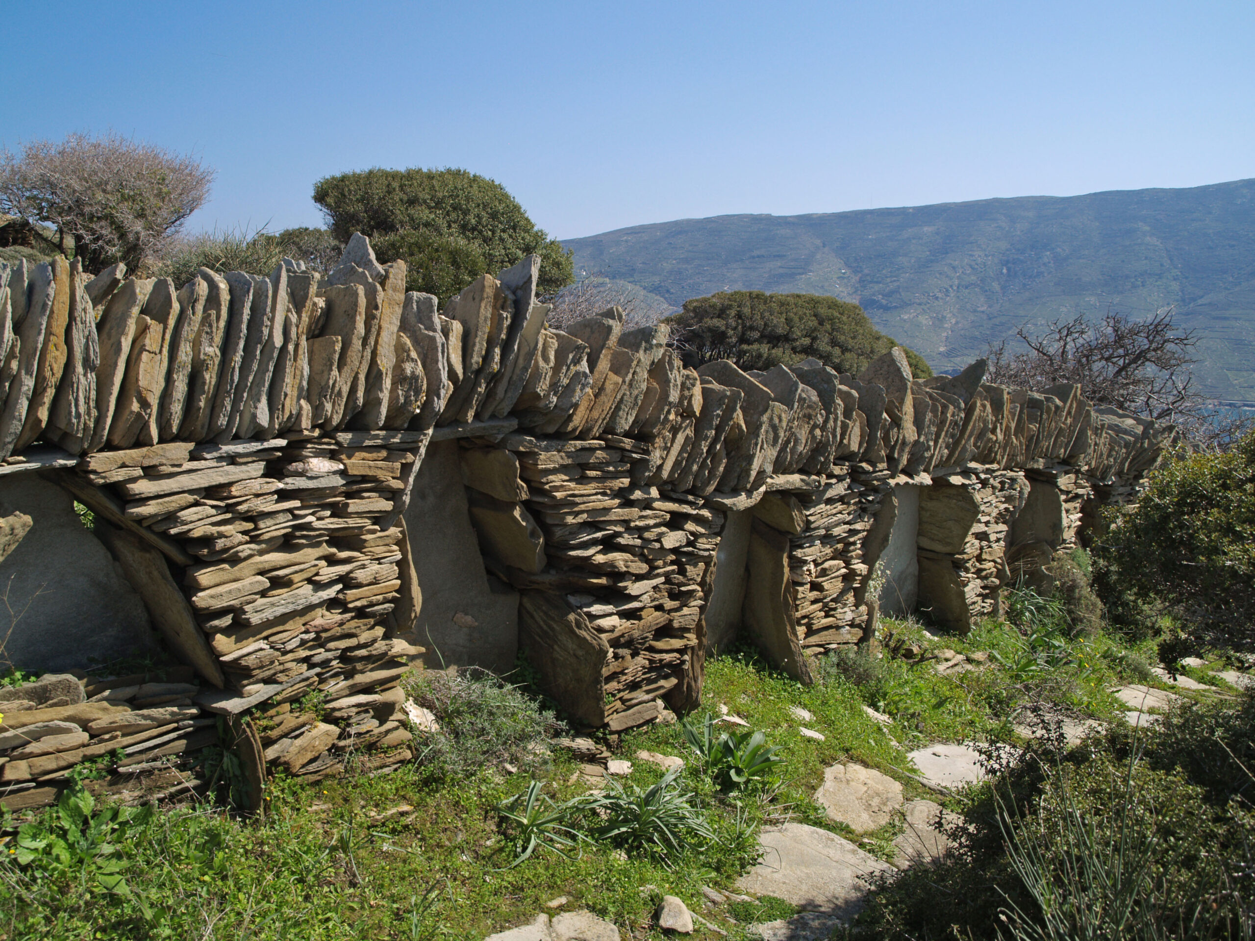 Διασχίζοντας τα αγροτικά τοπία της Άνδρου ανακαλύπτεις πολλούς λαογραφικούς θησαυρούς -από περιστεριώνες στο Κόρθι, μέχρι αλώνια, κονάκια, κρήνες, μύλους και τις καταπληκτικές αιμασιές- τις ξερολιθικές μάντρες που τις βλέπεις παντού. Είναι φτιαγμένες με τη χαρακτηριστική μεγάλη κάθετη πέτρα, το στήμα, στο οποίο στηρίζονται οι οριζόντιες πλάκες. Όπως μάλιστα θα μου πει γελώντας η Αριάνα, εάν ένα drone μπορούσε να μετρήσει όλο το δίκτυο των ξερολιθικών τοίχων στο νησί μπορεί το σύνολο να είναι μεγαλύτερο σε χιλιόμετρα και από το Σινικό Τείχος.
