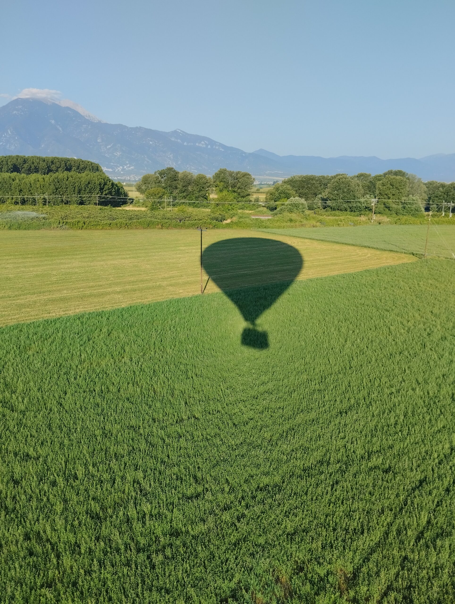 Αν ο Όλυμπος είναι μαγικός από τους πρόποδές του, άλλο τόσο ονειρικός, αινιγματικός και απρόσιτος μοιάζει από το αερόστατο. Δεν ξέρω αν είναι οι περιβόητες ενεργειακές πύλες του Ολύμπου με τα ανεξήγητα φαινόμενα που δίνουν αυτήν την ιδιαίτερη αύρα στην περιοχή, αλλά ο Όλυμπος έχει μία κρυφή άγρια γοητεία που εύκολα νιώθεις, άπαξ και βρεθείς κοντά του. Βαθιές χαράδρες γεμάτες πυκνή βλάστηση και κορυφές σχεδόν εξαφανισμένες μέσα στην πυκνή ομίχλη συνθέτουν το τέλειο καρέ πάνω από έναν εύφορο κάμπο γεμάτο ανθισμένα δέντρα, καλαμπόκια, ηλίανθους και αλωνισμένα σιτοχώραφα. Ανοίγοντας πότε λίγο πότε περισσότερο την στρόφιγγα του προπάνιου, ώστε να γεμίζει συνέχεια με ζεστό αέρα το μπαλόνι, ο Παύλος κρατούσε το αερόστατο σταθερό προς μία κατεύθυνση χαρίζοντάς μας μία διαφορετική όψη του πιερικού κάμπου.