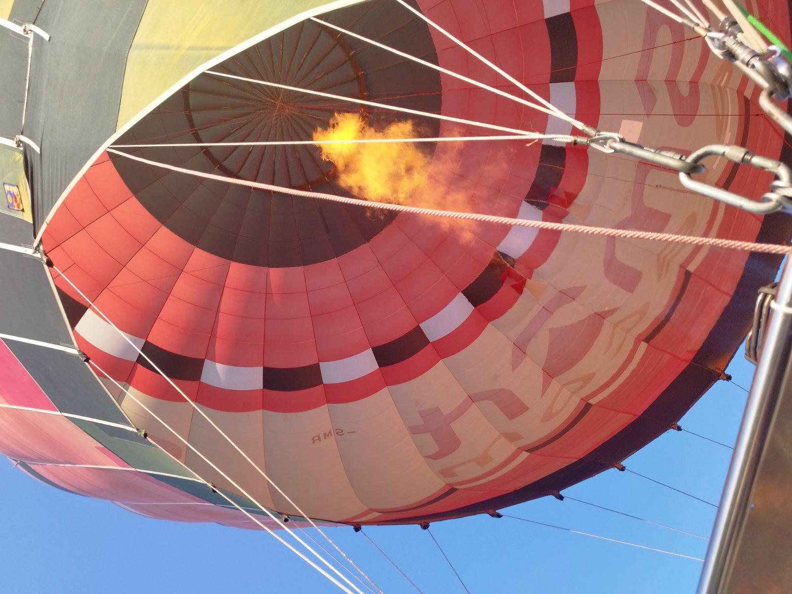 Η απογείωση είναι αρκετά γρήγορη -είναι απίστευτο το πόσο γρήγορα απογειώνεται ένα αερόστατο- και μέσα σε λίγα λεπτά θαυμάζουμε ήδη ένα μεγάλο κομμάτι του εύφορου κάμπου της Πιερίας από ψηλά. Η αλήθεια είναι ότι μπαίνοντας σ’ ένα αερόστατο ξεχνάς για λίγο -λόγω ενθουσιασμού- την αίσθηση του κινδύνου. Στο αερόστατο πρέπει να είσαι πολύ προσεκτικός με κάθε κίνησή σου, γιατί εδώ το μόνο που σε χωρίζει από το απόλυτο κενό είναι το τοίχωμα ενός καλαθιού. Ωστόσο, το τέλειο αντίδοτο στην υψοφοβία δεν είναι άλλο από την καταπληκτική θέα που κόβει την ανάσα.