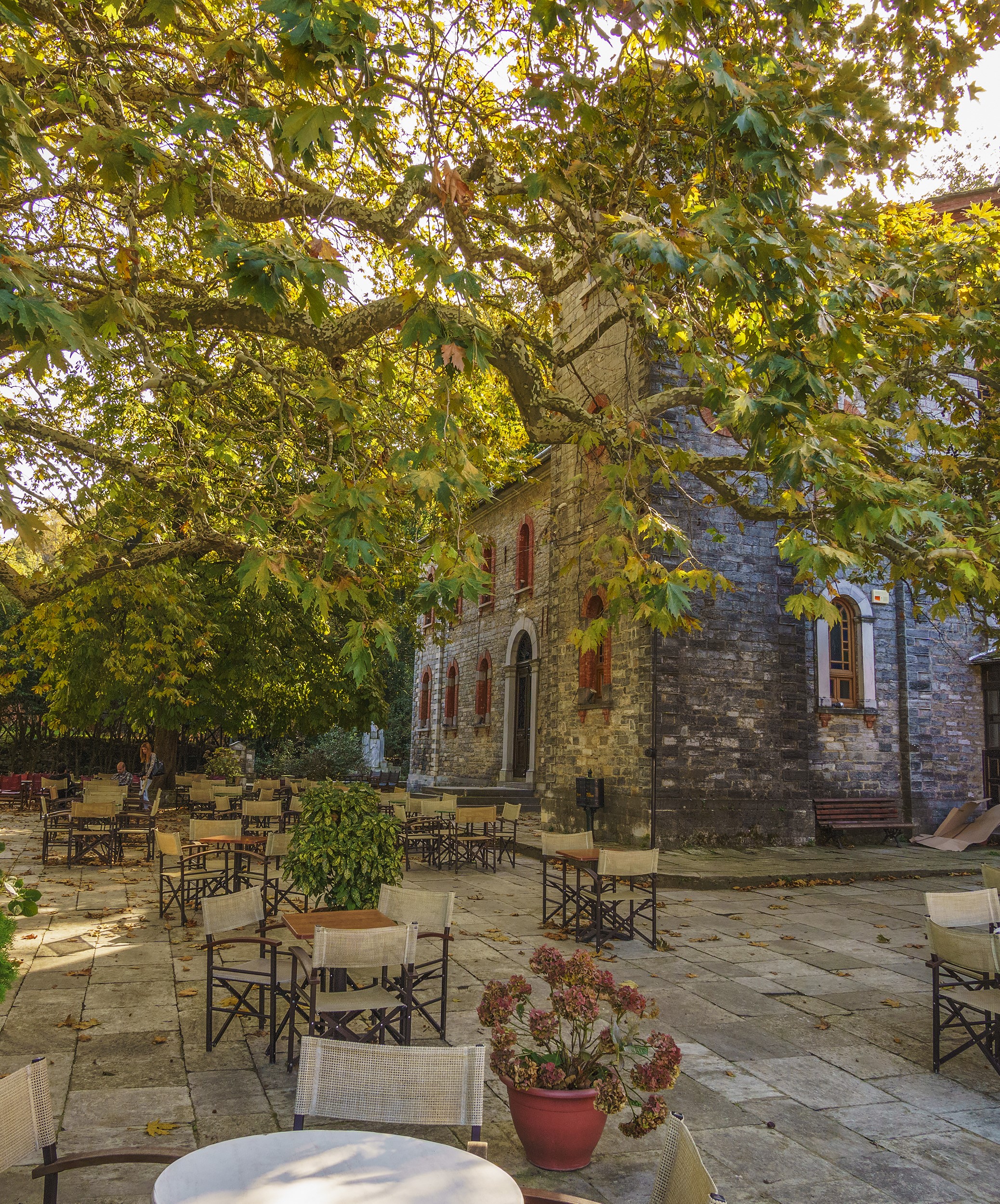 Στην μικρή πλατεία του Ταξιάρχη κυριαρχεί η μνημειακή εκκλησία του 1786 και αν είναι ανοιχτή αξίζει να μπείτε για να θαυμάσετε το ξυλόγλυπτο, βενετσιάνικου τύπου, τέμπλο, που ολοκληρώθηκε το 1749. Πιείτε νερό από την κρήνη με τους τέσσερις κρουνούς και καθίστε για φαγητό και καφέ στα τραπεζάκια κάτω από τα ψηλά πλατάνια.