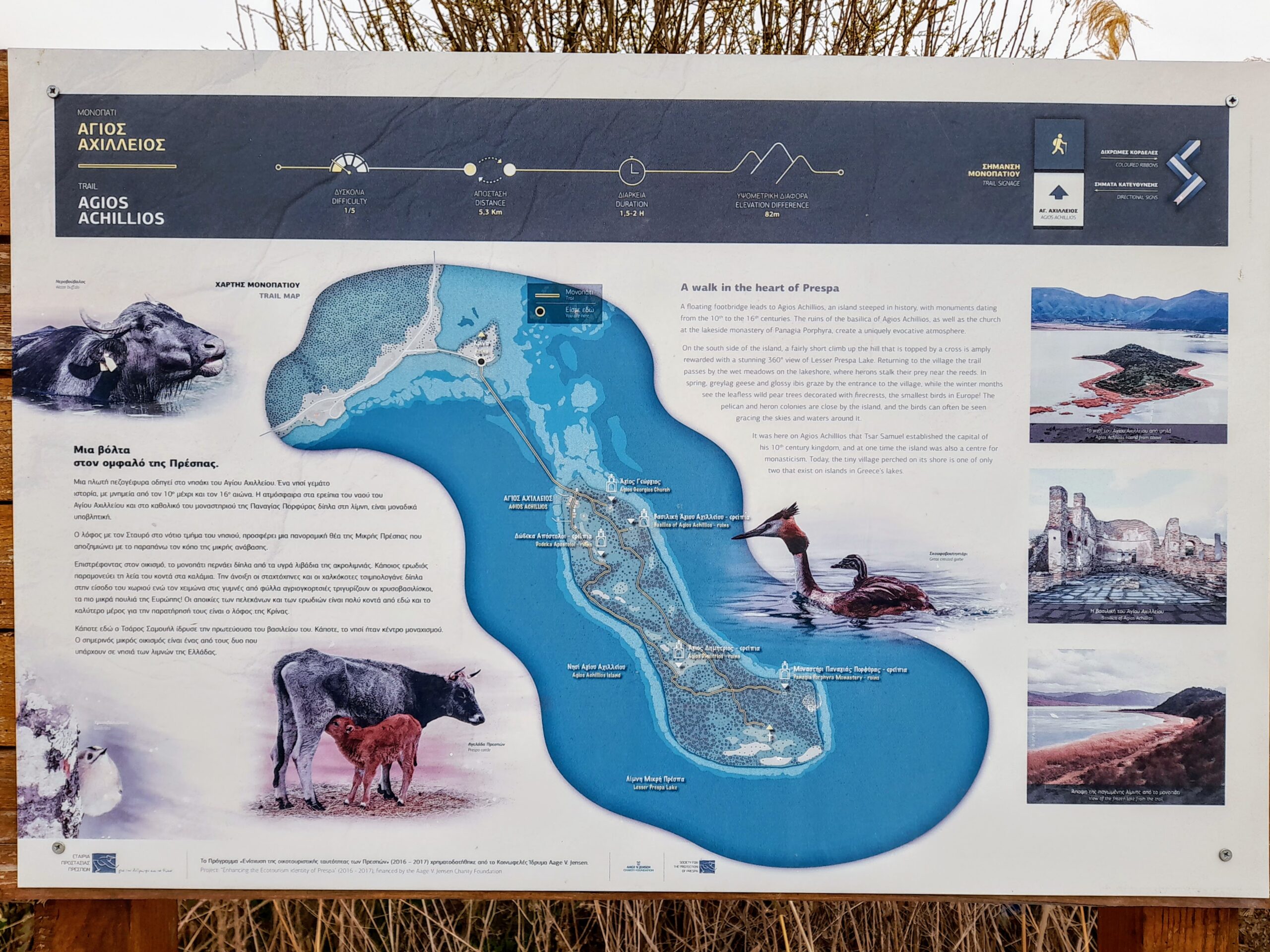 Για να φτάσετε στο νησάκι-σύμβολο των Πρεσπών θα διασχίσετε την μήκους 650 μ., πεζογέφυρα που το ενώνει με την κοντινότερη απέναντι στεριά. Ξεκινήστε από τη διαδρομή στην ανατολική πλευρά του νησιού περνώντας από τον ναό του Αγίου Γεωργίου, του 15ου αιώνα. Επόμενος σταθμός σας, το μνημείο –σήμα κατατεθέν– που έδωσε και το όνομα στο νησί, η βασιλική του Αγίου Αχιλλείου που κτίστηκε στα τέλη του 10ου αιώνα, με μεγάλες διαστάσεις (20Χ47μ.) και σκοπό να στεγάσει τα λείψανα του αγίου που μεταφέρθηκαν εδώ από τη λεηλατημένη Λάρισα.