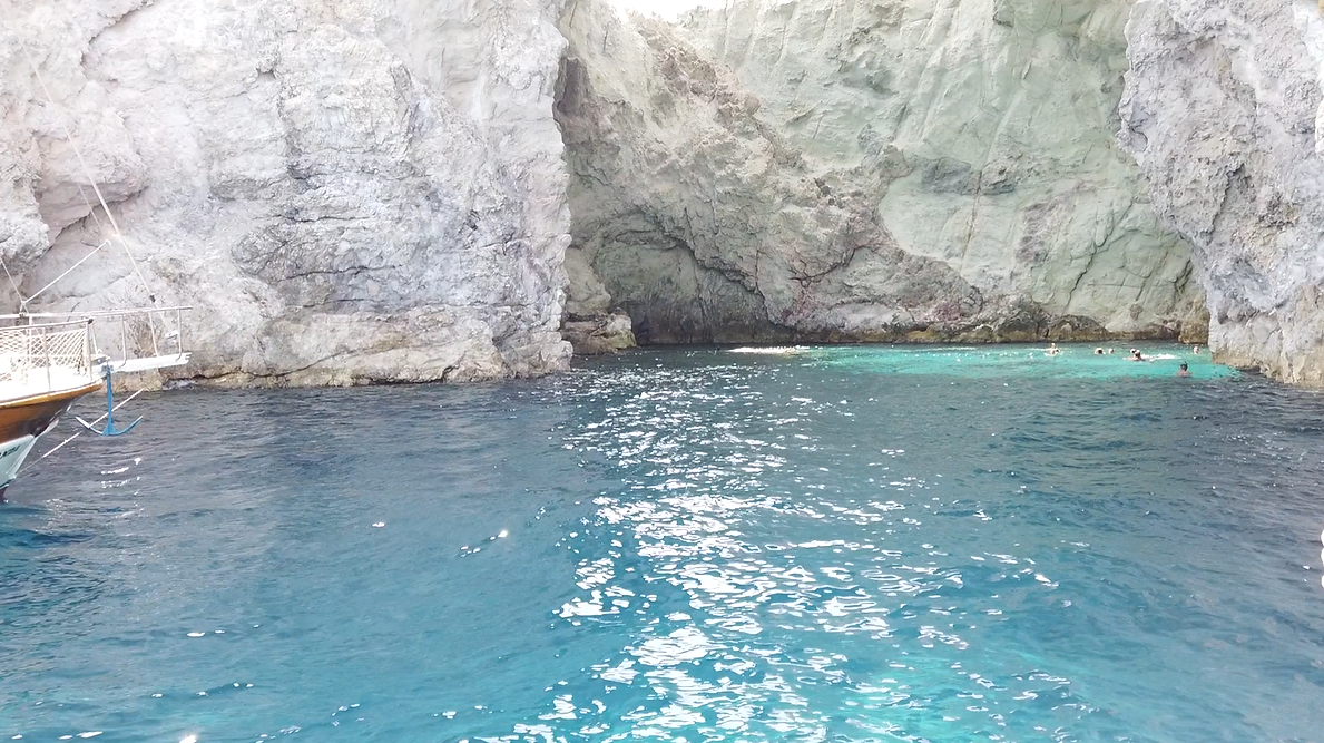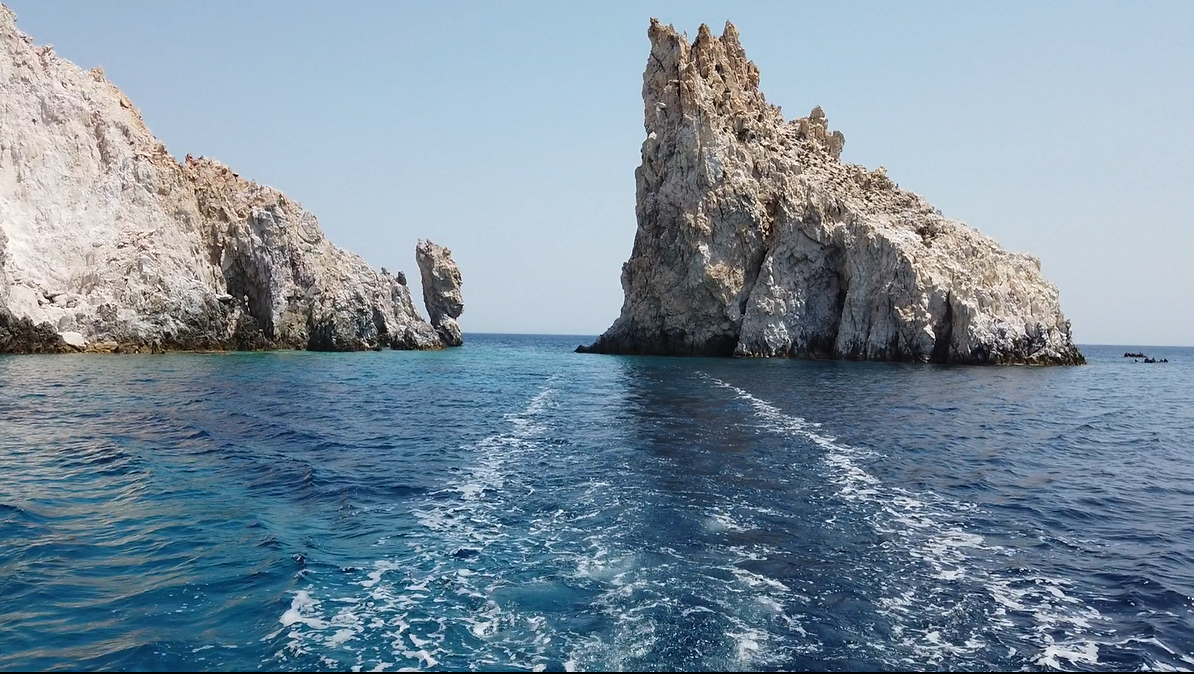 Συνεχίζοντας το πλοιάριο τη διαδρομή θα σταματήσετε για βουτιές στα φημισμένα «Γαλάζια Νερά» ή στην «Πισίνα», δύο θαλάσσια σημεία που το όνομα τους παραπέμπει στο πως μοιάζουν