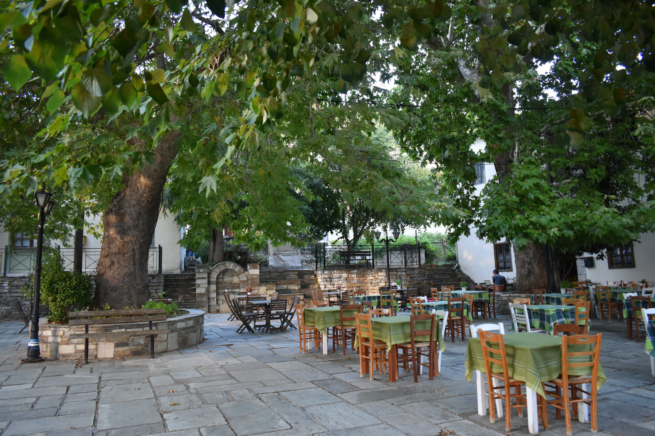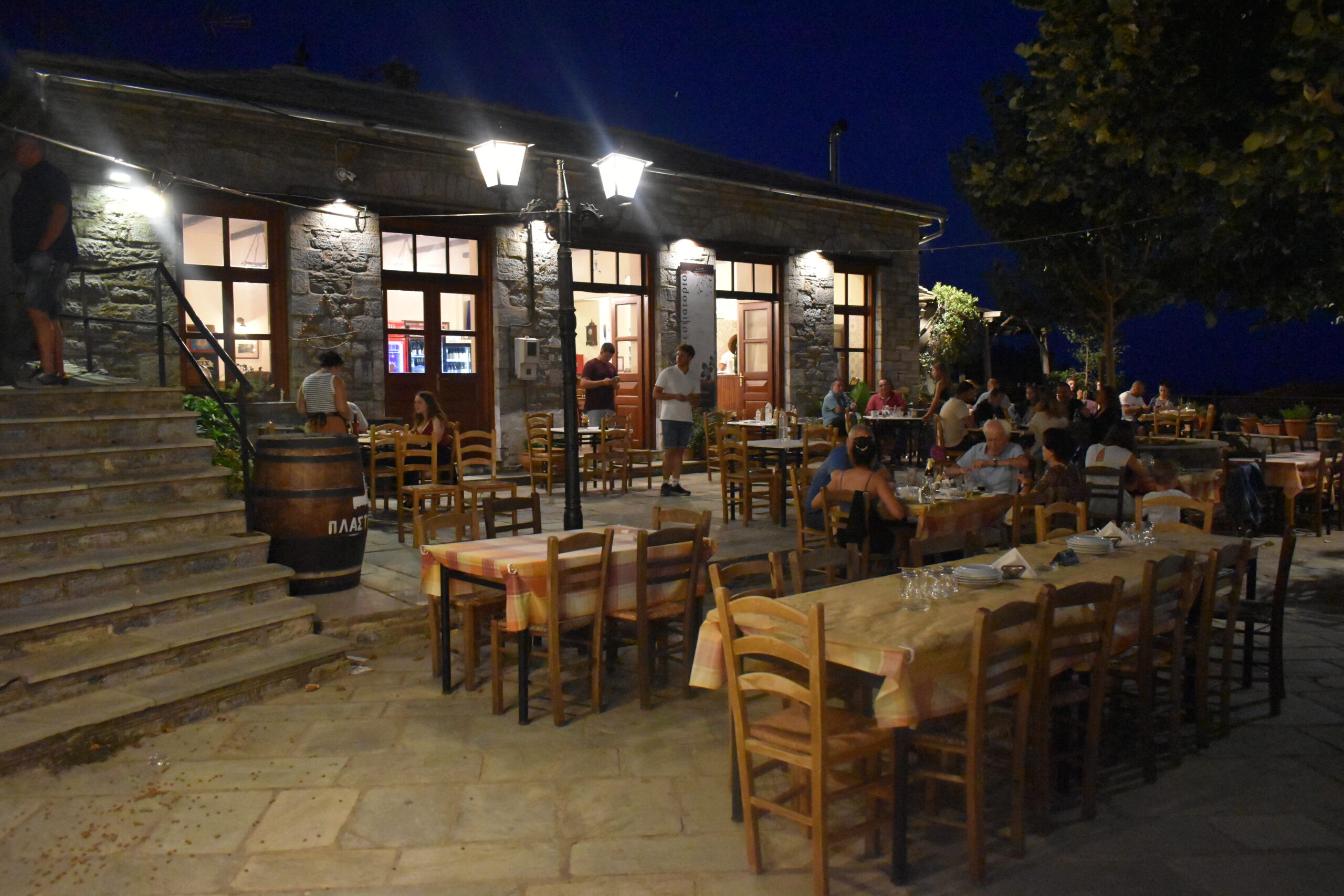 Ένα επίπεδο πιο πάνω, τα πλατάνια κυριαρχούν στην πλατεία που αποτελεί must προορισμό για τους καλοφαγάδες, οι οποίοι συρρέουν για τα ψητά στα κάρβουνα και στη σούβλα που ετοιμάζει καθημερινά ο «Γιάννης ο Γερμανός». Το παρατσούκλι «Γιάννης ο Έλληνας» που είχε στη Γερμανία ο ιδιοκτήτης της παραδοσιακής ταβέρνας, άλλαξε επιστρέφοντας στην Ελλάδα και πλέον, εδώ και σχεδόν 20 χρόνια, ο Γερμανός όπως αποκαλείται απ΄όλους, αποτελεί εγγύηση για τα ζουμερά, καλοψημένα μπριζολάκια και λουκάνικα, το νοστιμότατο κοντοσούβλι και το χοιρινό κότσι, με κορυφαία τα βουβαλίσια σουτζουκάκια, ουσιαστικά μακρόστενα μπιφτέκια από βουβαλίσιο κρέας, αρτυμένα και ψημένα στην εντέλεια. Το ψήσιμο όλων των κρεατικών επιμελείται ακούραστα, καθημερινά και όλο το χρόνο που παραμένει ανοιχτή η ταβέρνα, ο ίδιος ο ιδιοκτήτης, ενώ μπορείτε να συνοδεύσετε με τη βολιώτικη μπύρα Πλάστιγγα που αξίζει να δοκιμάσετε.