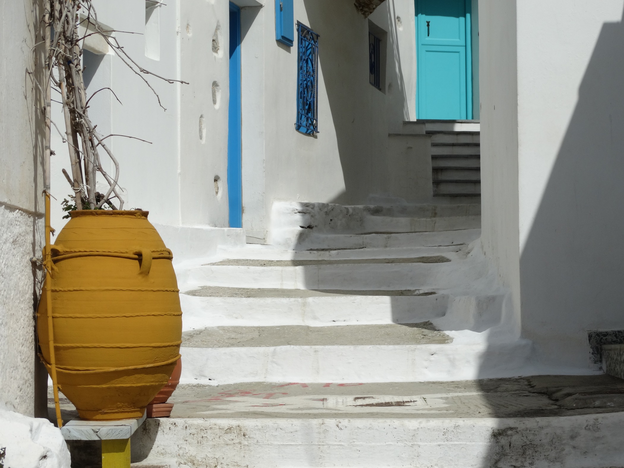 Μόλις η ώρα πλησιάσει 8 και νιώσεις τον ήλιο να σου τσουρουφλίζει το πρόσωπο, είναι η κατάλληλη στιγμή για μια βόλτα στα λευκά στενά της Χώρας. Οι πιο πολλοί κάτοικοί της κοιμούνται, ενώ οι λίγοι καταστηματάρχες που ετοιμάζονται να ανοίξουν νωχελικά τα μαγαζιά τους φαίνονται στο φόντο σαν τους πιο εκπαιδευμένους κομπάρσους. Και πόσα χρώματα έχει αυτή η Χώρα κάθε πρωί. Είναι το τέλειο κάδρο.