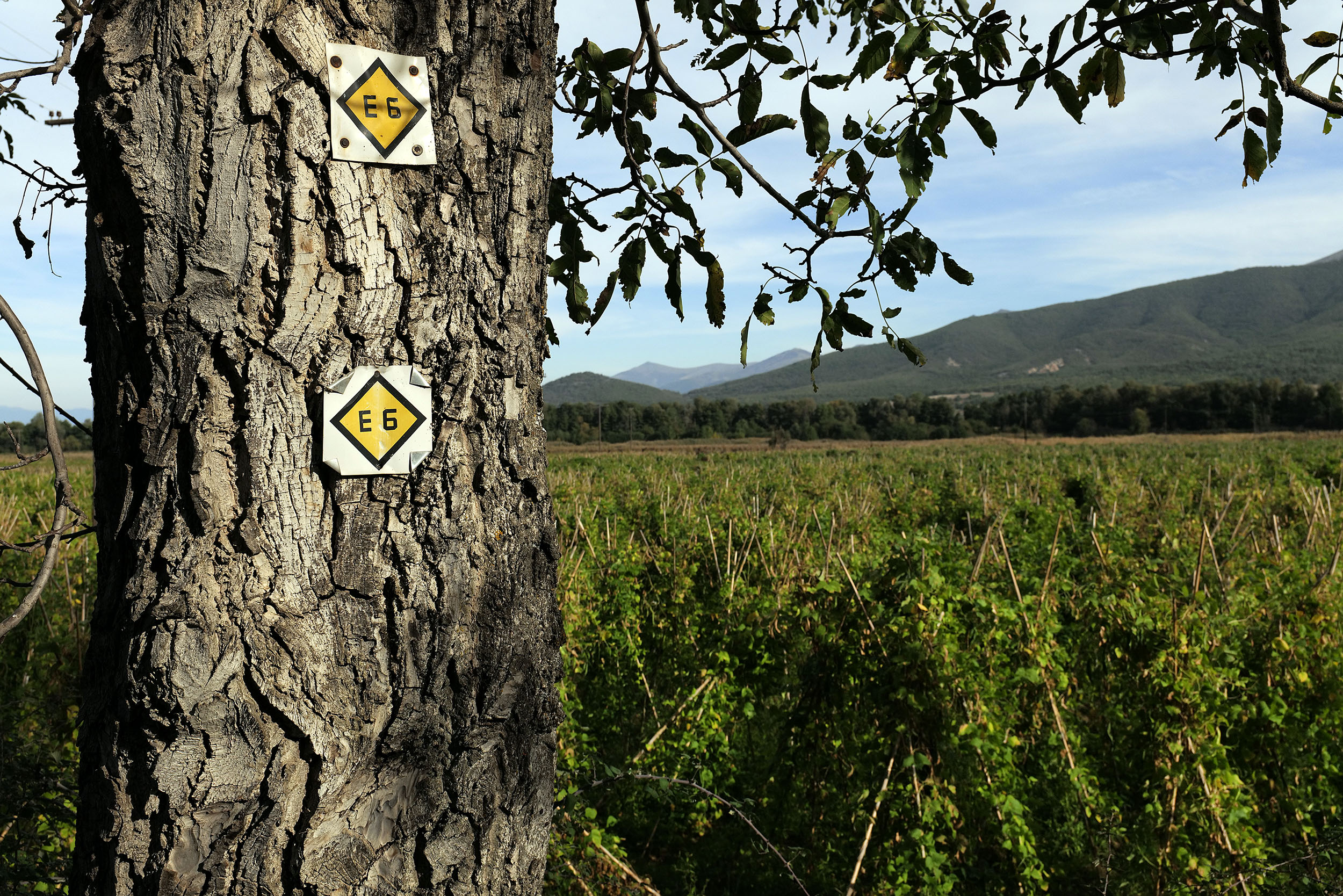Η διαδρομή προς τις λίμνες των Πρεσπών περνά από το χιονοδρομικό κέντρο της Βίγλας, πράσινο, πορτοκαλί, νωπό και άχιονο ακόμη, μαρτυρά στη φαντασία τις ολόλευκες διαδρομές του αφού έρθει το χιόνι. Το Πισοδέρι, σκαρφαλωμένο στην πλαγιά με τους ξενώνες και τα ταβερνάκια του να αναμένουν τους επισκέπτες της περιοχής, σηματοδοτεί την κάθοδο προς τις λίμνες. Σε μια στροφή, κάτω από μια ημίγυμνη βουνοκορφή, μια σειρά από ανεμογεννήτριες αγγίζουν τον ουρανό. Ο ορίζοντας ανοίγει φτάνοντας στο επίπεδο του νερού στις μοιρασμένες λίμνες των Πρεσπών. Φασολιές παντού, ένα δεκαήμερο πριν την έναρξη της συγκομιδής του πιο γνωστού οσπρίου της περιοχής, αλλού χλωρές και πράσινες, αλλού πιο ξερές και καφετί, σαν παγανιστικές κατασκευές με τα καλάμια που τις στηρίζουν, ορθώνονται όπου και να γυρίσει το βλέμμα. Το μονοπάτι Ε4 περνά από εδώ, μια υπέροχη στάση στο αμέτρητο ταξίδι του.