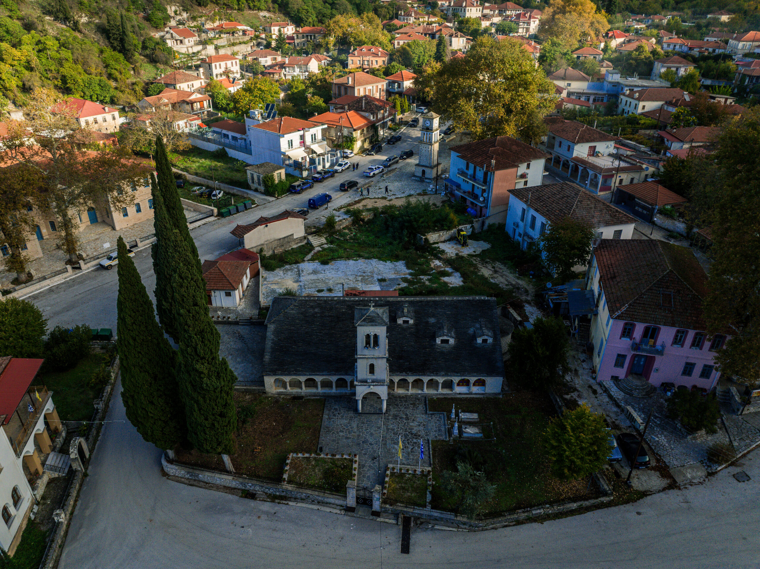 Φεύγοντας από το καφενείο του Μάνθου, κοιτάζω πίσω την πλατεία. Ο ναός της Κοιμήσεως της Θεοτόκου, με το ξυλόγλυπτο τέμπλο του 1850 και τις τοιχογραφίες του 1646, δεσπόζει σιωπηλός. Γύρω του, τα πέτρινα αρχοντικά φαίνονται σχεδόν νοσταλγικά για τις εποχές που οι αυλές τους γέμιζαν φωνές.
