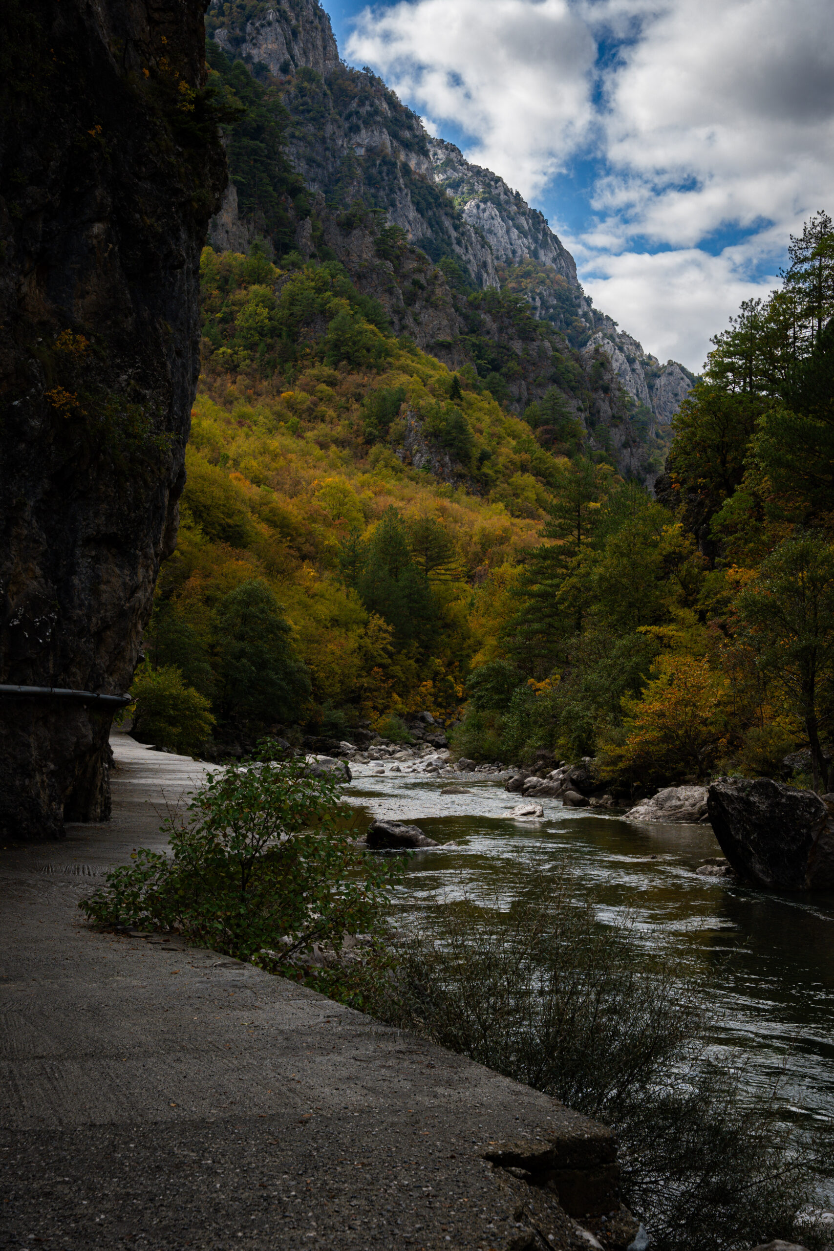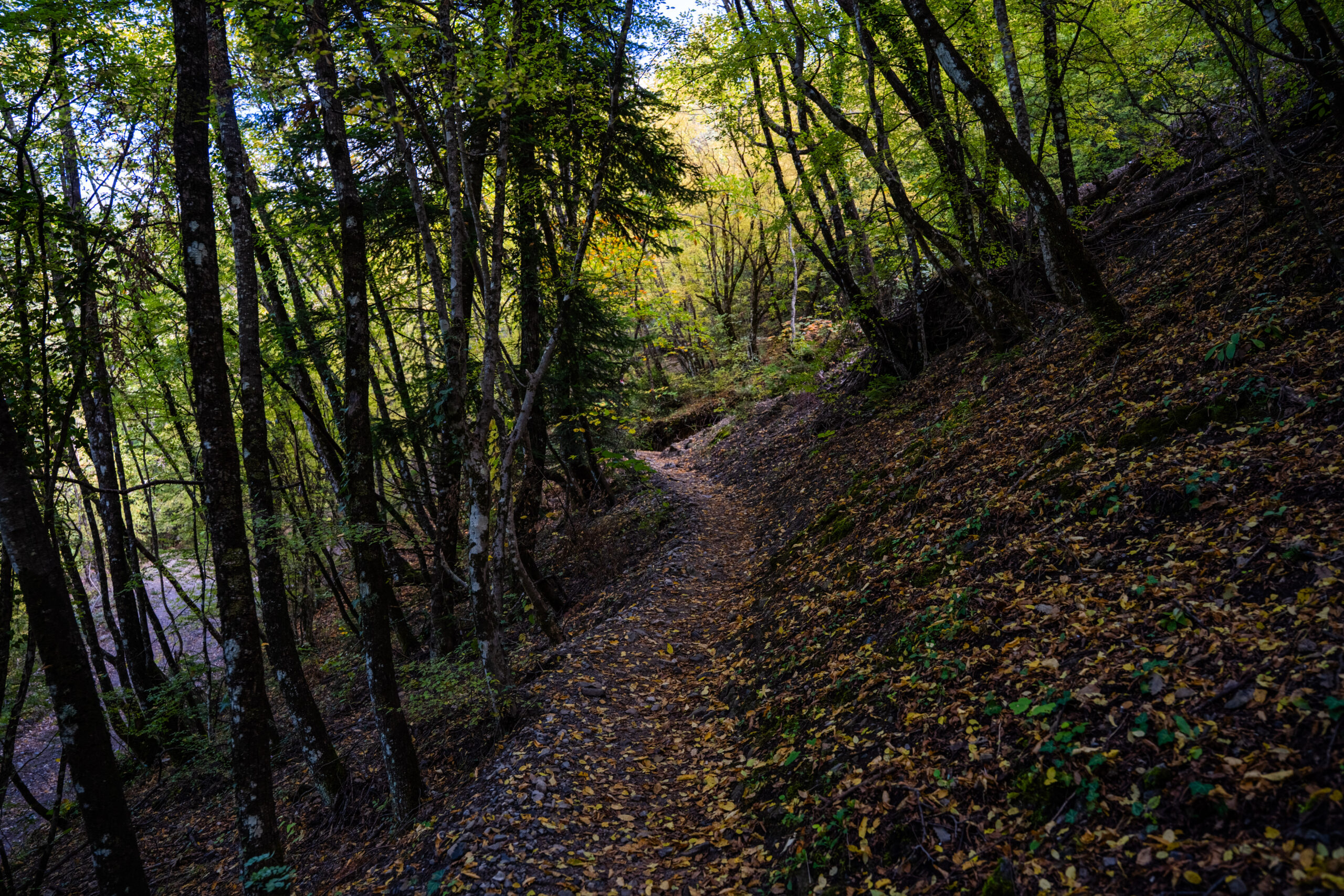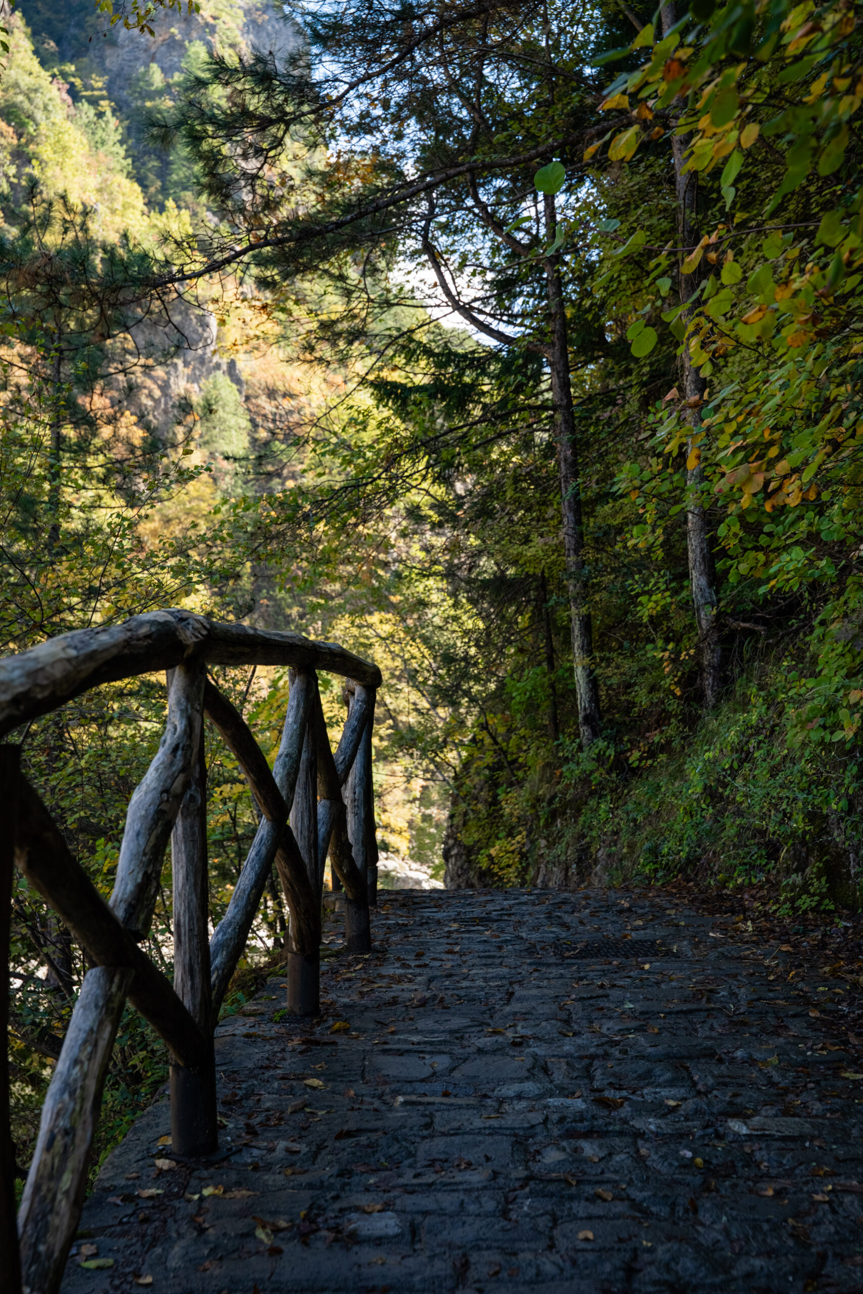 Μετά από περίπου σαράντα λεπτά παράλληλα με τον ποταμό, το μονοπάτι στρίβει και αρχίζει να ανηφορίζει. Η ανάβαση γίνεται μέσα από δάσος, απομακρύνοντας σταδιακά τον περιπατητή από τον Αώο. Εδώ, το Epirus Trail συναντά το παλαιότερο μονοπάτι, και η επιλογή είναι προφανής. Το παλιό μονοπάτι προσφέρει μια πιο άμεση αίσθηση της άγριας αρχιτεκτονικής της χαράδρας.