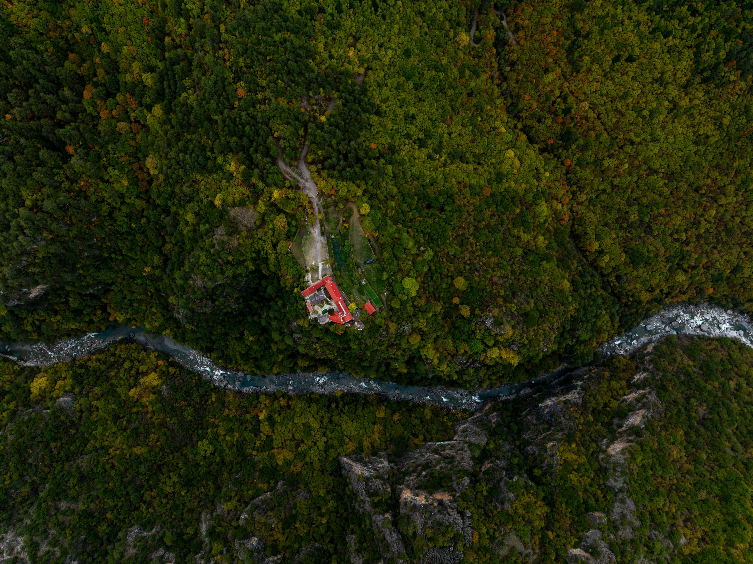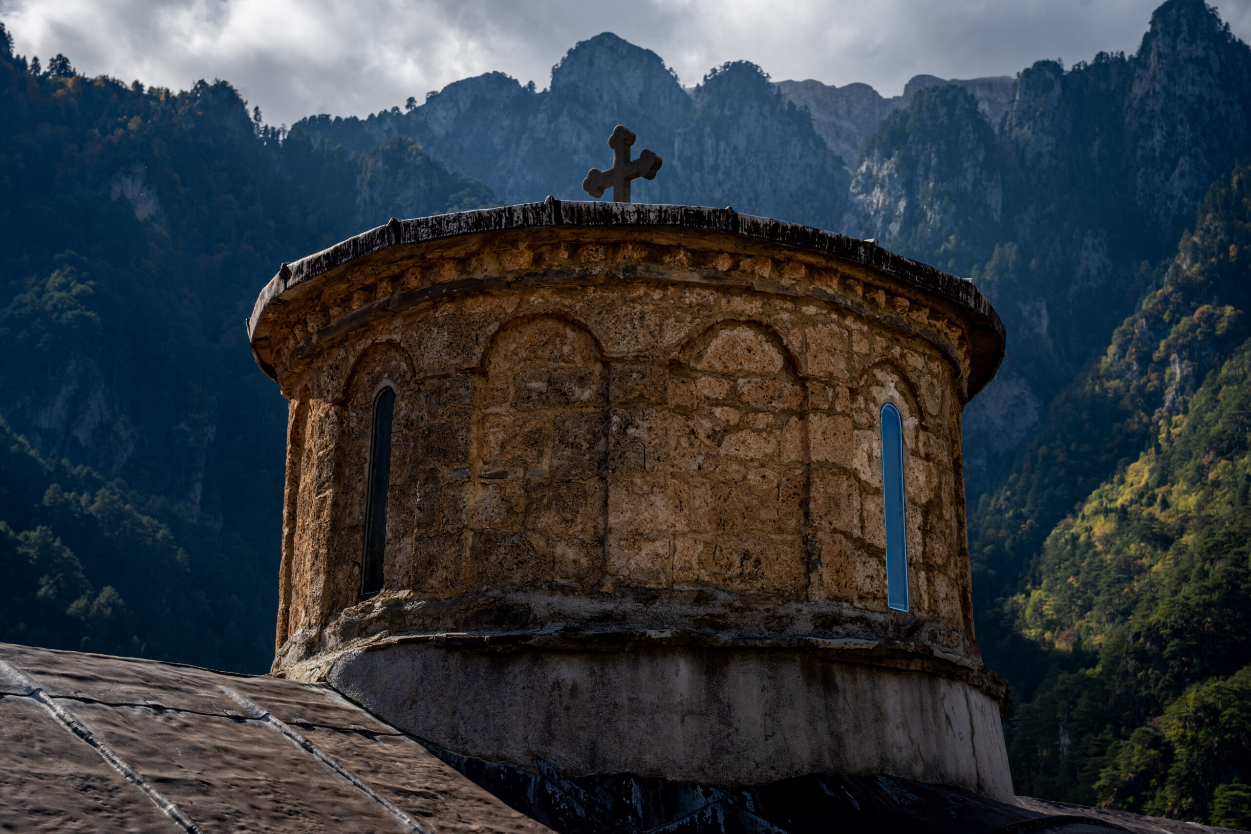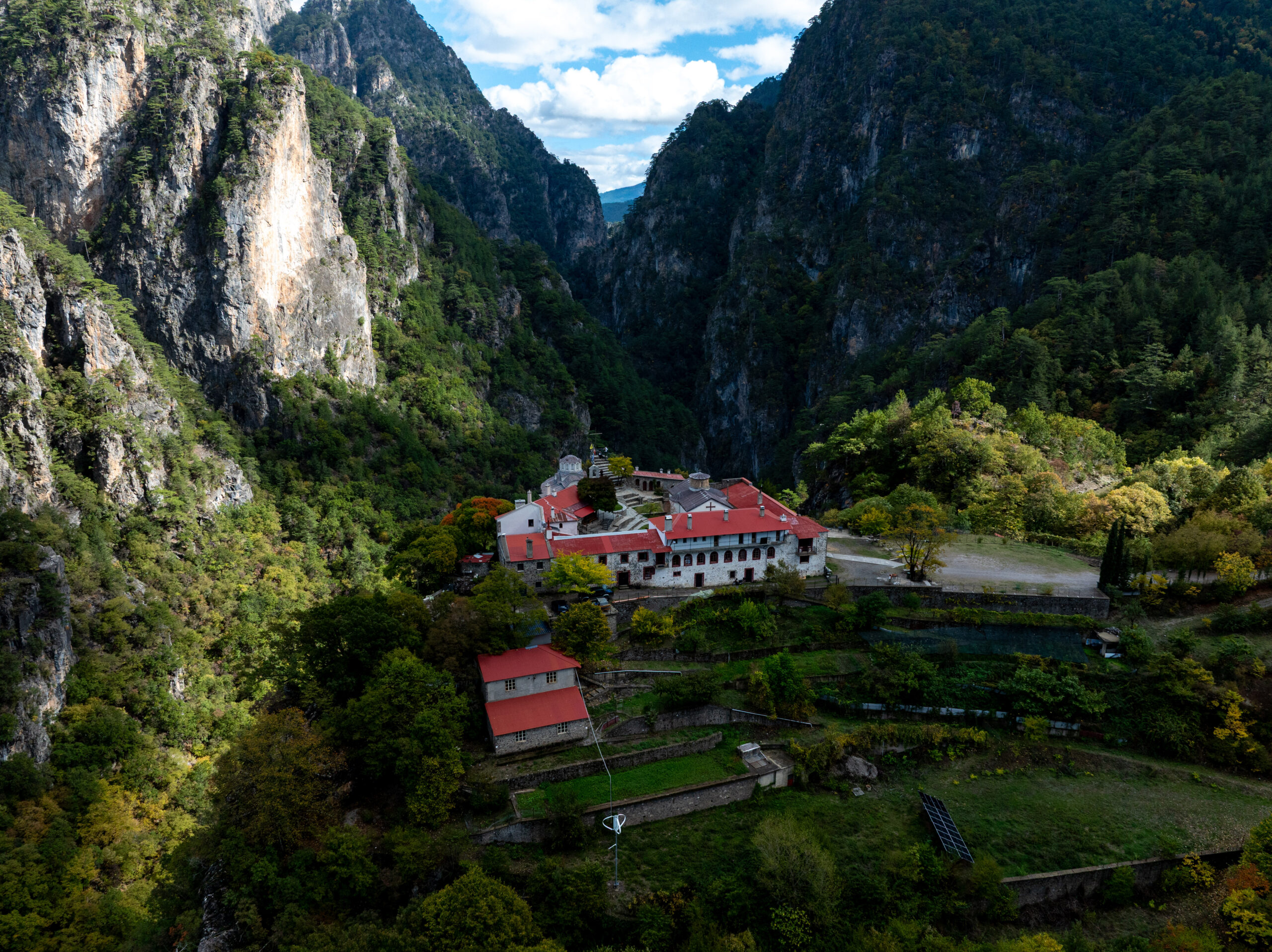 Από την κορυφή, δίπλα στη μονή, η θέα της χαράδρας αποκαλύπτει την κλίμακα του τοπίου. Ο Αώος τρέχει βαθιά κάτω, οι πλαγιές της Τύμφης υψώνονται αδιάφορες, και η μονή στέκεται στη μέση, ανθρώπινη παρουσία σε έναν κόσμο που δεν χρειάζεται τον άνθρωπο για να υπάρξει, αλλά του προσφέρει καταφύγιο όταν τον αναζητά.