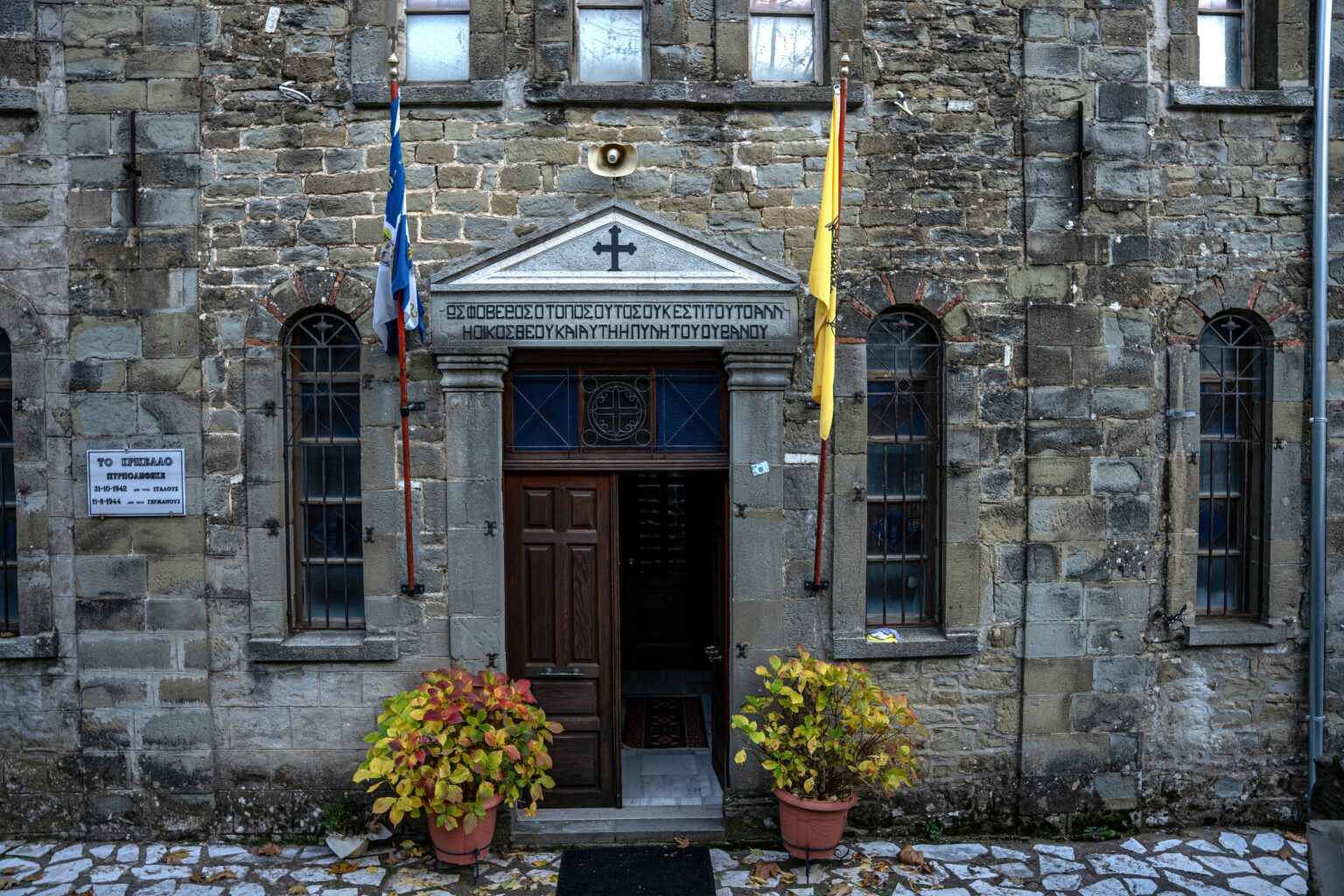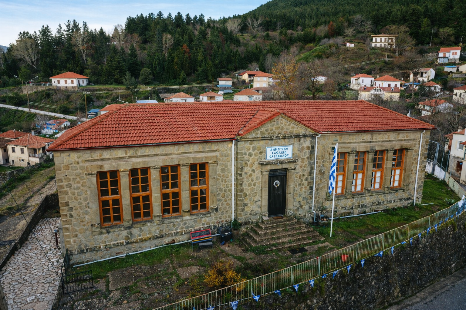 Το διτάξιο δημοτικό σχολείο χτίστηκε το 1909. Πελεκητή πέτρα, συμμετρική πρόσοψη, ένα αέτωμα στην είσοδο που θυμίζει νεοκλασικό σε μικρογραφία. Σήμερα είναι διατηρητέο. Αλλά η ιστορία του δεν κρύβεται στην αρχιτεκτονική. Στην Κατοχή, εδώ μέσα λειτούργησε ως στέκι στελεχών του ΕΛΑΣ, και η σημαία του σχολείου ήταν το πρώτο λάβαρο που παραδόθηκε στον Άρη Βελουχιώτη. Μαθητές δεν υπάρχουν πια. Αντί για αυτούς, ο χώρος φιλοξενεί εκθέσεις, μουσικά βράδια και κομμάτια από τη λαογραφική συλλογή του χωριού.