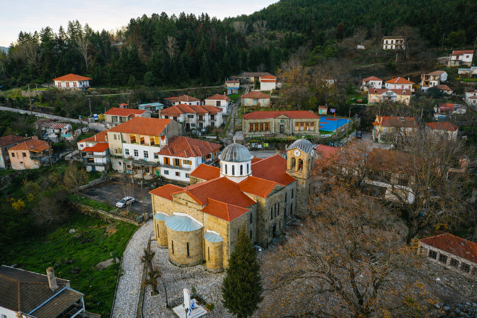 Δίπλα τους βρίσκεται η πλατεία: υπεραιωνόβια πλατάνια, πέτρινα σπίτια και στο κέντρο ο ναός του Αγίου Νικολάου, χτισμένος το 1903 με εθελοντική εργασία ολόκληρου του χωριού. Ο κάθε κάτοικος κουβάλησε και από μερικές πέτρες. Ο ναός, με το ψηλό καμπαναριό και τις εικόνες του, παραμένει η συλλογική υπερηφάνεια του χωριού.