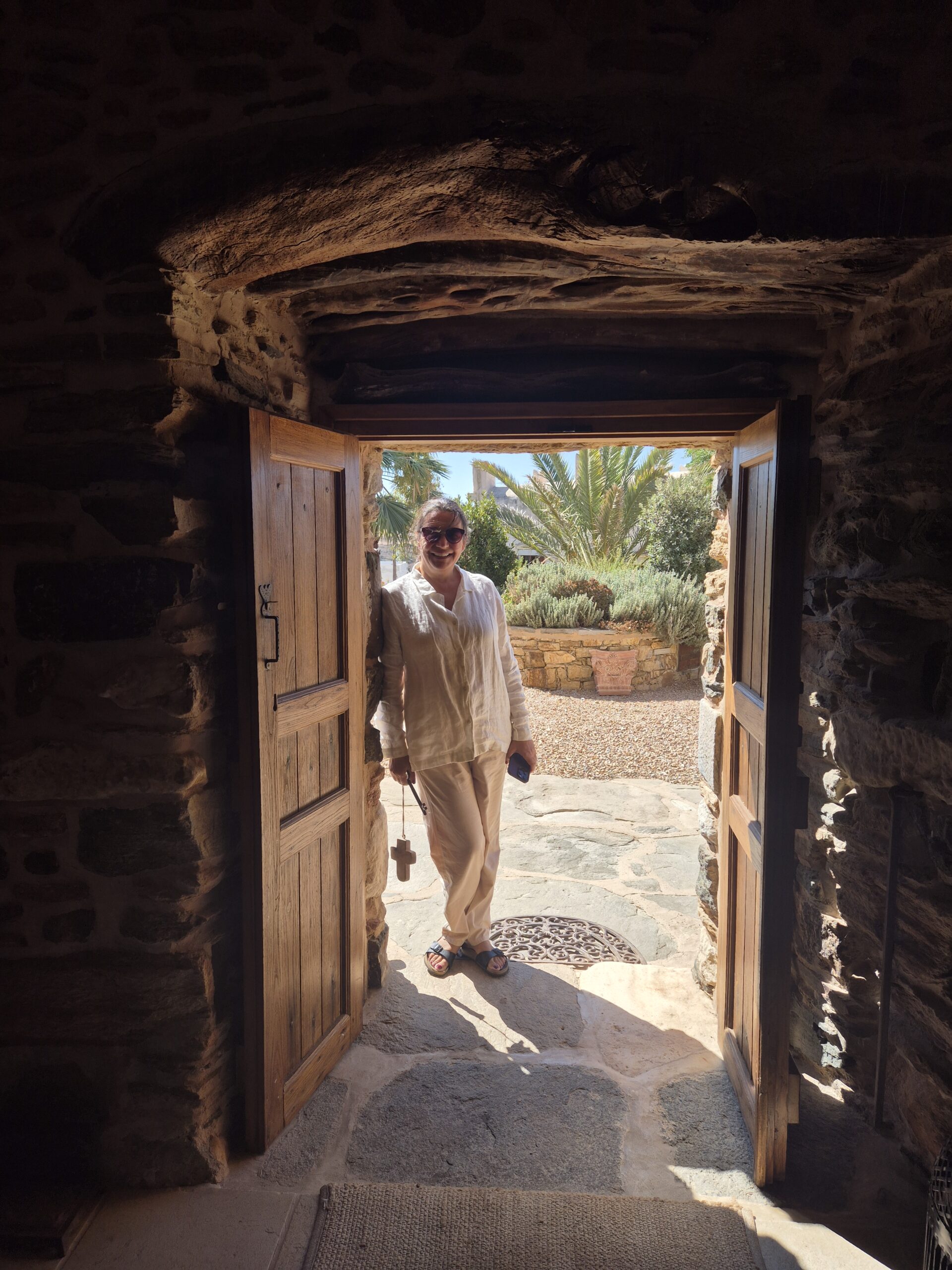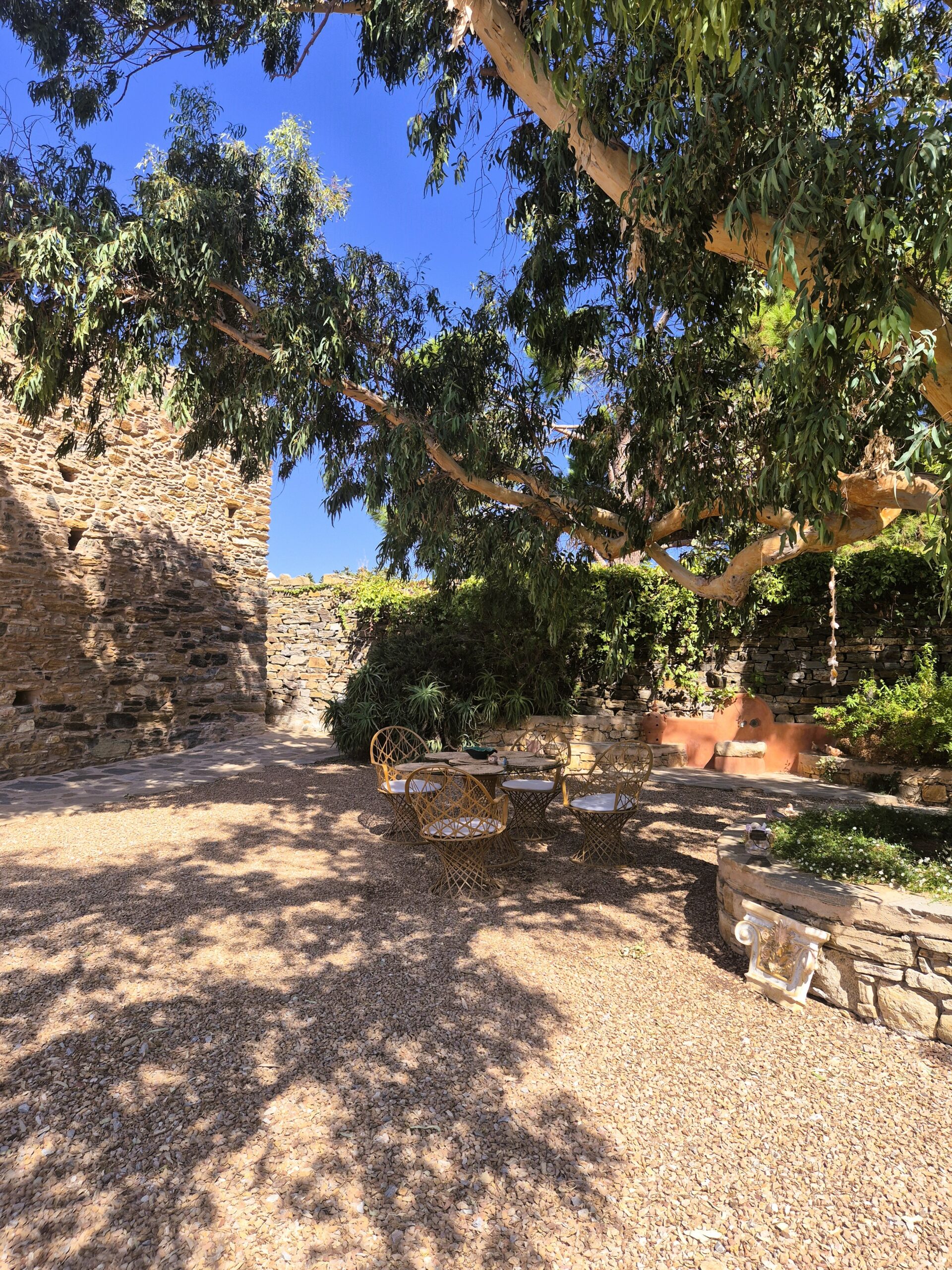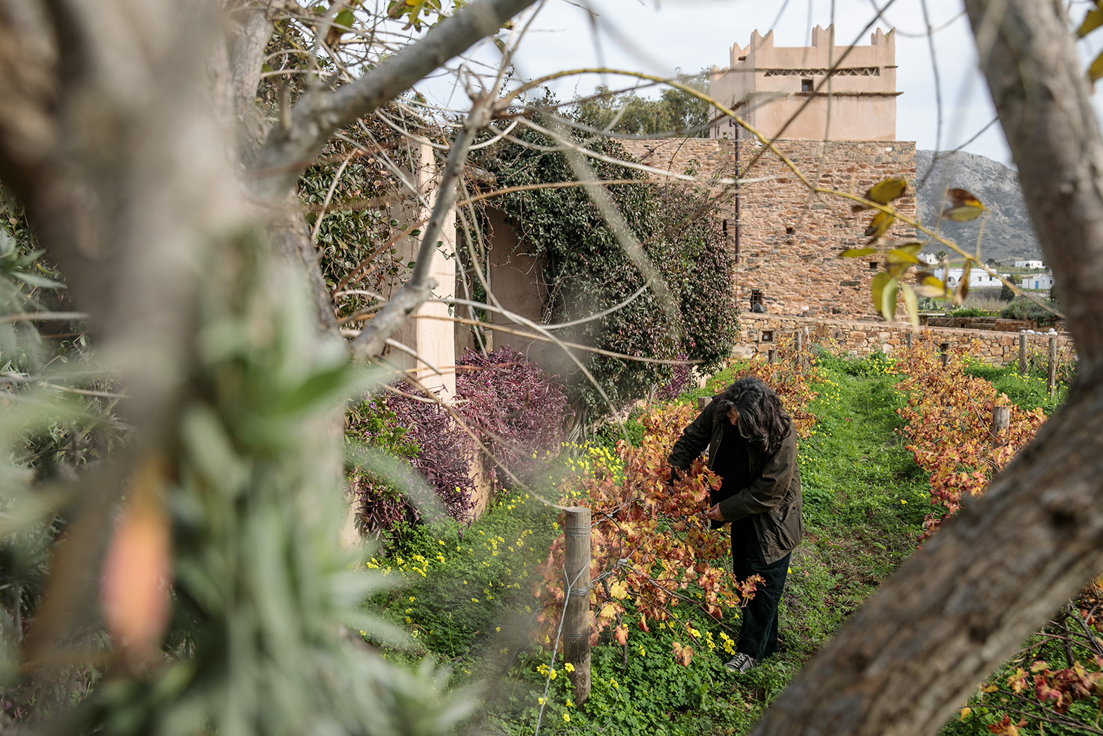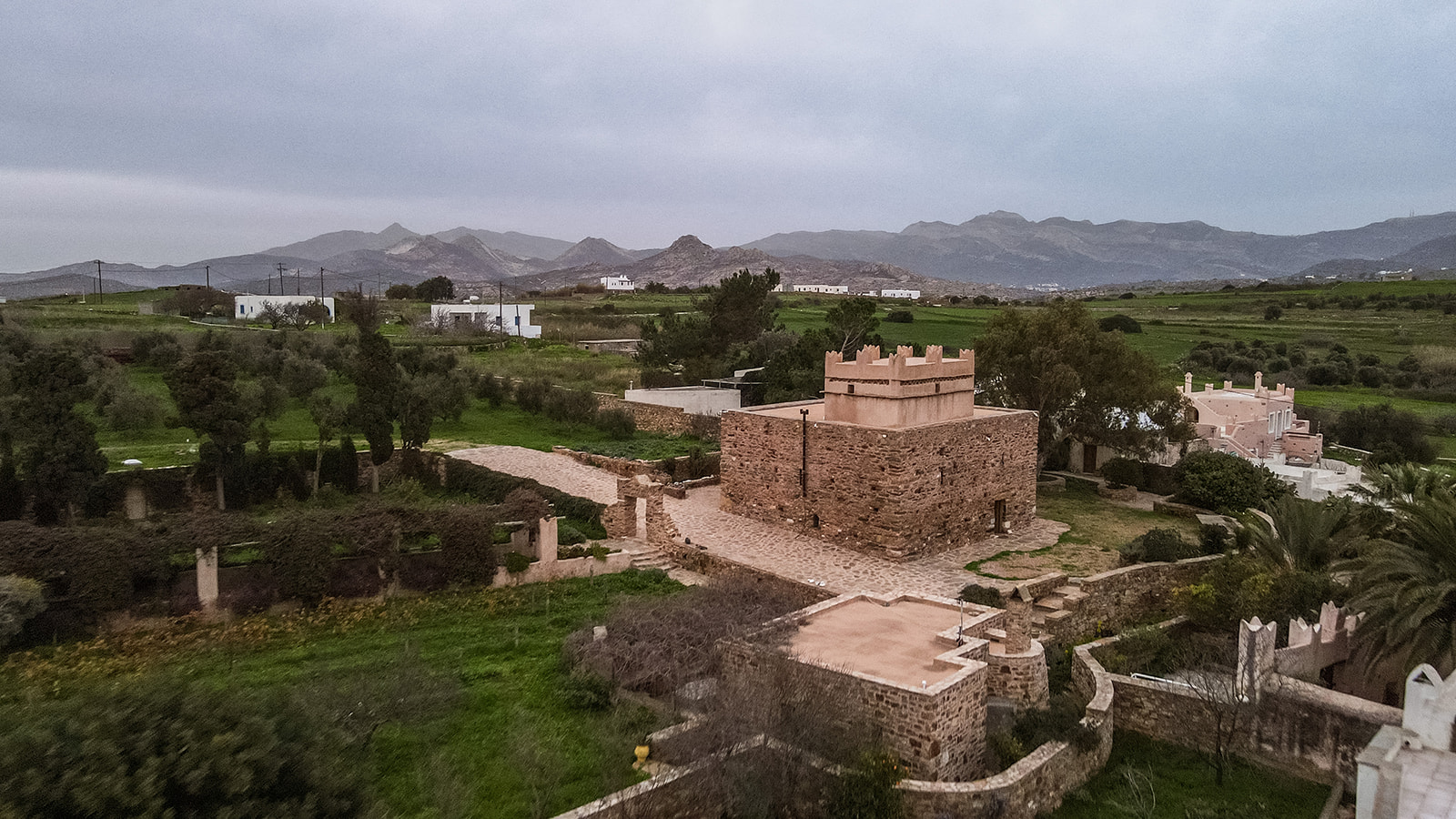 Επίκεντρο ο 600 ετών πύργος, με τις διάσπαρτες πολεμίστρες που πλέον αποτελούν τα παράθυρα της οικογενειακής κατοικίας, τον μεταγενέστερο περιστεριώνα στην οροφή, τους πάχους άνω του ενός μέτρου πέτρινους τοίχους και τους ημικυκλικούς θόλους εντός. Γύρω του, το βοηθητικό φουρνόσπιτο που διαμορφώθηκε σε ξενώνα, το ακόμη παλαιότερο λευκό εκκλησάκι του Αγίου Νικολάου του Tolentino και ένας παραδεισένιος κήπος με ψηλούς ευκαλύπτους που φιλοξενούν σπιτάκια για πουλιά, φραγκοσυκιές που θεριεύουν αλλά και δελεάζουν με τους καρπούς τους, θάμνους λουίζας και λεβάντας που συναγωνίζονται με τα αναζωογονητικά και χαλαρωτικά αρώματά τους, αθάνατους που σκαρφαλώνουν τους φράχτες, γιασεμιά, τριανταφυλλιές, παχύφυτα, βότανα κι ακόμη πιο πέρα ο οικογενειακός ελαιώνας και ο ιδιόκτητος αμπελώνας.