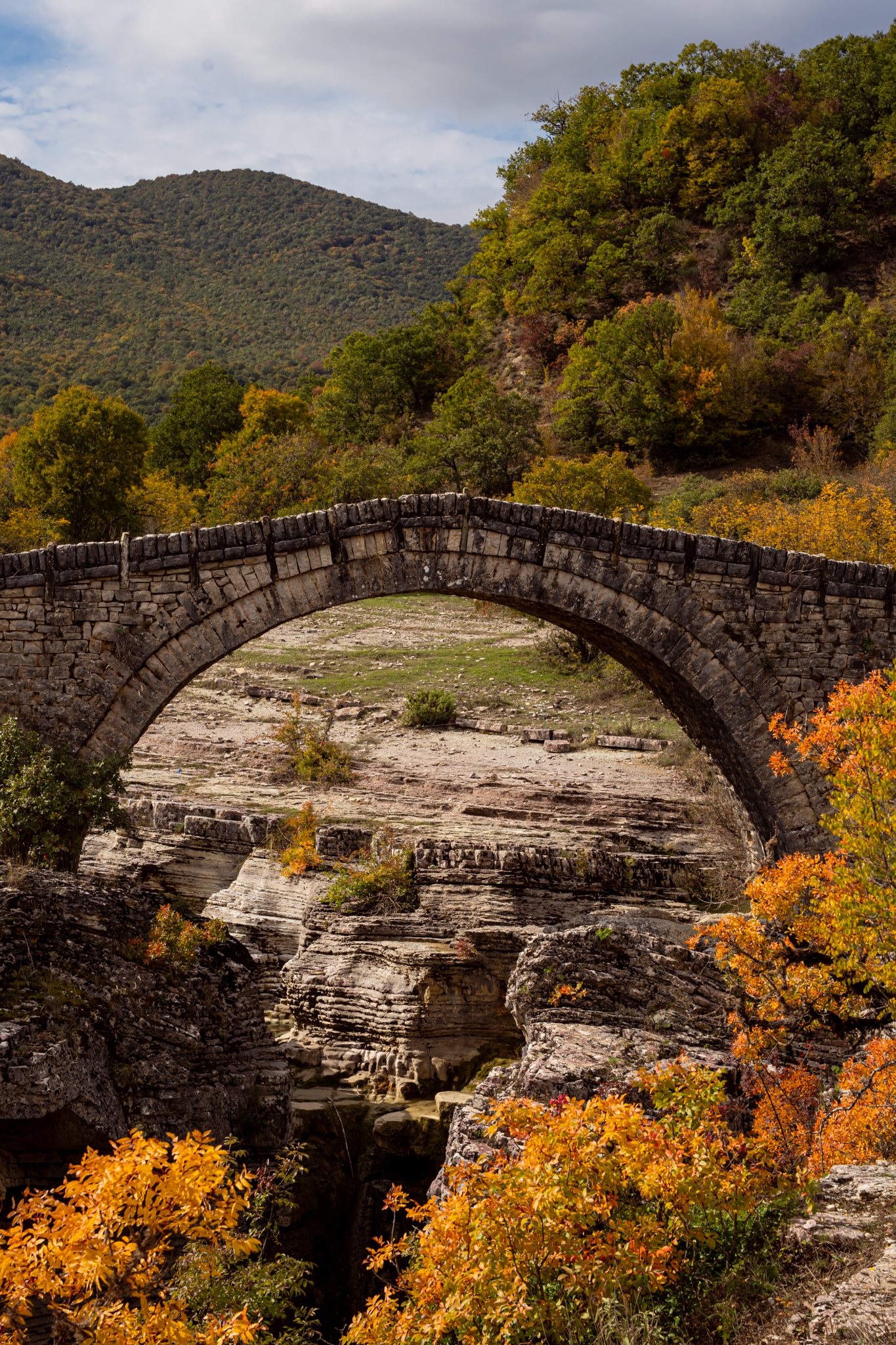 Αλλά το γεφύρι κρύβει ένα μυστικό: ο ποταμός Γορμός έχει και δεύτερο όνομα, Ξερόλακκος. Τον χειμώνα, ο καταρράκτης είναι θεαματικός, με τα νερά να σχηματίζουν τρεις φυσικές λίμνες, τις λεγόμενες «οβίρες». Σε περιόδους ανομβρίας, όμως, μπορεί να στερέψει εντελώς. Το γεφύρι είναι μεταμόρφωση: τον χειμώνα αγέρωχο πάνω από υδάτινο θέαμα, το καλοκαίρι σιωπηλή αψίδα πάνω από στεγνή χαράδρα.