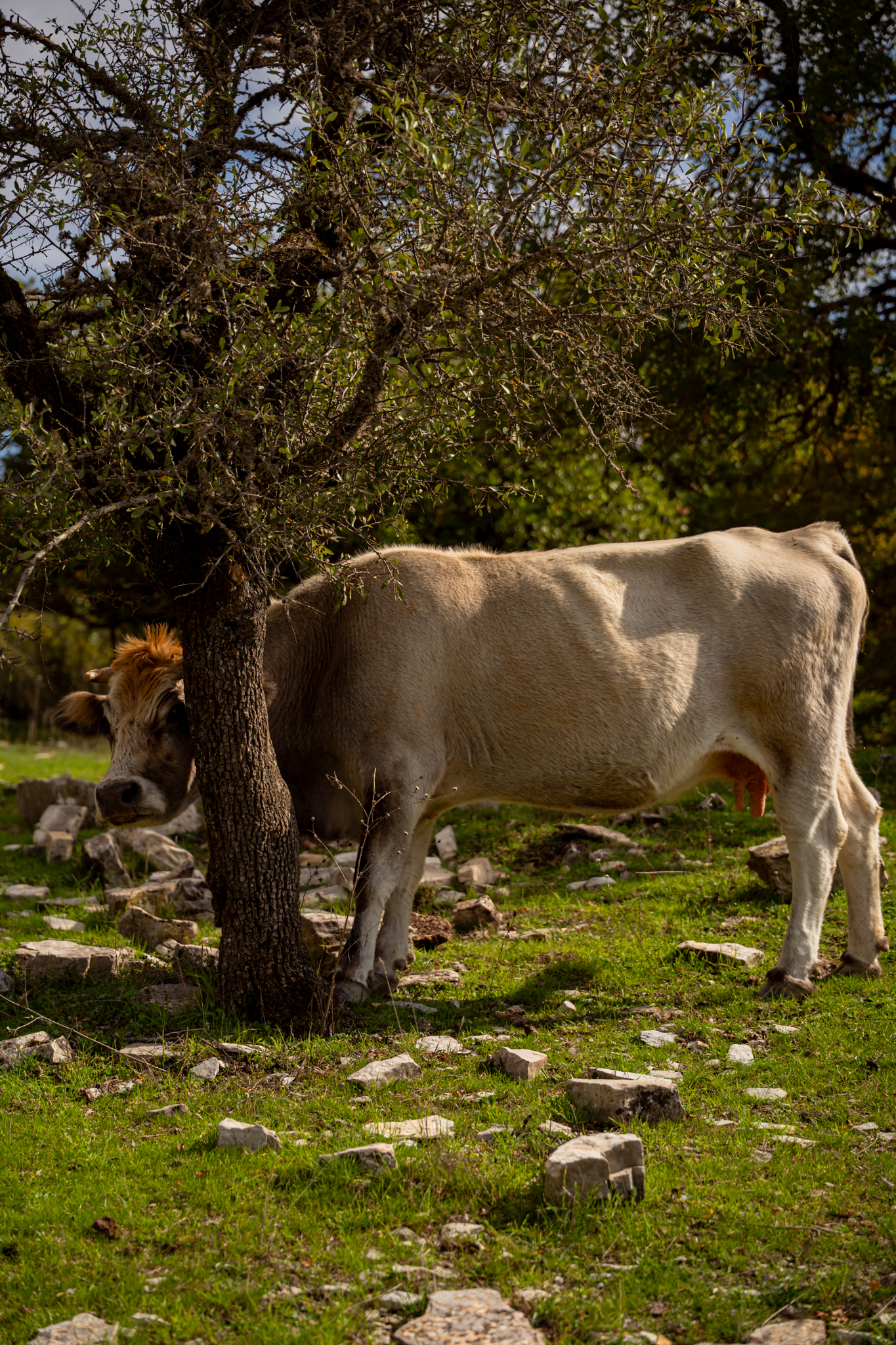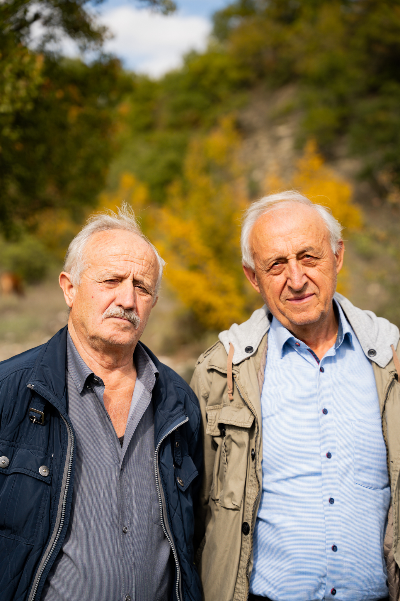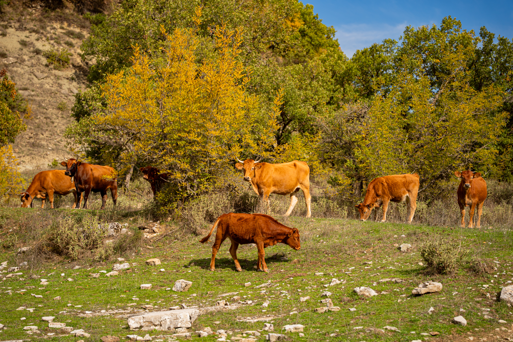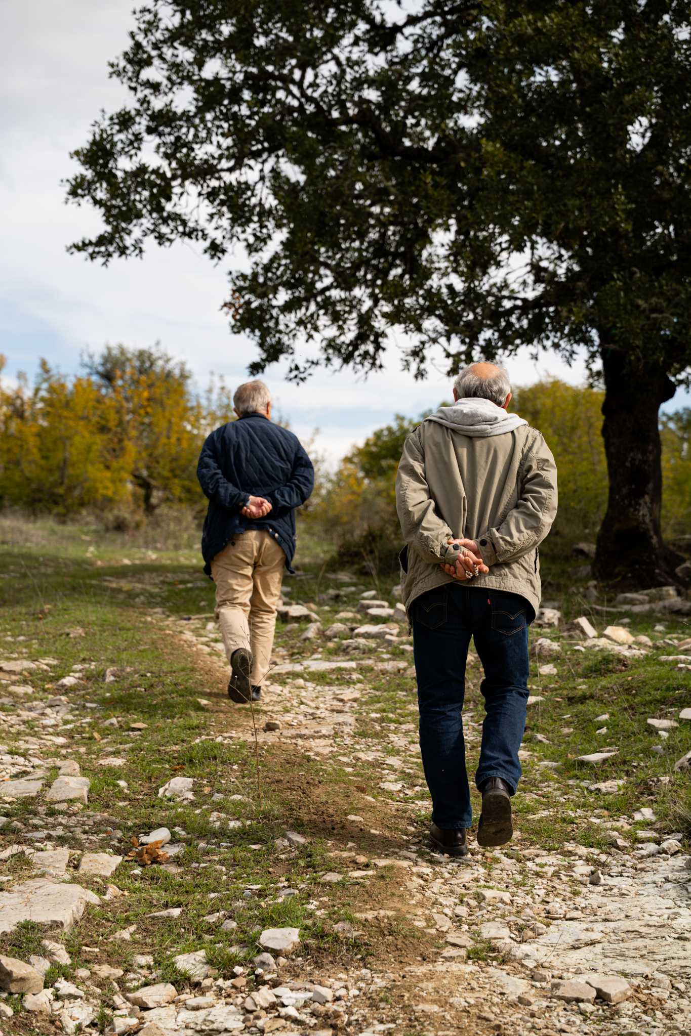 «Δεν ήρθε εδώ κανείς για χρόνια», μου λέει ο κ. Ανδρέας καθώς ξεκινάμε την πορεία των 3,5 χιλιομέτρων. «Ούτε καν οι περισσότεροι από μας, τους ντόπιους». Ο Παλαιόπυργος, παλιά Μέβδεζα, έχει λιγοστούς μόνιμους κατοίκους τον χειμώνα, μπορεί και κάτω από δέκα. Ο δρόμος βυθίζεται σε δάσος βελανιδιών που φαίνεται να μην το έχει αγγίξει χέρι ανθρώπου για δεκαετίες. Το φως του φθινοπώρου φιλτράρεται μέσα από τα φυλλώματα, χρωματίζοντας το έδαφος με χάλκινες αποχρώσεις. Η ύλη της γης, πεσμένα φύλλα, βελανίδια, κλαδιά, σχηματίζει ένα πυκνό χαλί που απορροφά κάθε ήχο. Μετά από είκοσι λεπτά, ο δρόμος στενεύει. Το δάσος πυκνώνει. Και τότε ακούγονται τα κουδούνια, πρώτα μακρινά, μετά πιο δυνατά. Στη στροφή εμφανίζεται ο κτηνοτρόφος με το κοπάδι του. Πρόβατα και κατσίκες κινούνται σε αργό ρυθμό, βόσκοντας. Ελεύθερα μοσχάρια βόσκουν αμέριμνα. Η οσμή του κοπαδιού αναμειγνύεται με τη μυρωδιά της υγρής γης και του βρύου.
