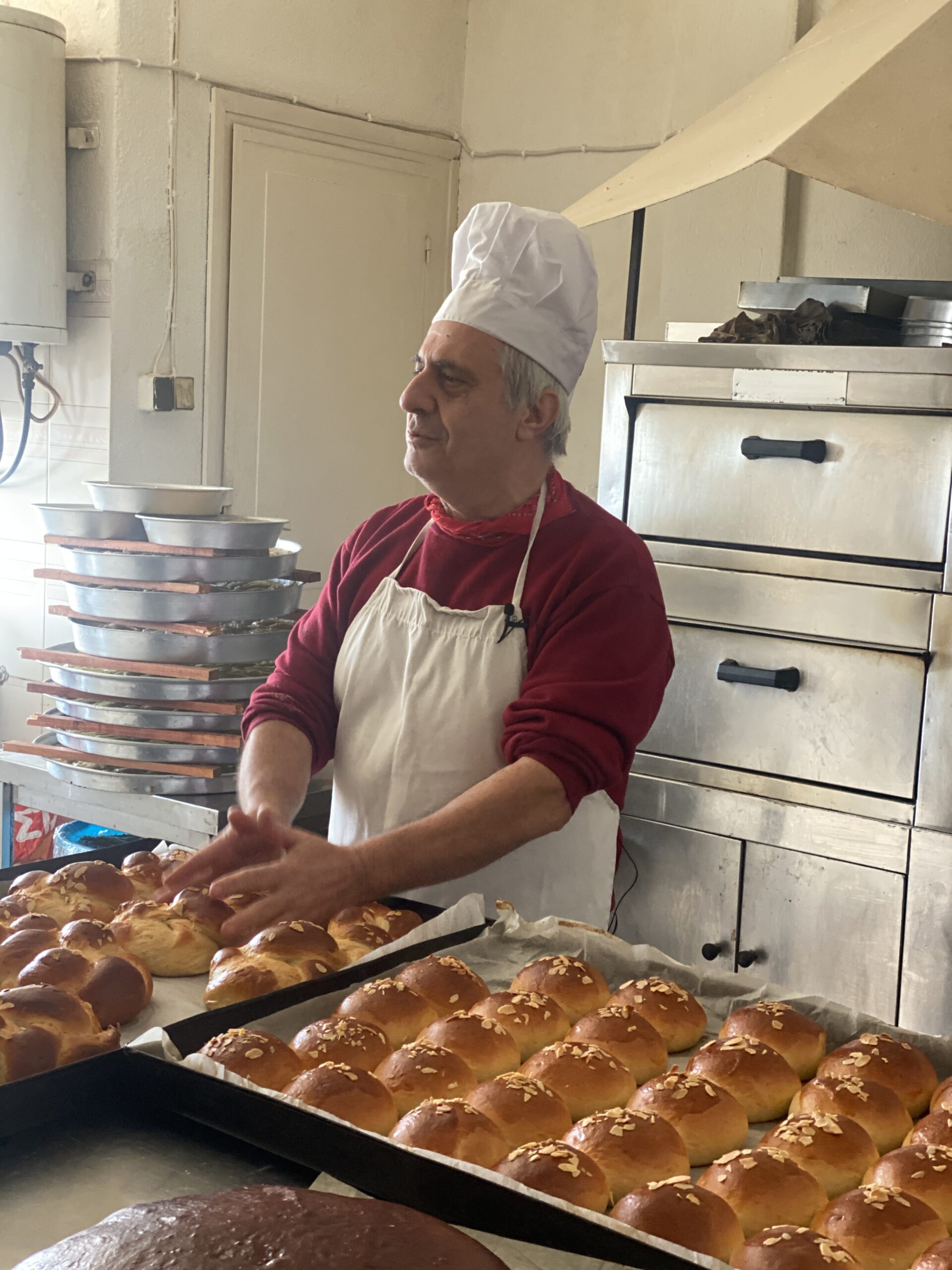 Ο Αντώνης, ήρεμος, μεθοδικός και ευγενής, όσο τυλίγει το φύλλο για ένα ταψάκι χανούμ μπουρέκ, μου μιλά για την διαδρομή του. Από οικογένεια προσφύγων και με γιαγιά Κωνσταντινουπολίτισσα, έμαθε την τέχνη του ζαχαροπλάστη στη Θεσσαλονίκη. Εδώ και 26 χρόνια, διατηρεί αυτό το μαγαζί στην πλατεία του χωριού, δεν σταματά στιγμή να πειραματίζεται και να τρατάρει τους επισκέπτες του χωριού με γλυκά γεμάτα με αγάπη. Φεύγω από το μαγαζί με τη μυρωδιά του φρέσκου βούτυρου και της καραμέλας να με κατακλύζει.