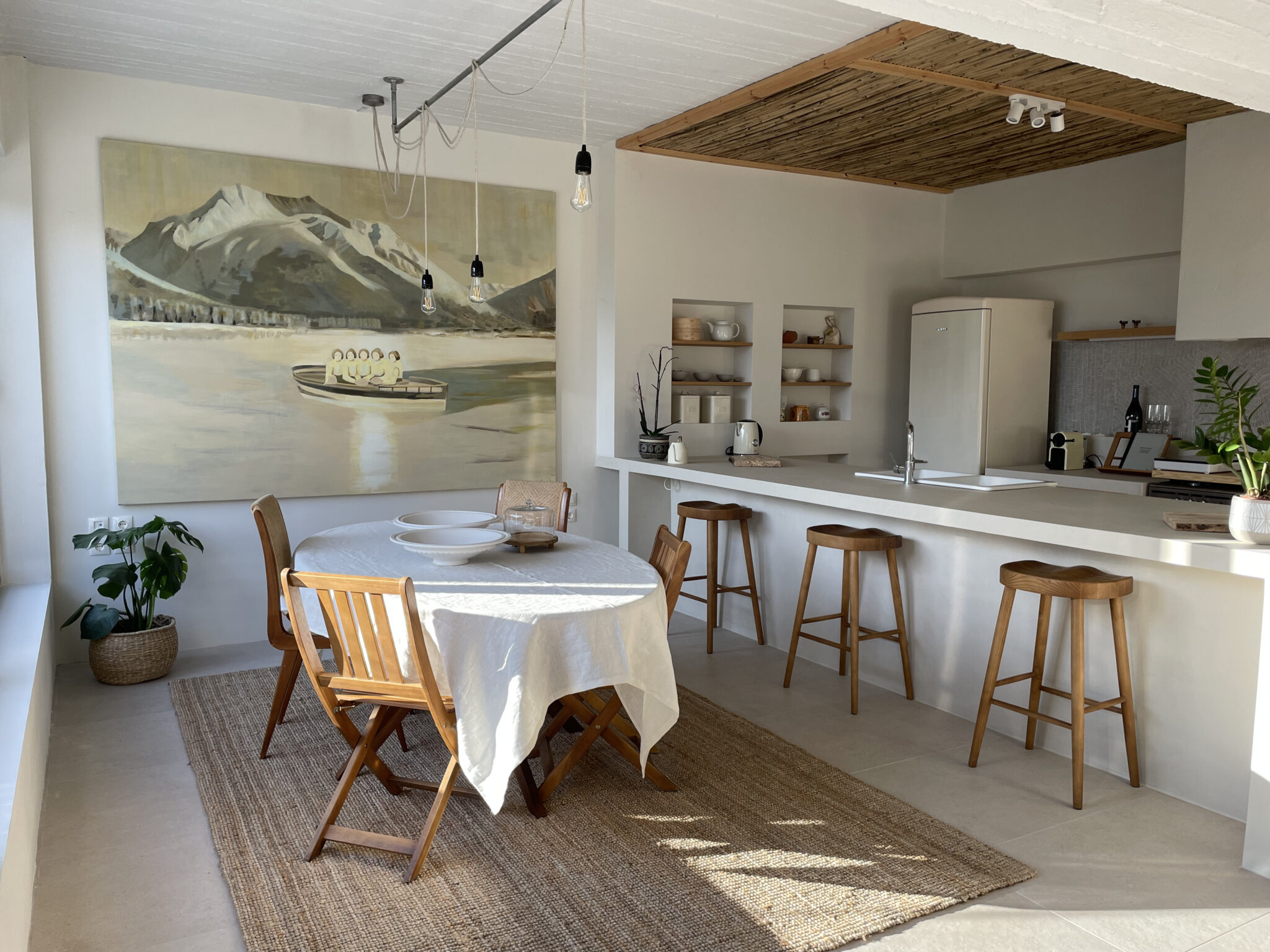 Ένα από τα μηχανήματα, η κορδέλα του ξυλουργείου, έχει συντηρηθεί και παρέμεινε στο χώρο. Τη λιτή διακόσμηση του σπιτιού συμπληρώνουν εντυπωσιακά έργα τέχνης αναγνωρισμένων καλλιτεχνών. Στην τραπεζαρία κυριαρχεί ένας συγκλονιστικός πίνακας της Χριστίνας Κάλμπαρη. Ένα διάφανο γλυπτό του Ingbert Brunk, κάνει παιχνίδια με το φως, ενώ τα κεραμικά του Στέλιου Γκίκα, ψιθυρίζουν ιστορίες εμπνευσμένες από το Βυζάντιο. Ένας χώρος ζεστός, όπου φτιάχτηκε για να ζουν οι άνθρωποι όμορφες στιγμές.
