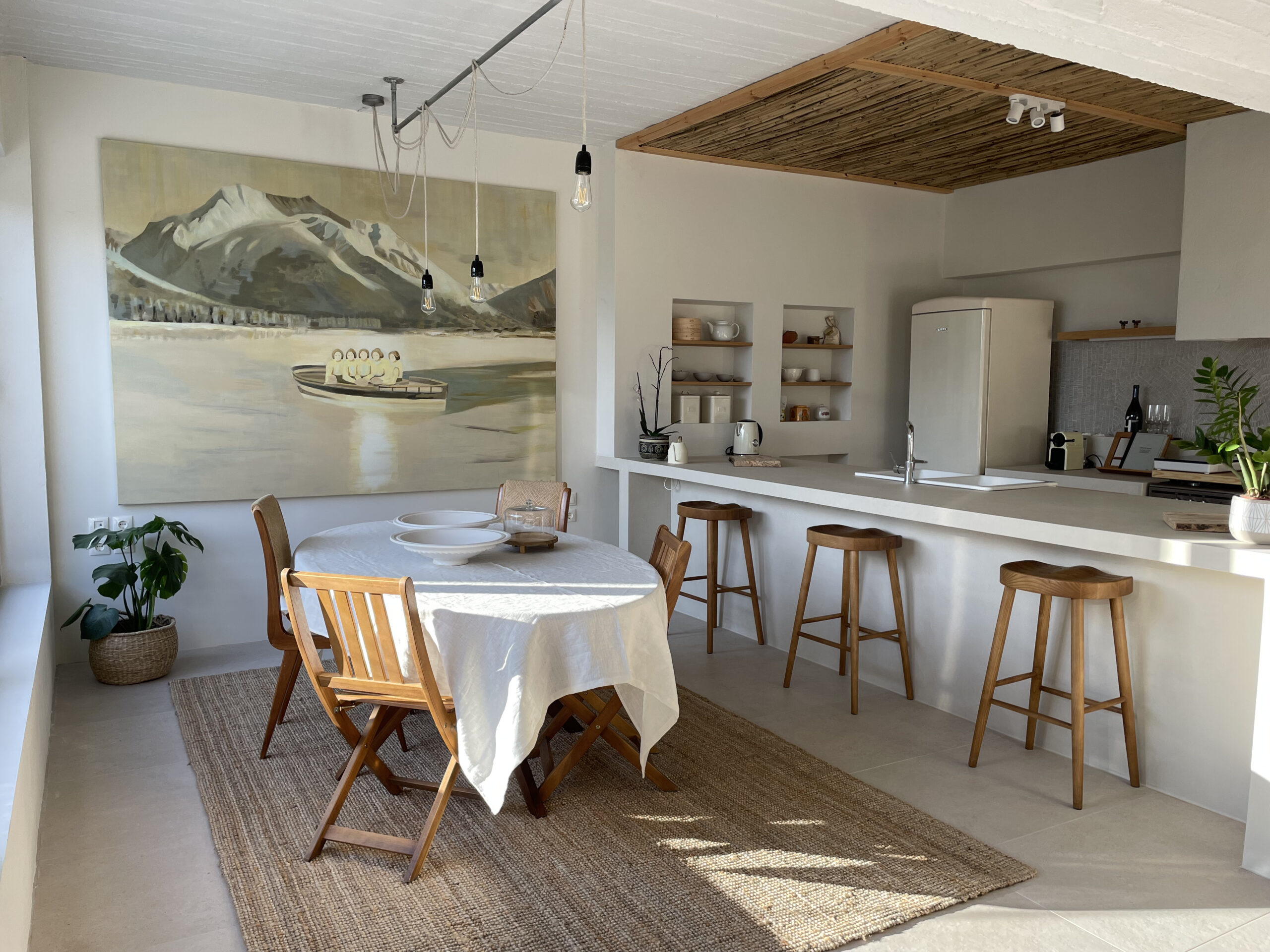 Ένα από τα μηχανήματα, η κορδέλα του ξυλουργείου, έχει συντηρηθεί και παρέμεινε στο χώρο. Τη λιτή διακόσμηση του σπιτιού συμπληρώνουν εντυπωσιακά έργα τέχνης αναγνωρισμένων καλλιτεχνών. Στην τραπεζαρία κυριαρχεί ένας συγκλονιστικός πίνακας της Χριστίνας Κάλμπαρη. Ένα διάφανο γλυπτό του Ingbert Brunk, κάνει παιχνίδια με το φως, ενώ τα κεραμικά του Στέλιου Γκίκα, ψιθυρίζουν ιστορίες εμπνευσμένες από το Βυζάντιο. Ένας χώρος ζεστός, όπου φτιάχτηκε για να ζουν οι άνθρωποι όμορφες στιγμές.