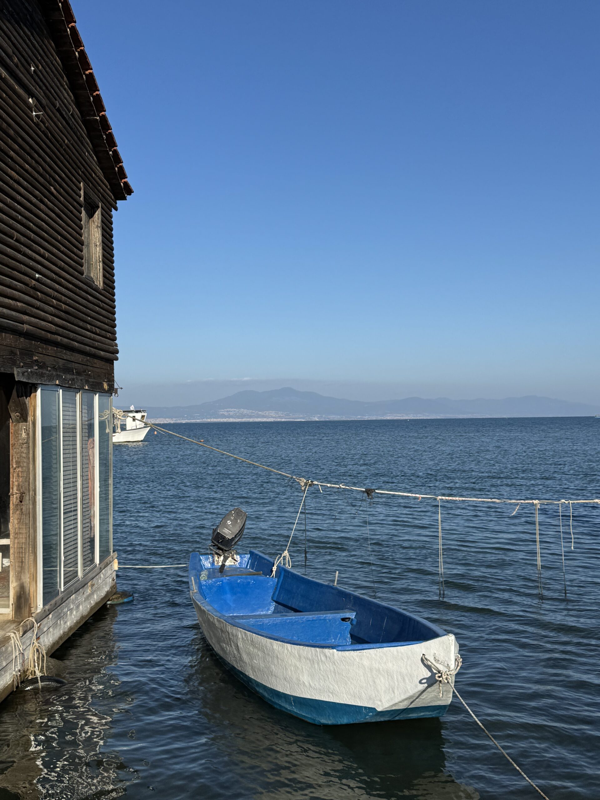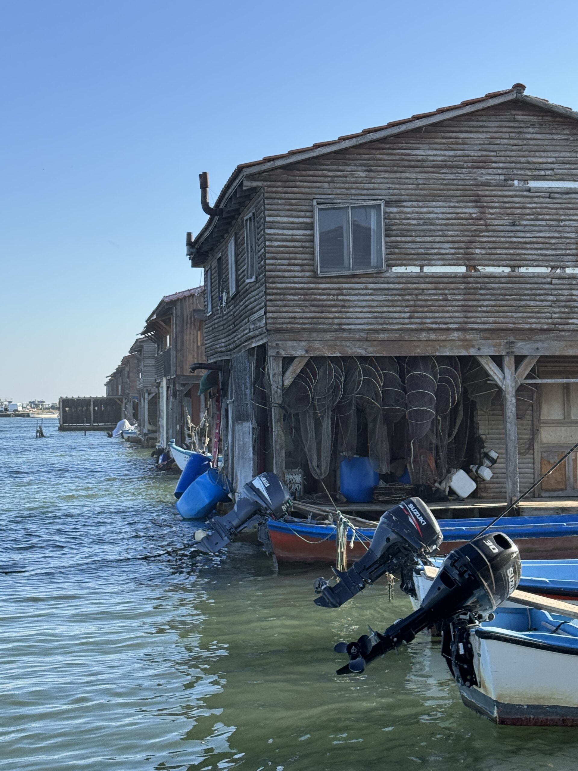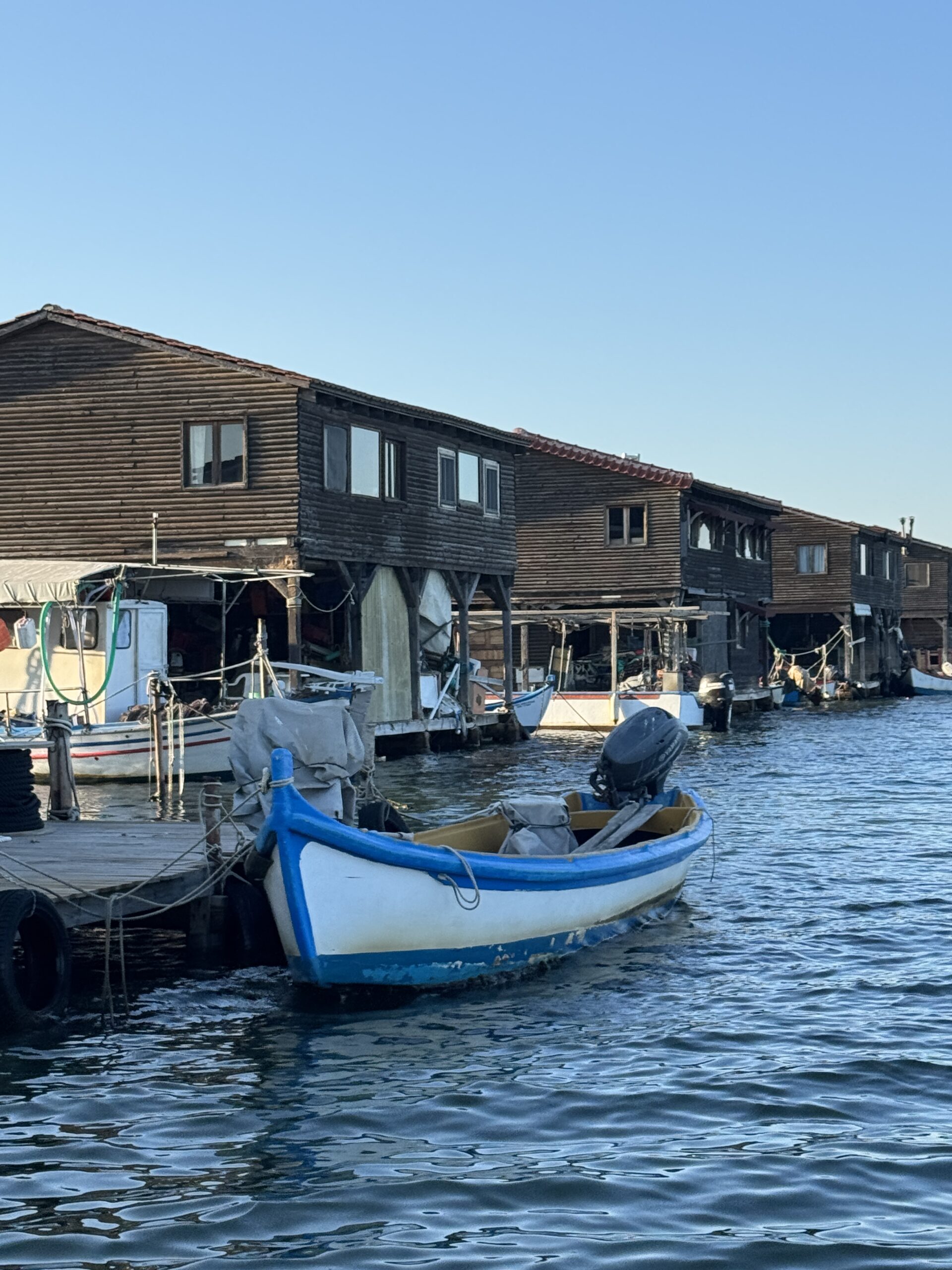 Αφήνοντας πίσω μας τους ορυζώνες, κατευθυνθήκαμε προς τις ξύλινες καλύβες που στέκονται αγέρωχες στις όχθες του Θερμαϊκού, κοντά στο Δέλτα του Αξιού. Η περιοχή, αν και λιγότερο γνωστή στους τουρίστες, κρύβει μοναδικές εκπλήξεις για όσους τολμούν να την εξερευνήσουν. Το θέαμα που αντικρίσαμε ήταν μαγευτικό: ξύλινα σπιτάκια που έμοιαζαν να ξεφυτρώνουν μέσα από το νερό, μικρές αποβάθρες με πασσάλους μπηγμένους στον πυθμένα της θάλασσας, και όμορφα καΐκια που λικνίζονταν με χάρη. Ήταν σαν να βρεθήκαμε ξαφνικά σε ένα σκηνικό που συνδύαζε στοιχεία από την Ασία και τα Βαλκάνια, δημιουργώντας ένα πρωτόγνωρο τοπίο μια ανάσα από τη Θεσσαλονίκη.