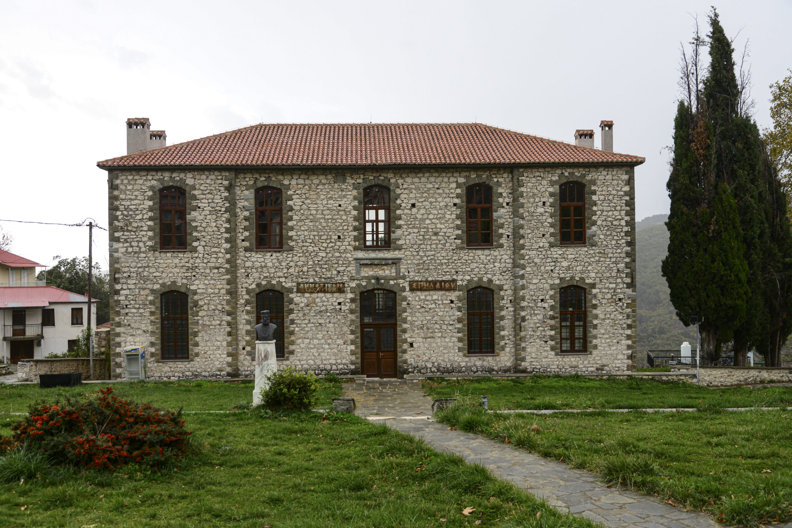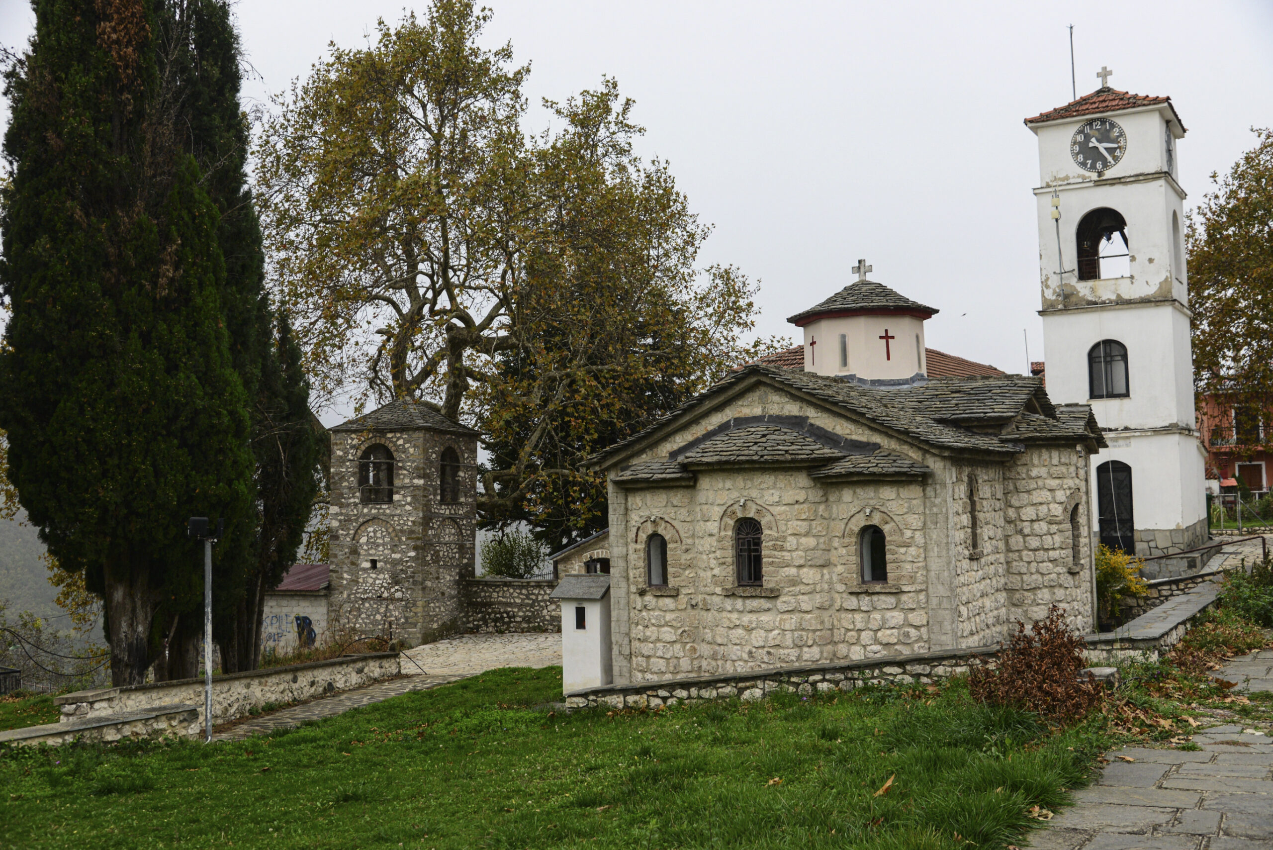 Φθάνουμε στον οικισμό του Σπηλαίου, στα σχεδόν 1000 μέτρα υψόμετρο. Έχει ξεκινήσει να ψιχαλίζει αλλά προς το παρόν τουλάχιστον μπορούμε να περπατήσουμε στο χωριό. Περνάμε έξω από το πετρόκτιστο διώροφο Δημοτικό Σχολείο, το οποίο κατασκευάστηκε στις αρχές της δεκαετίας του ’30, και σταμάτησε τη λειτουργία του το 1997, ενώ λίγο πιο κάτω βρίσκεται η εκκλησία του Αγίου Αθανασίου, η οποία κατασκευάστηκε το 1804, και μάλιστα, όπως λέγεται, με χρηματοδότηση από τη σύζυγό του γραμματέα του Αλή Πασά. Δίπλα στην ιστορική αυτή εκκλησία υπάρχει μία άλλη μικρότερη, των Αρχαγγέλων, η οποία κατασκευάστηκε το 1961.